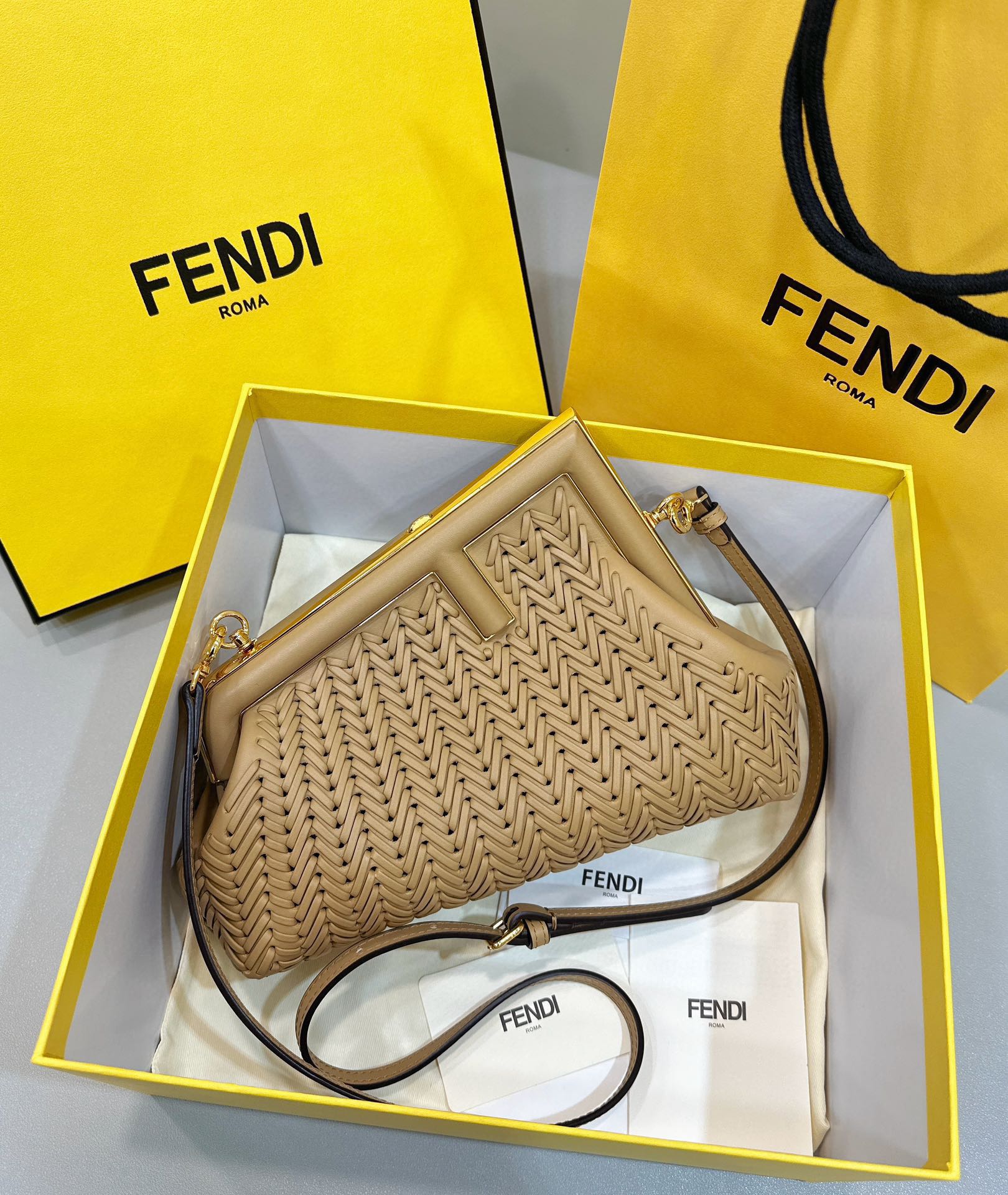 这款包包是AAAAA 1:1 质量 (非常棒). 使用了和原版一模一样的材料. 商标部分也保持了和芬迪/Fendi一样. 图片拍摄是实物包包拍摄, 您所收到的实物保证和我们图片一模一样.