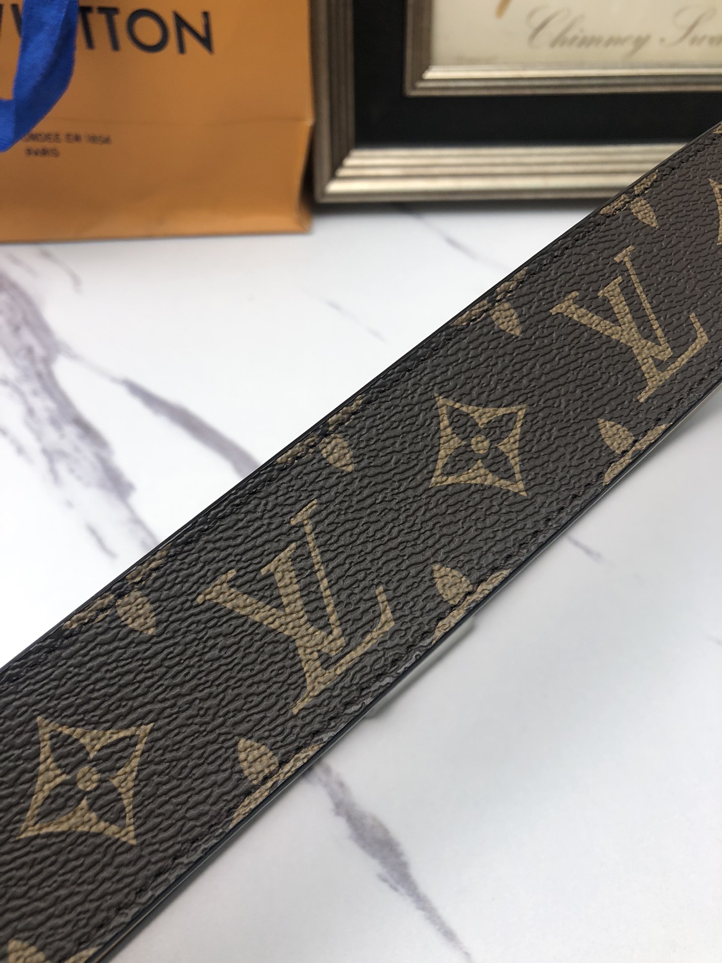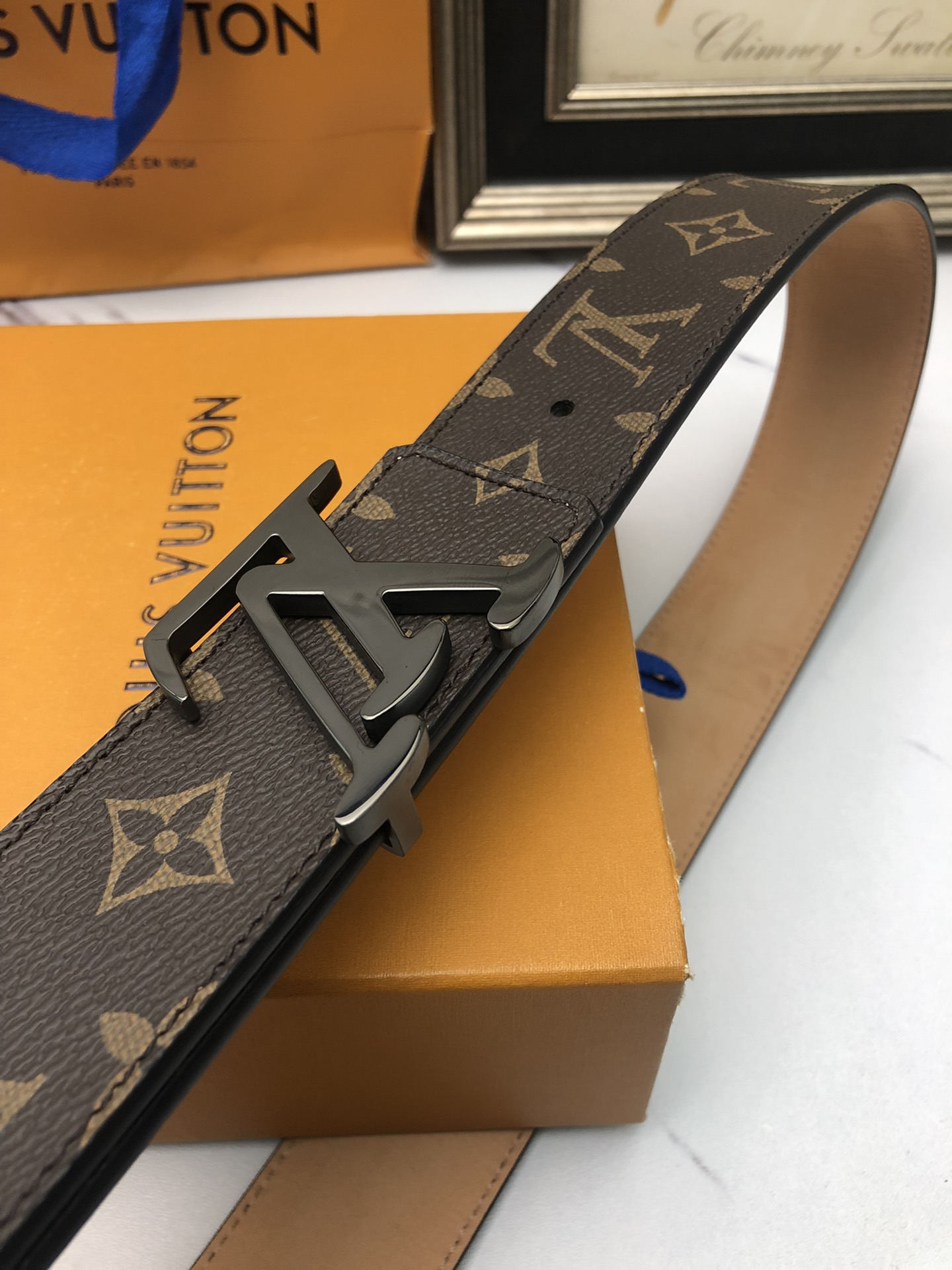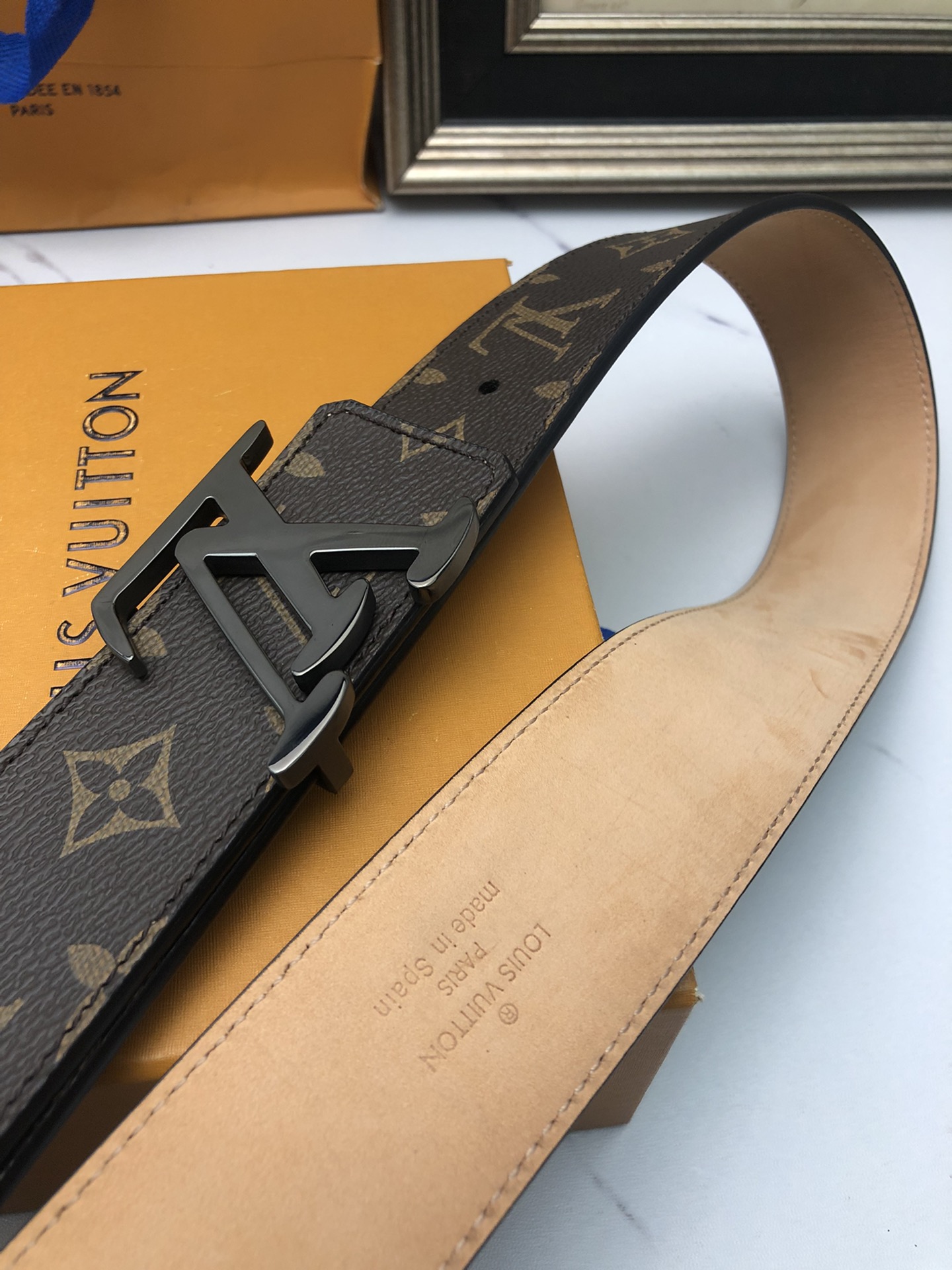 这款皮带是AAAAA 1:1 质量 (非常棒). 使用了和原版一模一样的材料. 商标部分也保持了和路易威登/Louis Vuitton一样. 图片拍摄是实物皮带拍摄, 您所收到的实物保证和我们图片一模一样.