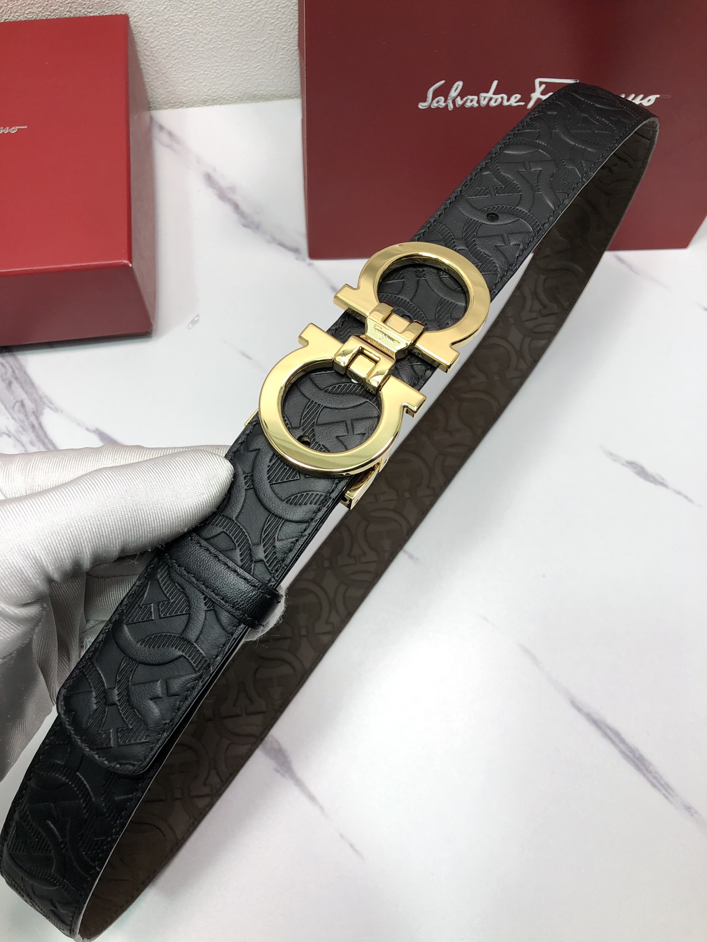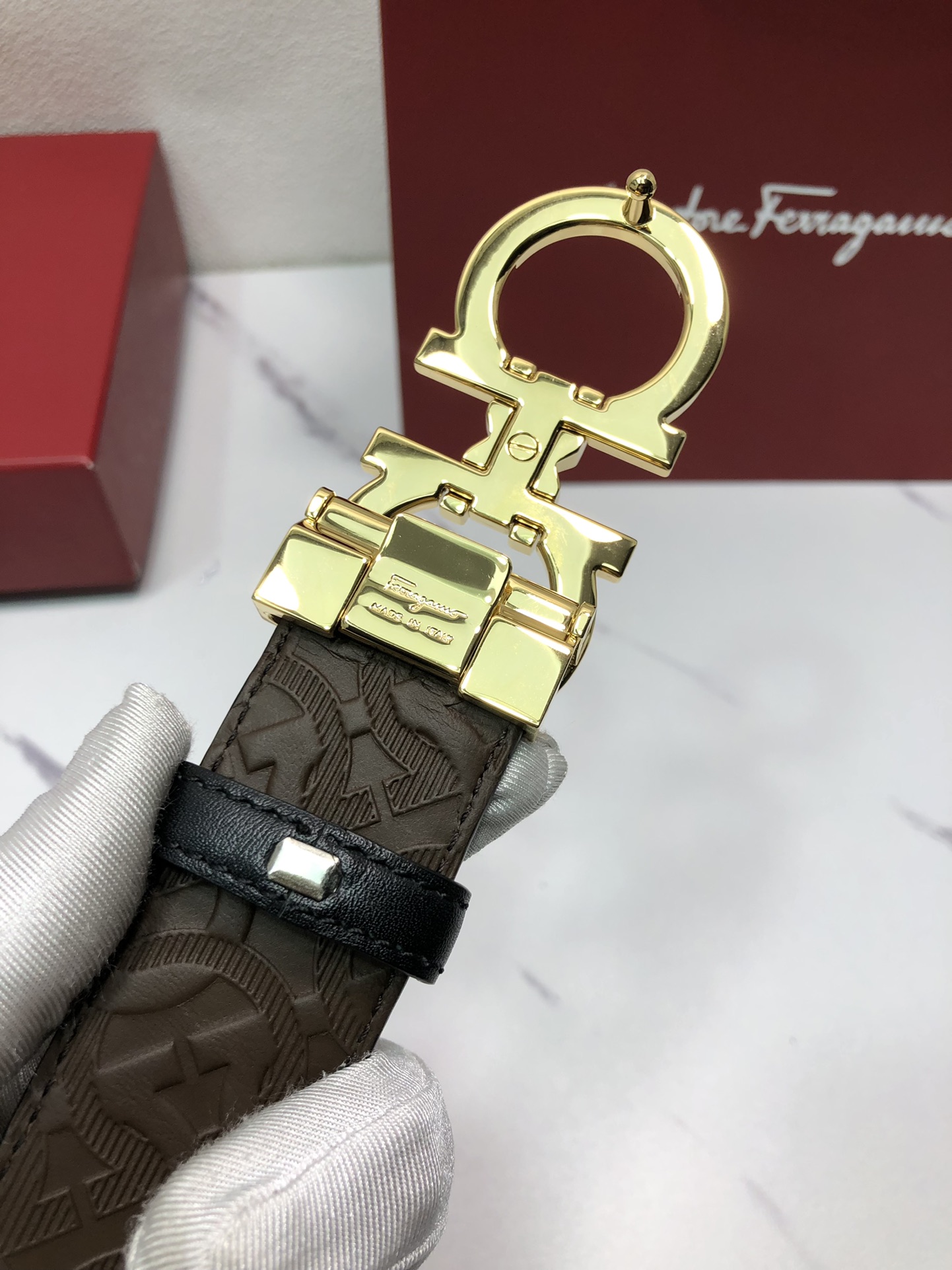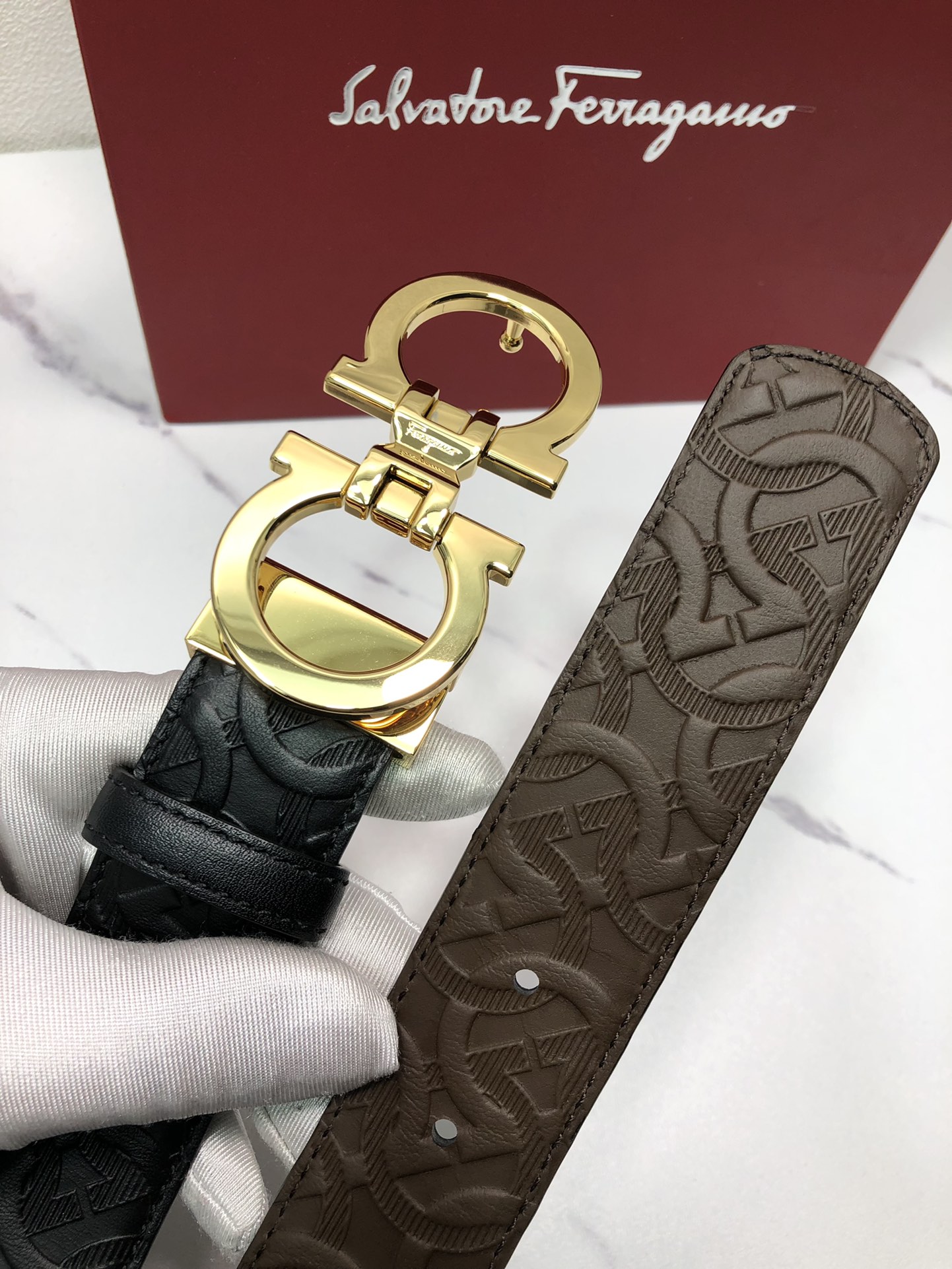 这款皮带是AAAAA 1:1 质量 (非常棒). 使用了和原版一模一样的材料. 商标部分也保持了和菲拉格慕/Salvatore Ferragamo一样. 图片拍摄是实物皮带拍摄, 您所收到的实物保证和我们图片一模一样.