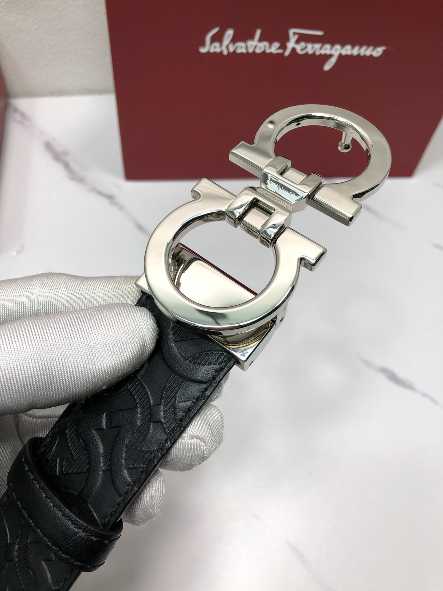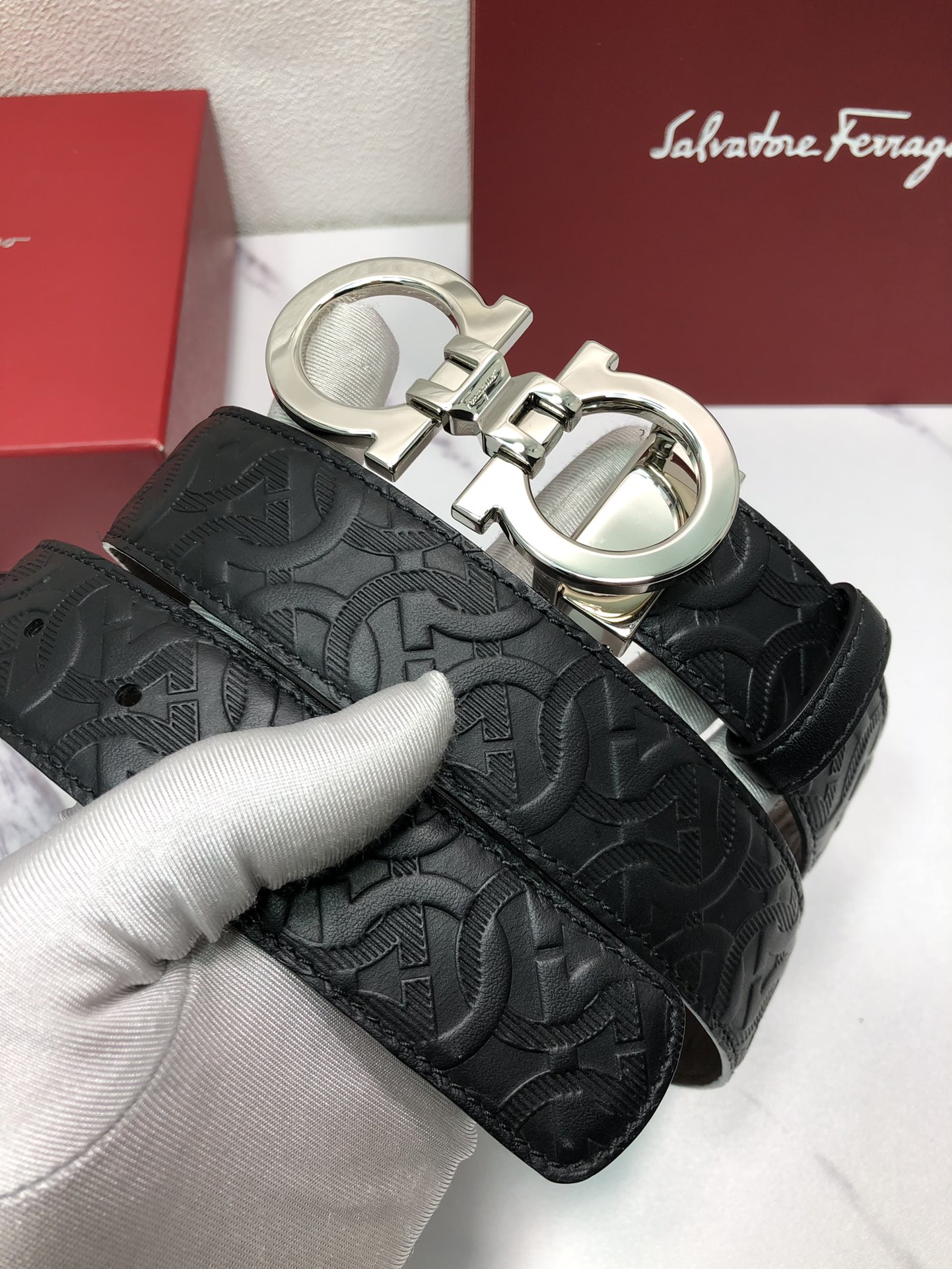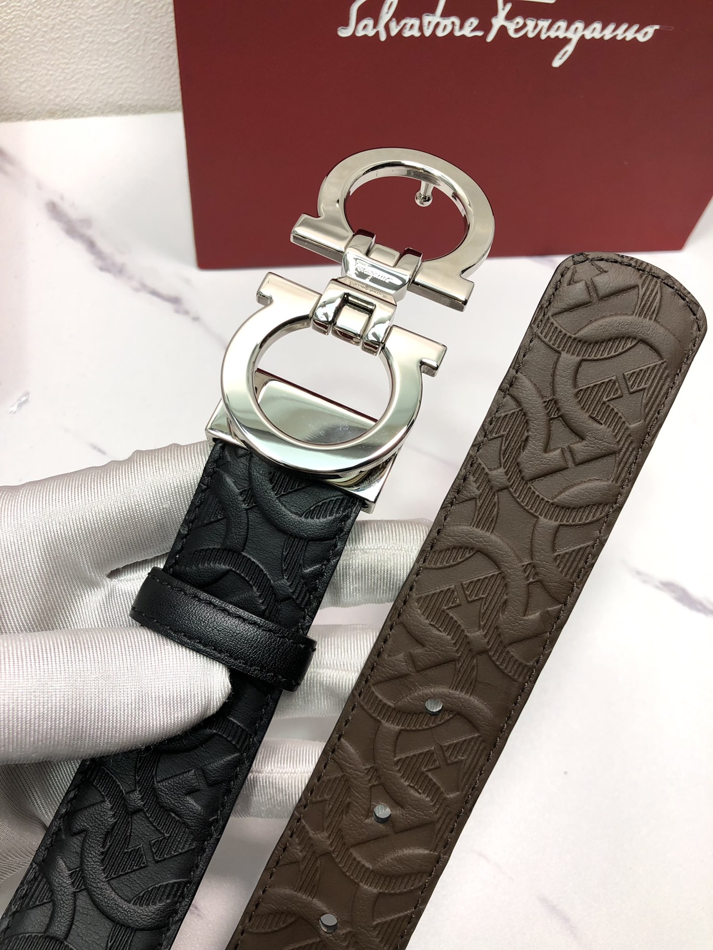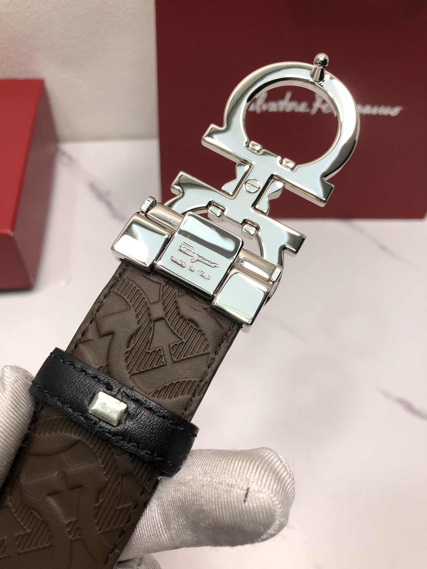 这款皮带是AAAAA 1:1 质量 (非常棒). 使用了和原版一模一样的材料. 商标部分也保持了和菲拉格慕/Salvatore Ferragamo一样. 图片拍摄是实物皮带拍摄, 您所收到的实物保证和我们图片一模一样.
