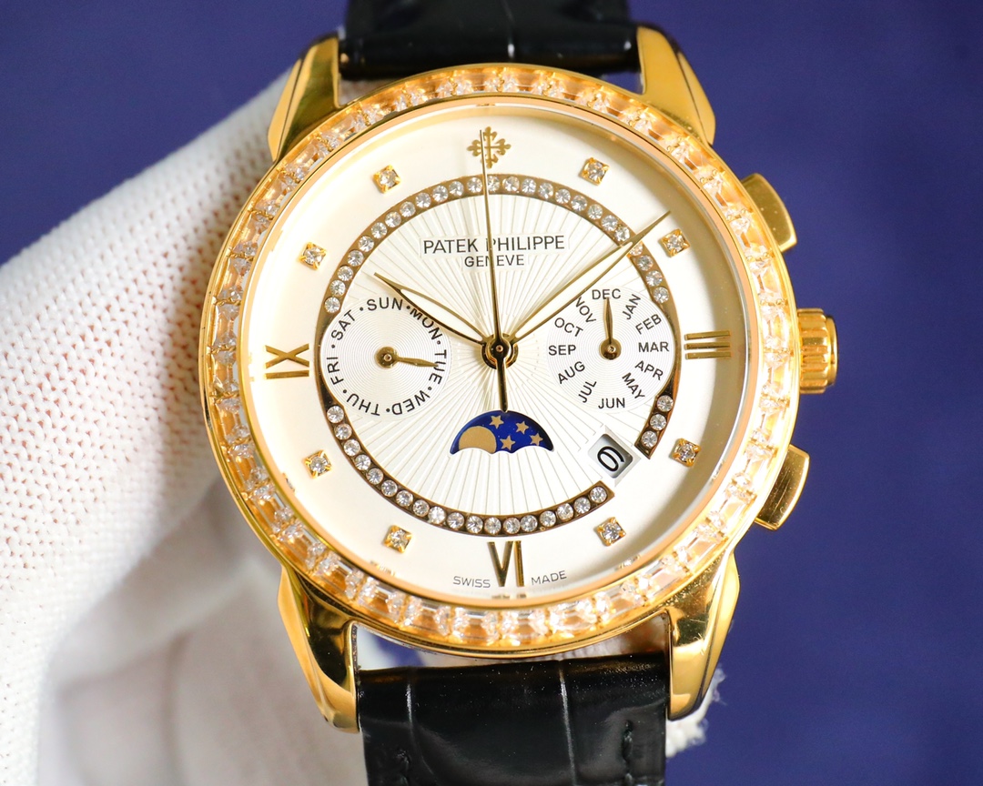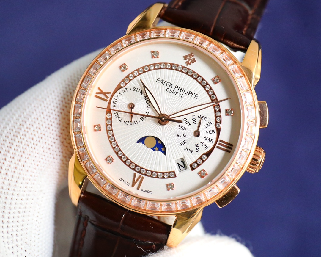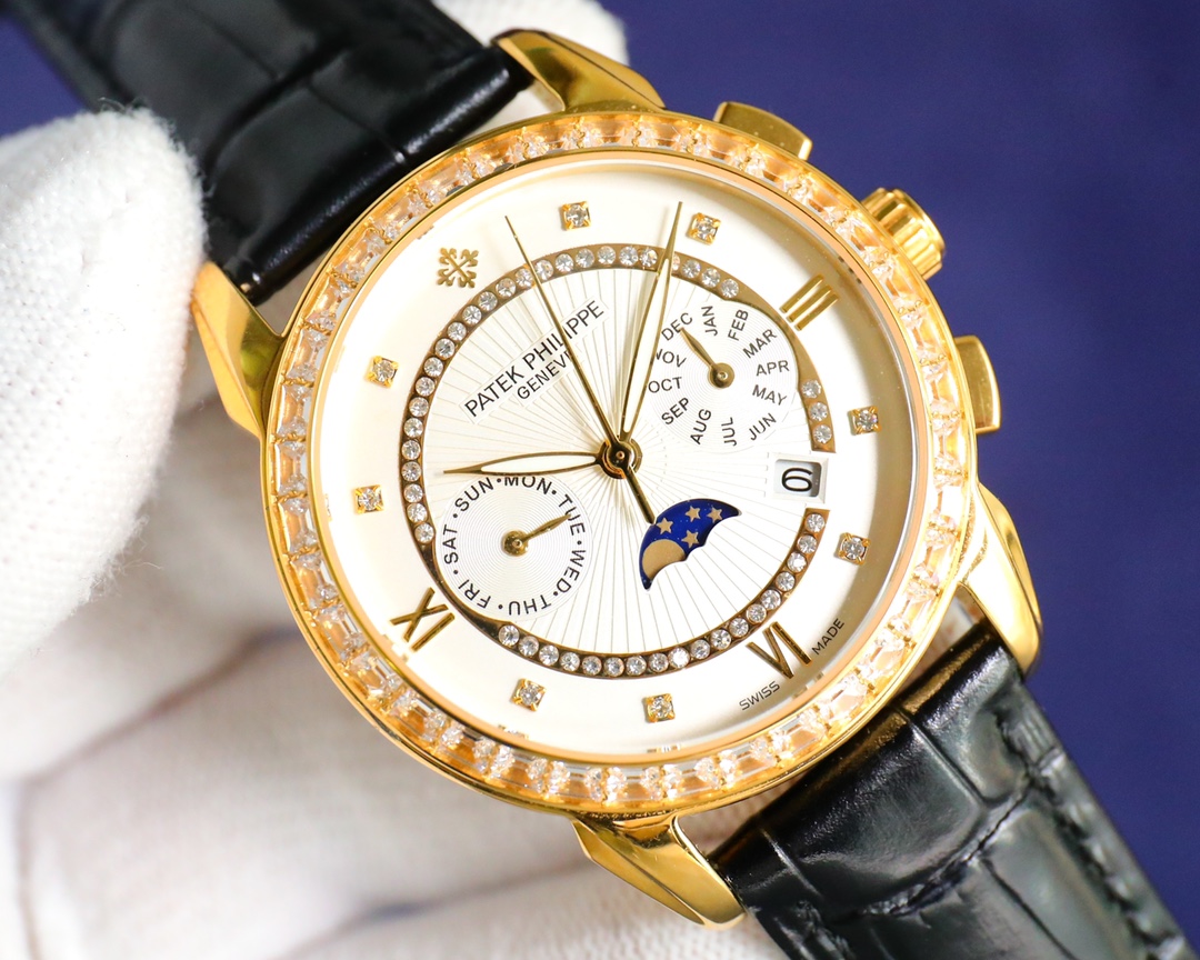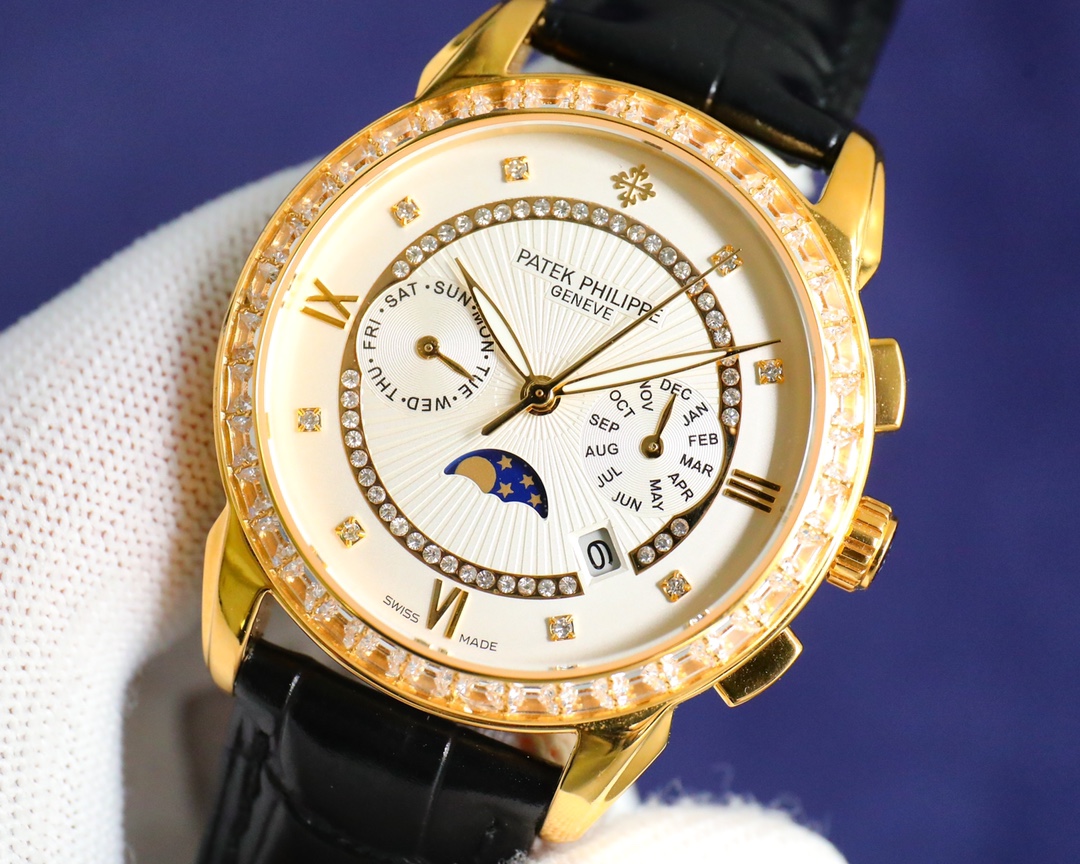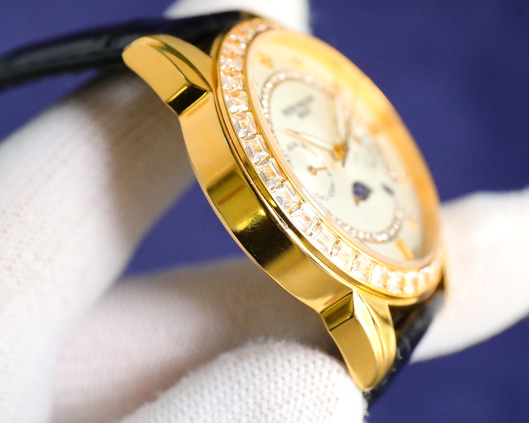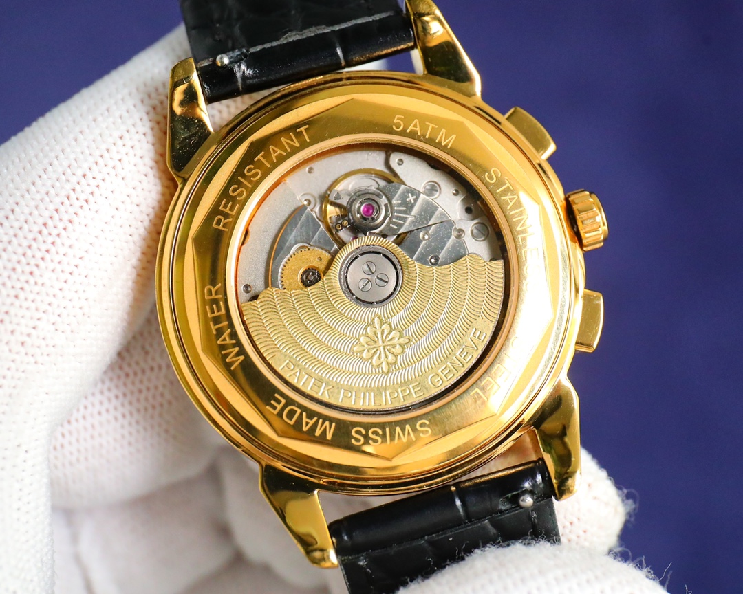 这款手表是AAAAA 1:1 质量 (非常棒). 使用了和原版一模一样的材料. 商标部分也保持了和百达翡丽/Patek Philippe一样. 图片拍摄是实物手表拍摄, 您所收到的实物保证和我们图片一模一样.