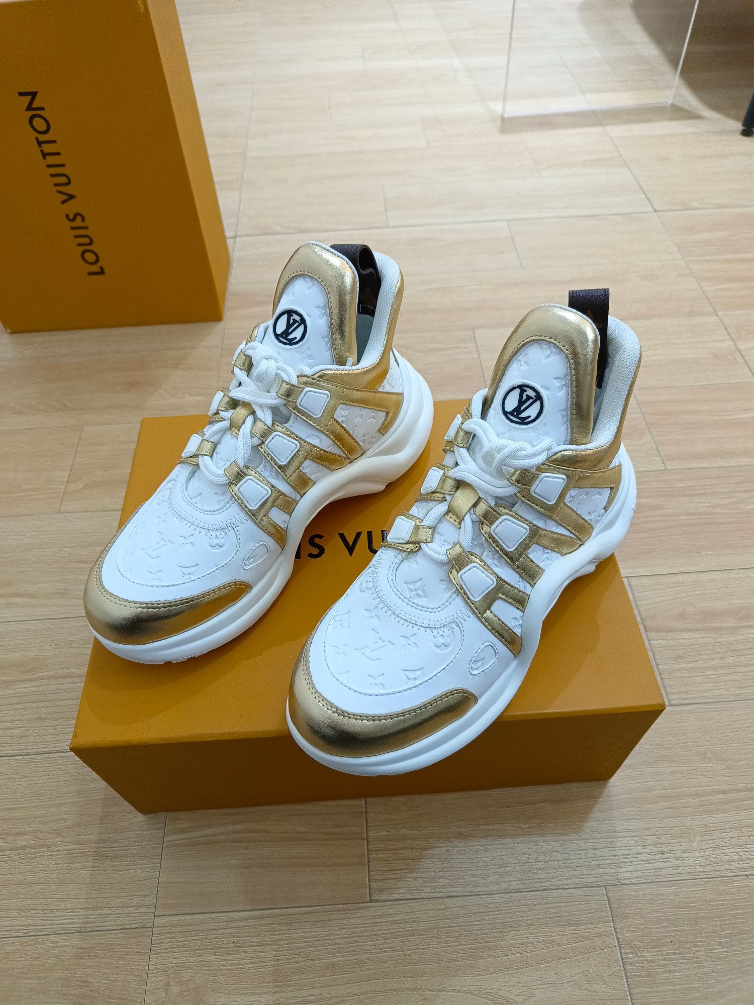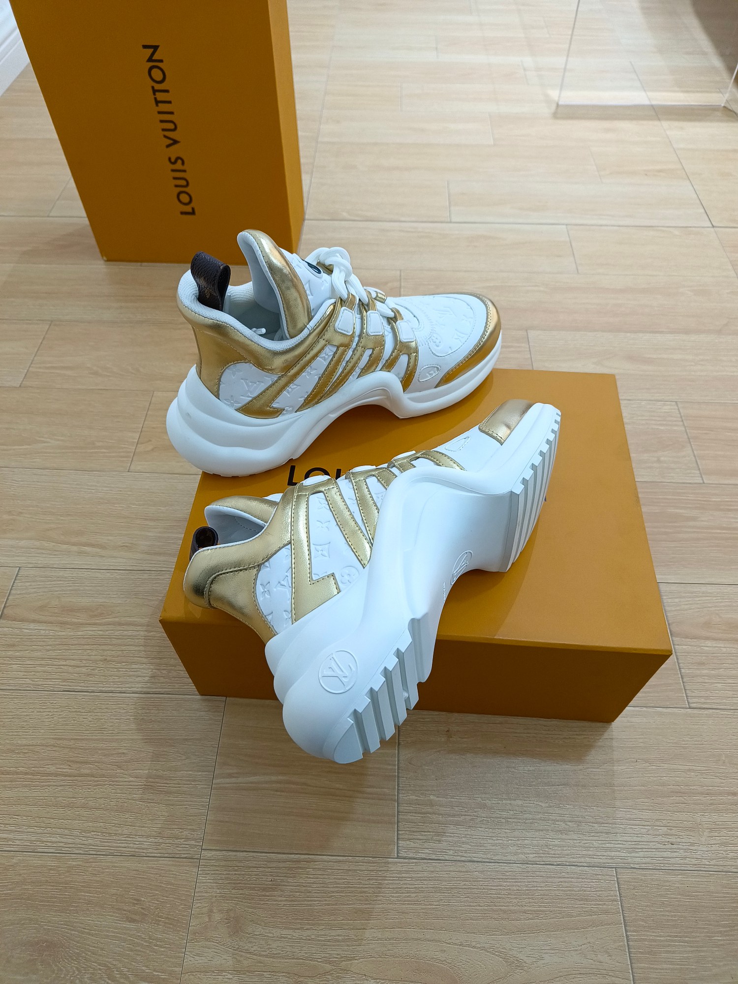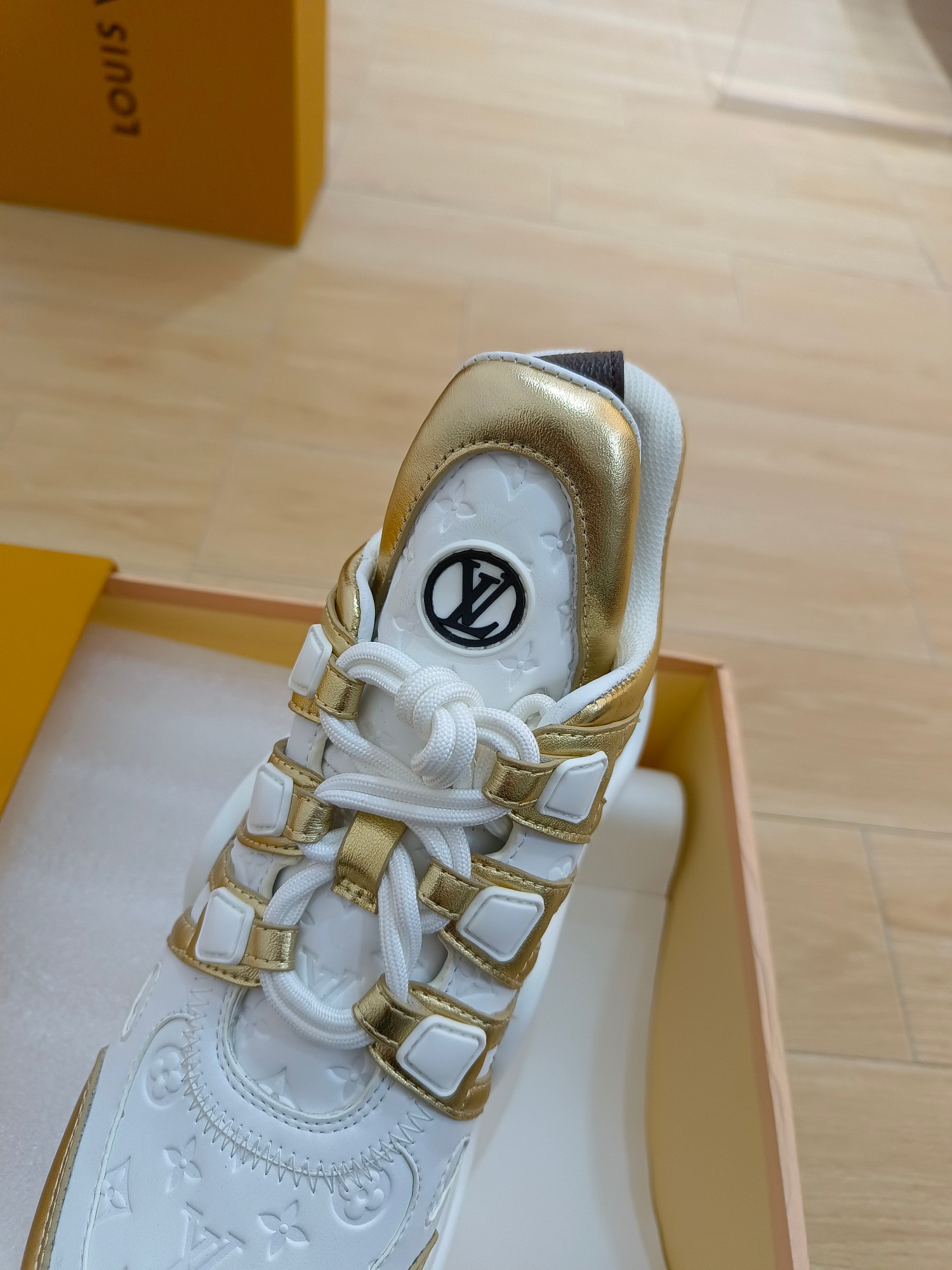 这款鞋子是AAAAA 1:1 质量 (非常棒). 使用了和原版一模一样的材料. 商标部分也保持了和路易威登/Louis Vuitton一样. 图片拍摄是实物鞋子拍摄, 您所收到的实物保证和我们图片一模一样.