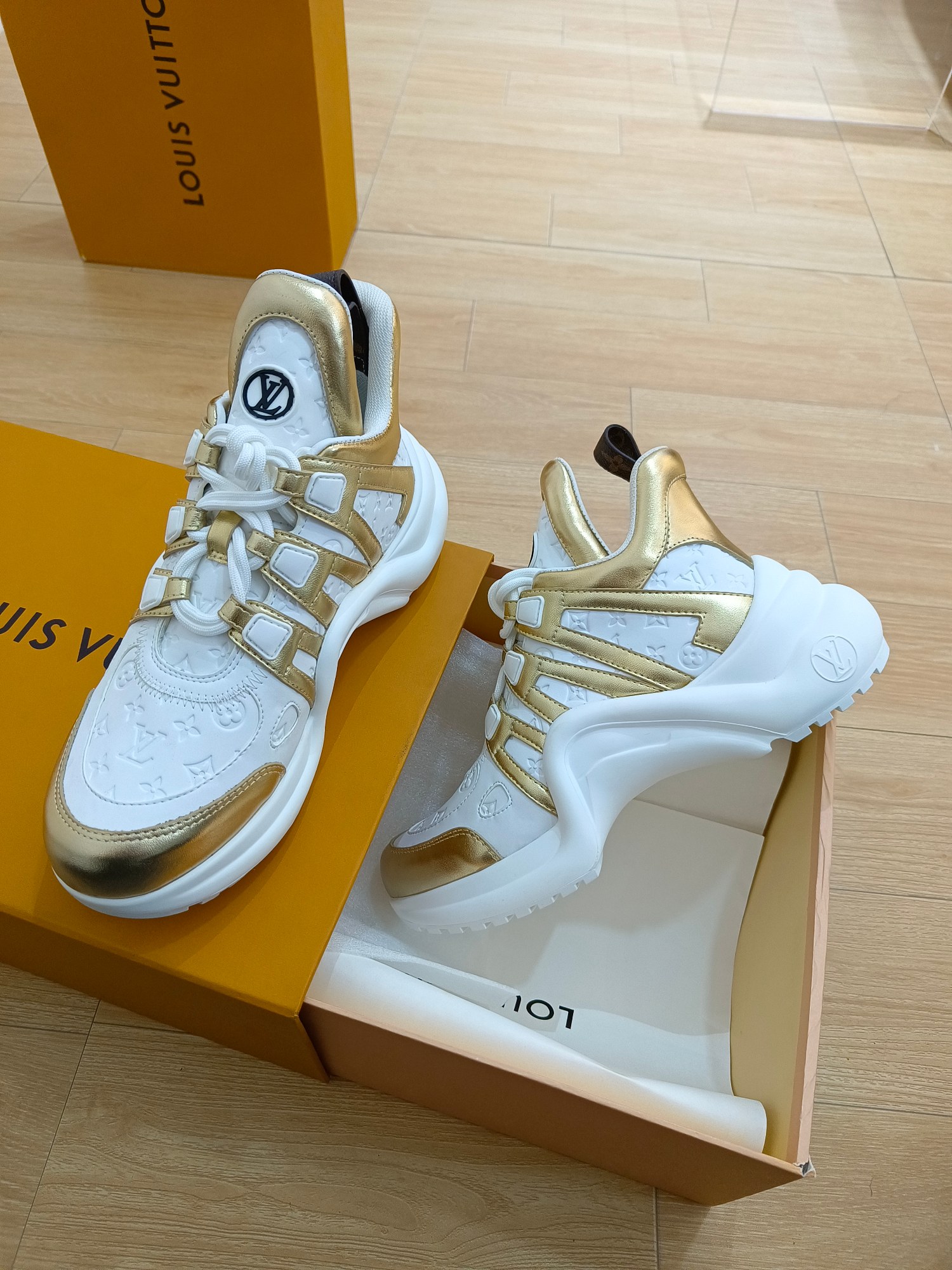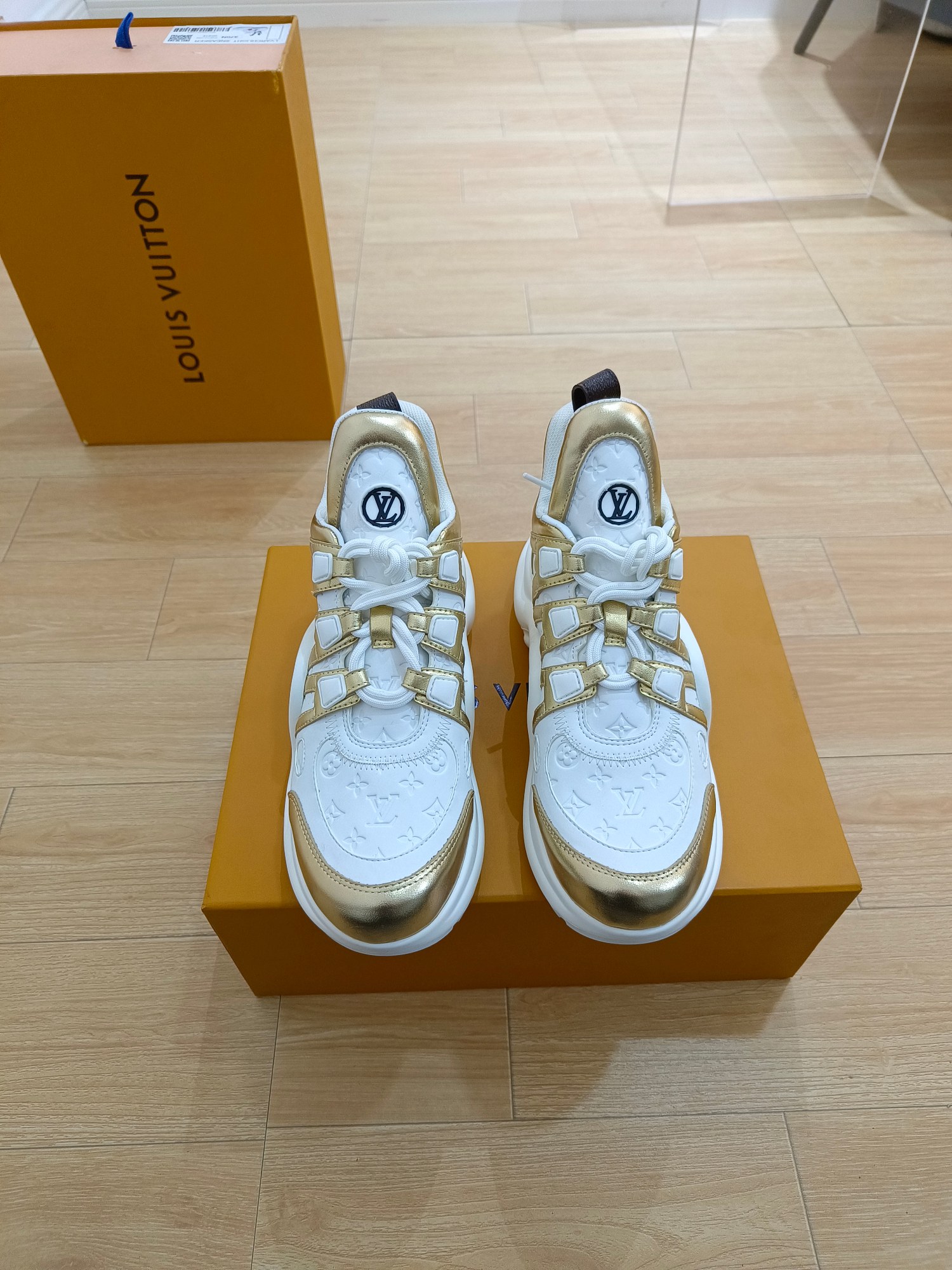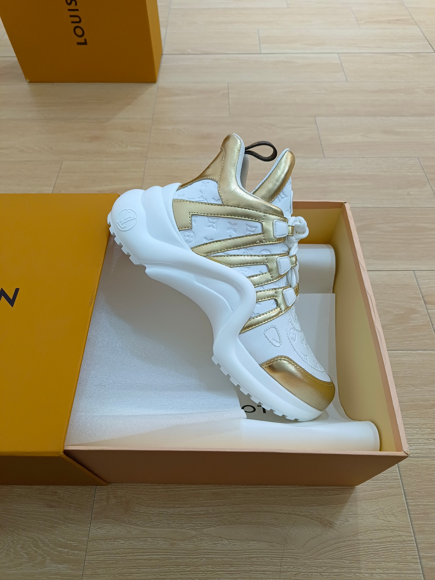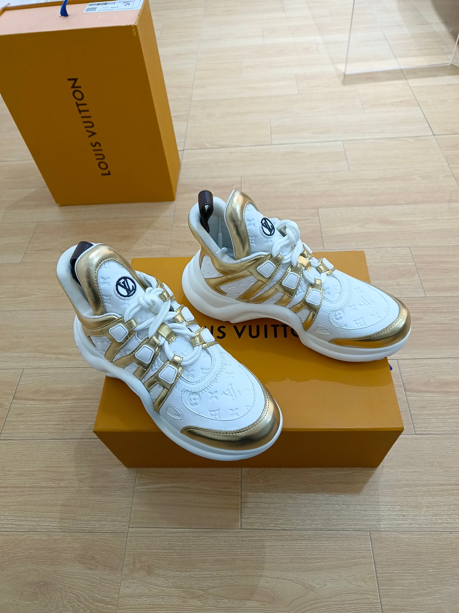 这款鞋子是AAAAA 1:1 质量 (非常棒). 使用了和原版一模一样的材料. 商标部分也保持了和路易威登/Louis Vuitton一样. 图片拍摄是实物鞋子拍摄, 您所收到的实物保证和我们图片一模一样.