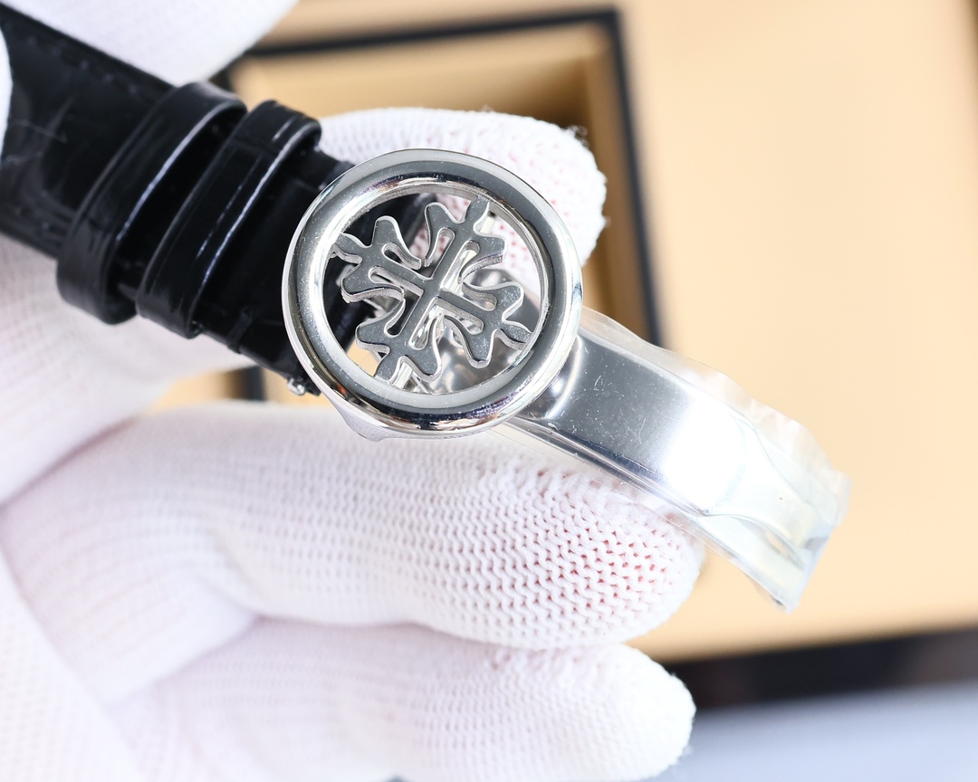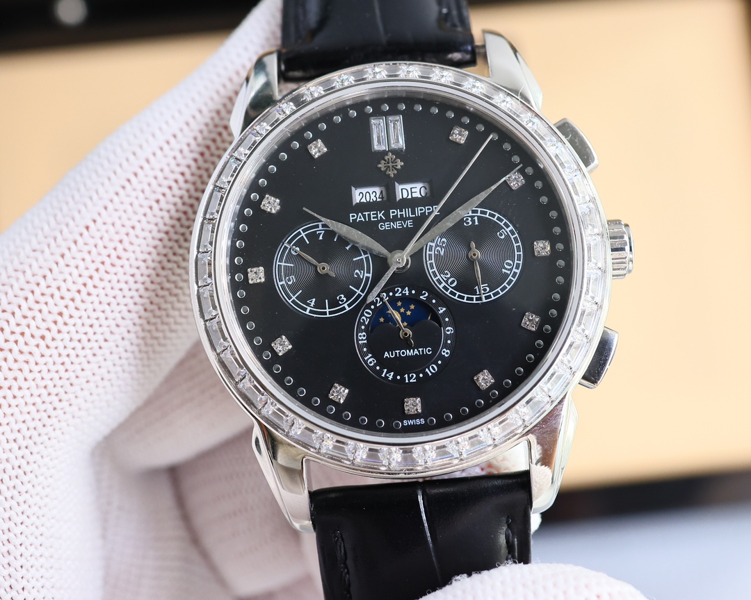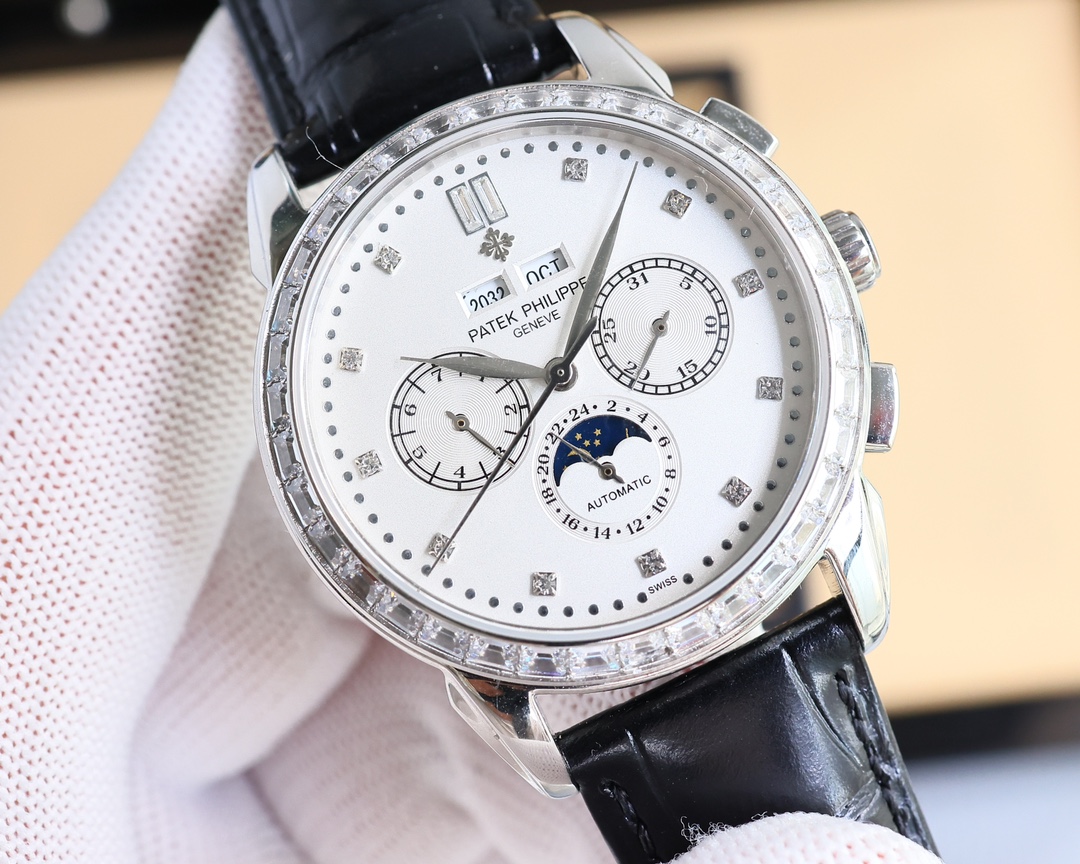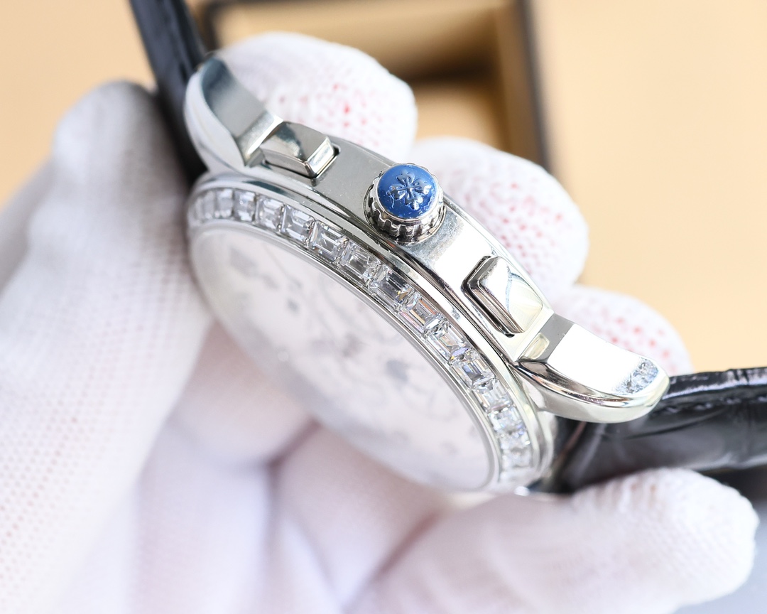 这款手表是AAAAA 1:1 质量 (非常棒). 使用了和原版一模一样的材料. 商标部分也保持了和百达翡丽/Patek Philippe一样. 图片拍摄是实物手表拍摄, 您所收到的实物保证和我们图片一模一样.