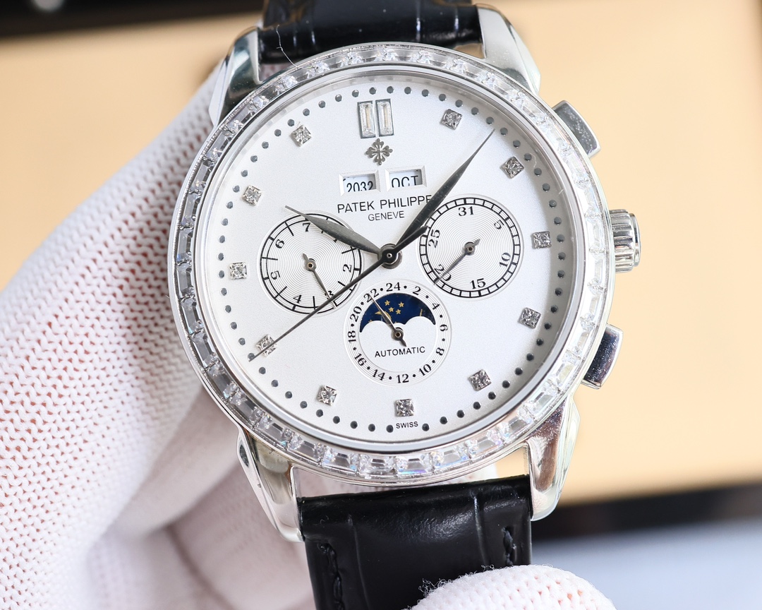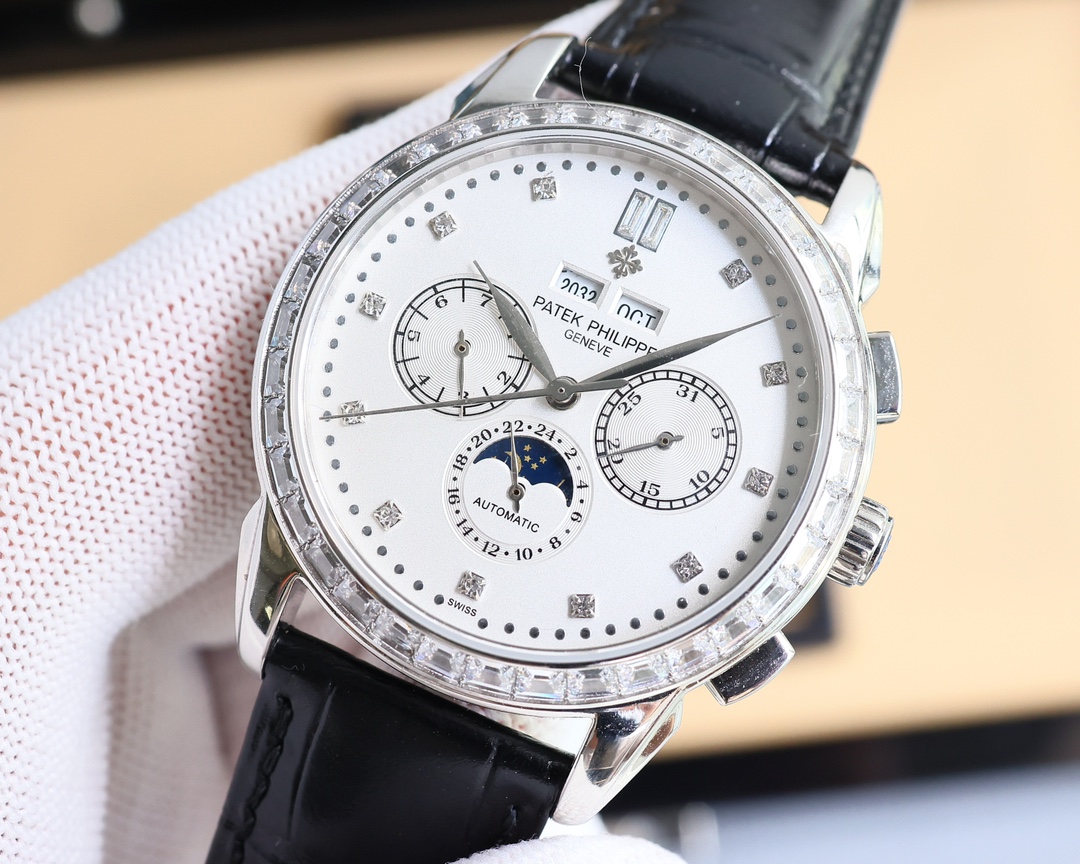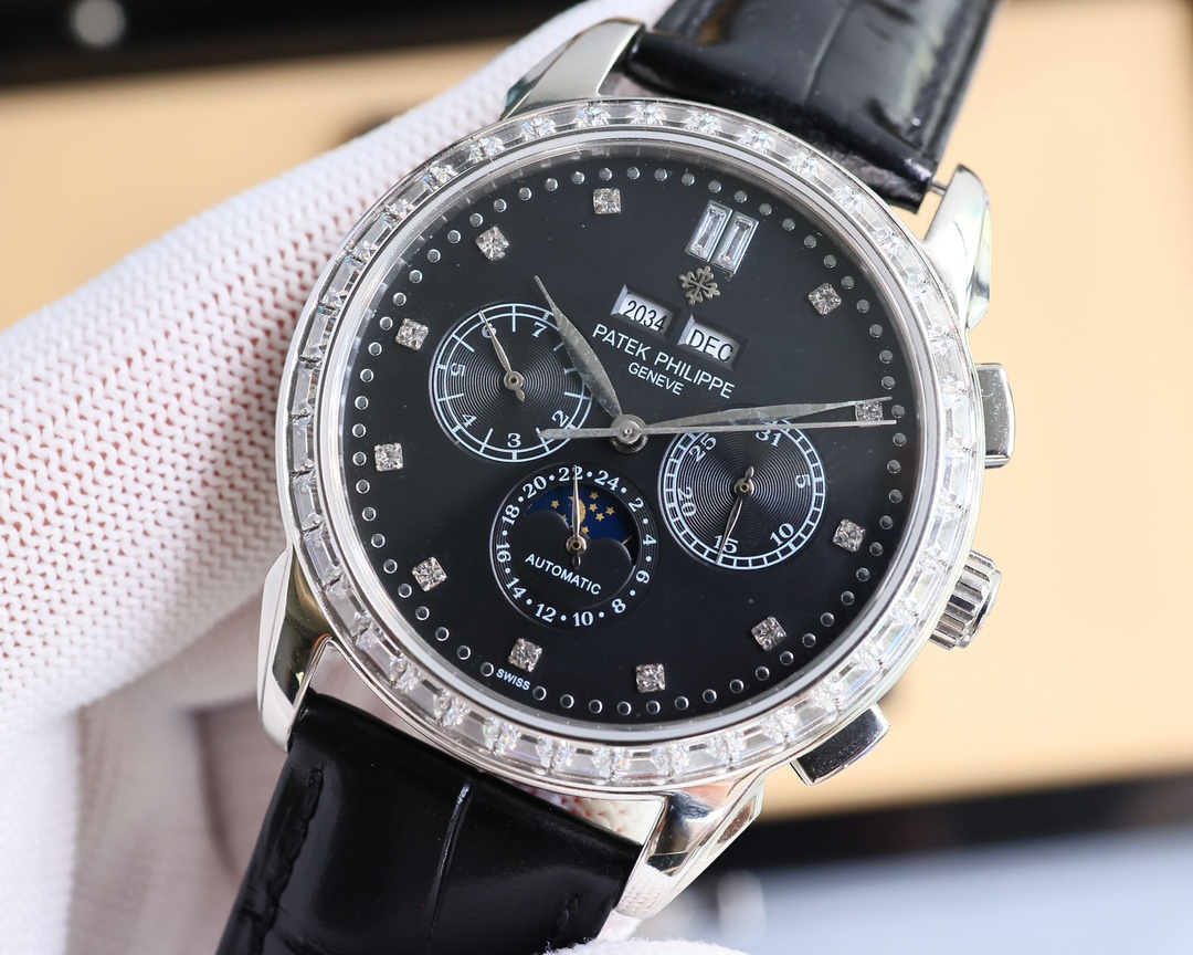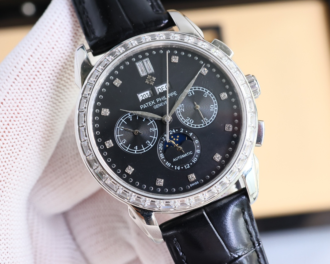 这款手表是AAAAA 1:1 质量 (非常棒). 使用了和原版一模一样的材料. 商标部分也保持了和百达翡丽/Patek Philippe一样. 图片拍摄是实物手表拍摄, 您所收到的实物保证和我们图片一模一样.