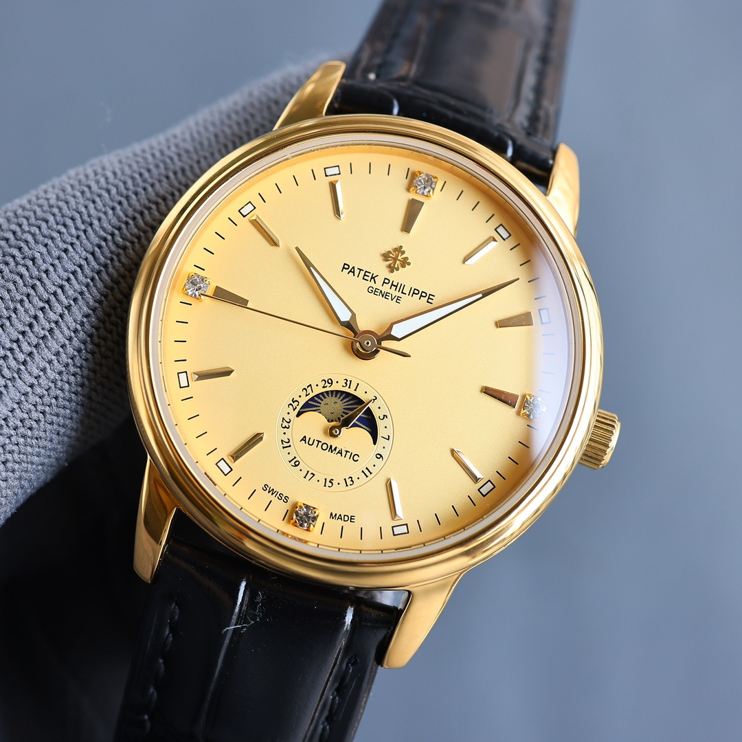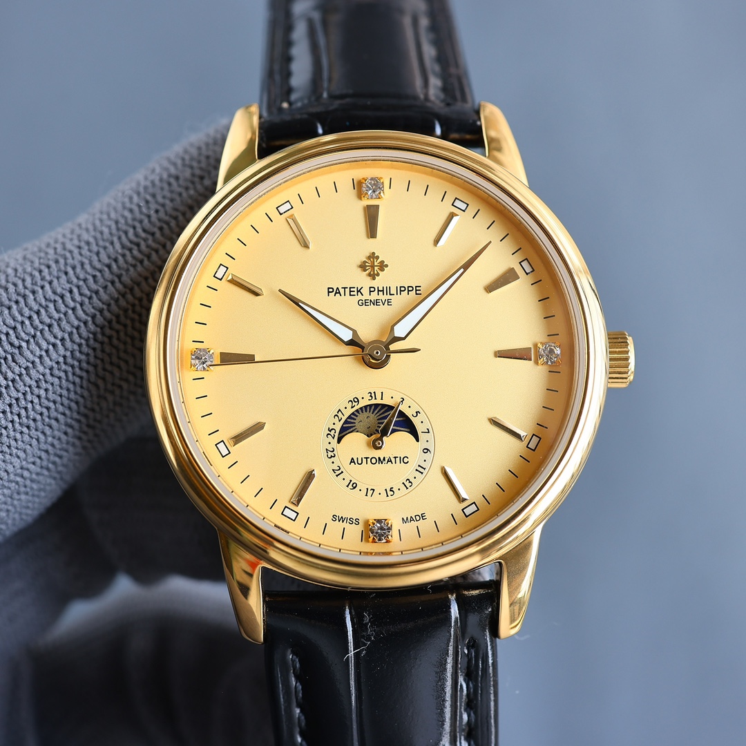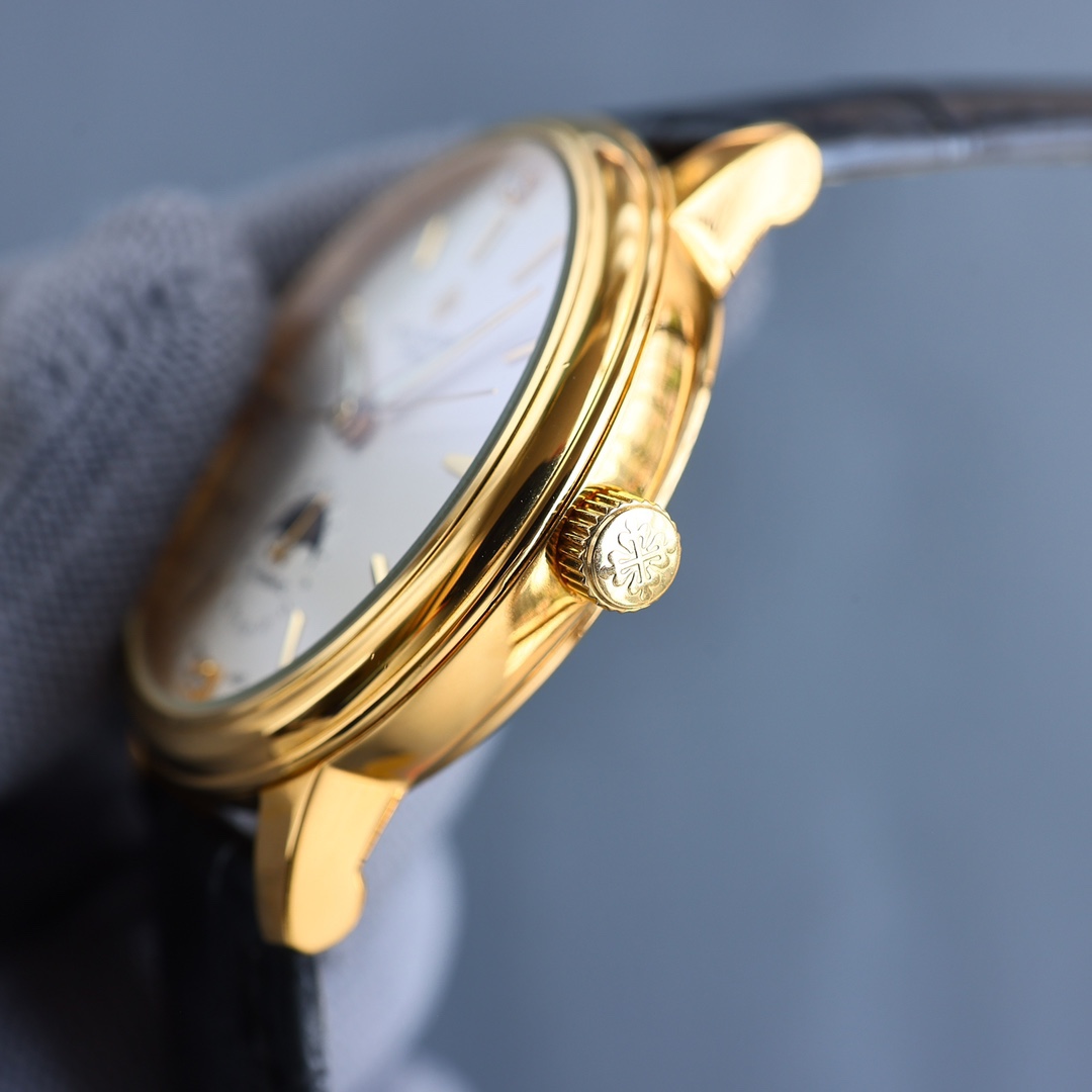 这款手表是AAAAA 1:1 质量 (非常棒). 使用了和原版一模一样的材料. 商标部分也保持了和百达翡丽/Patek Philippe一样. 图片拍摄是实物手表拍摄, 您所收到的实物保证和我们图片一模一样.