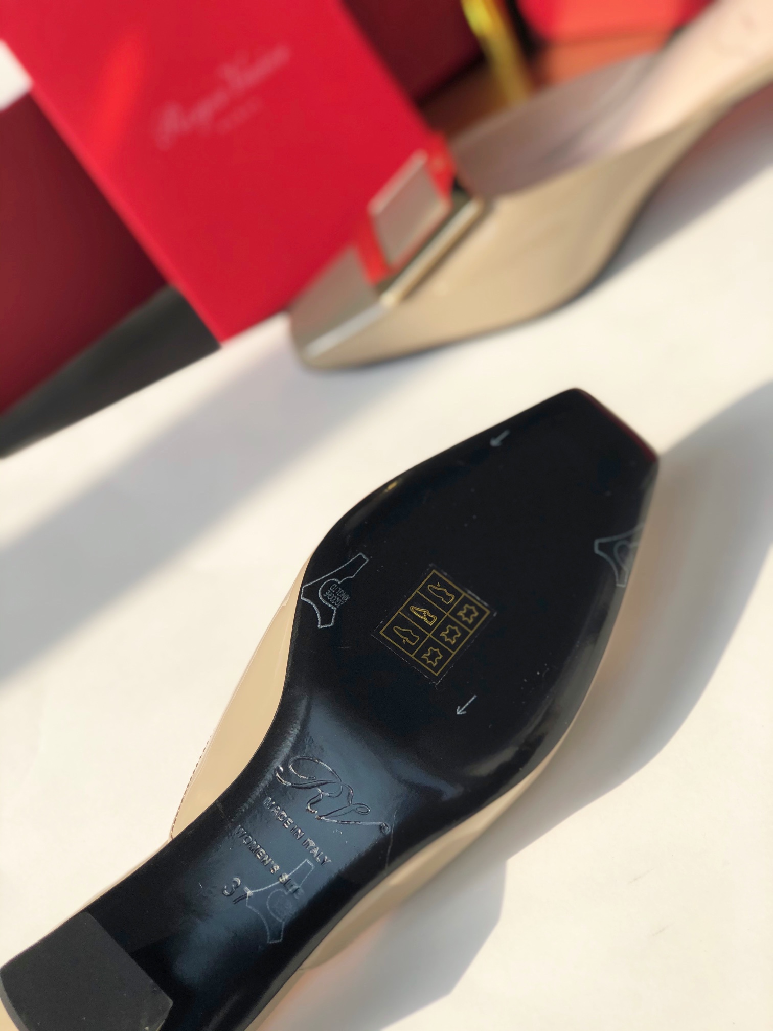 这款鞋子是AAAAA 1:1 质量 (非常棒). 使用了和原版一模一样的材料. 商标部分也保持了和罗杰维维耶/Roger Vivier一样. 图片拍摄是实物鞋子拍摄, 您所收到的实物保证和我们图片一模一样.