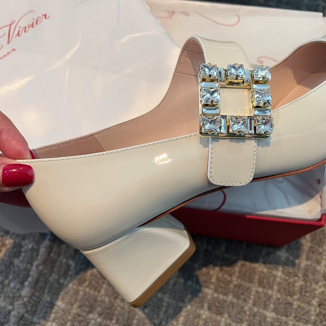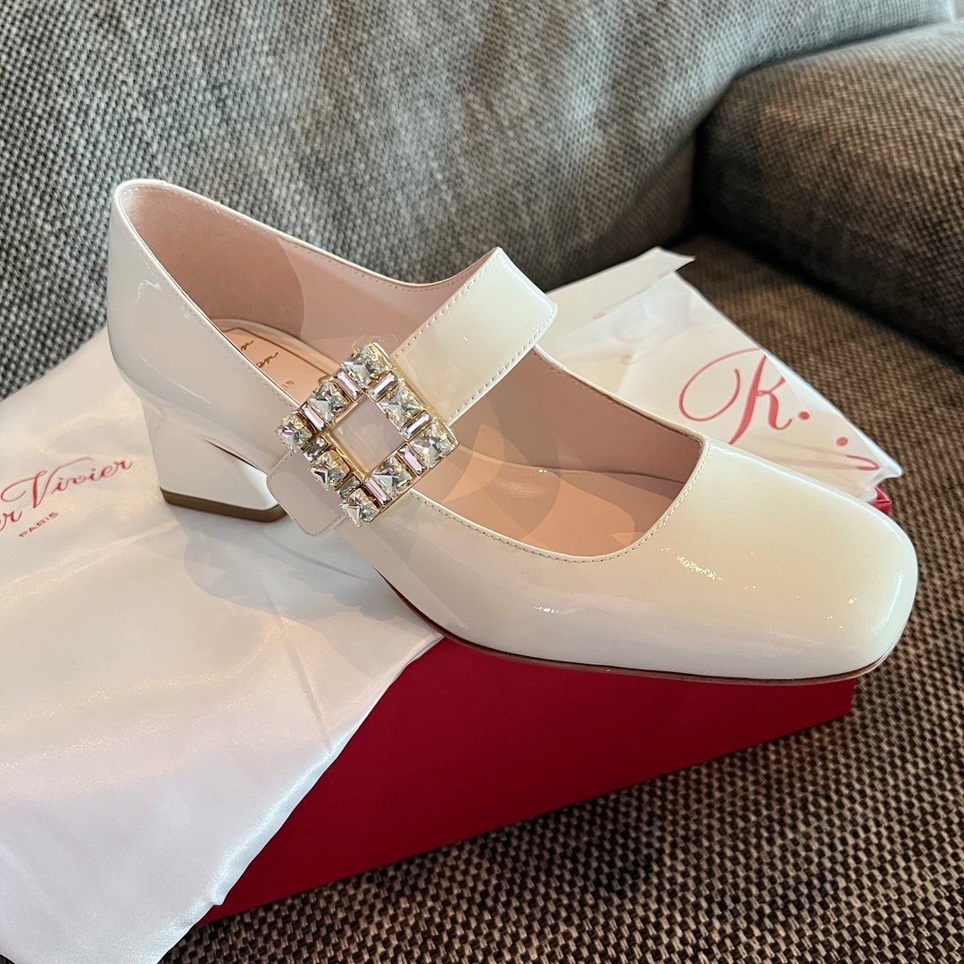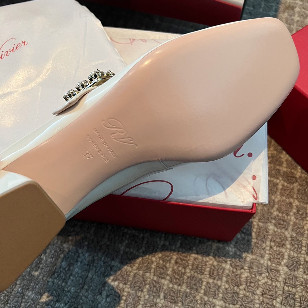 这款鞋子是AAAAA 1:1 质量 (非常棒). 使用了和原版一模一样的材料. 商标部分也保持了和罗杰维维耶/Roger Vivier一样. 图片拍摄是实物鞋子拍摄, 您所收到的实物保证和我们图片一模一样.