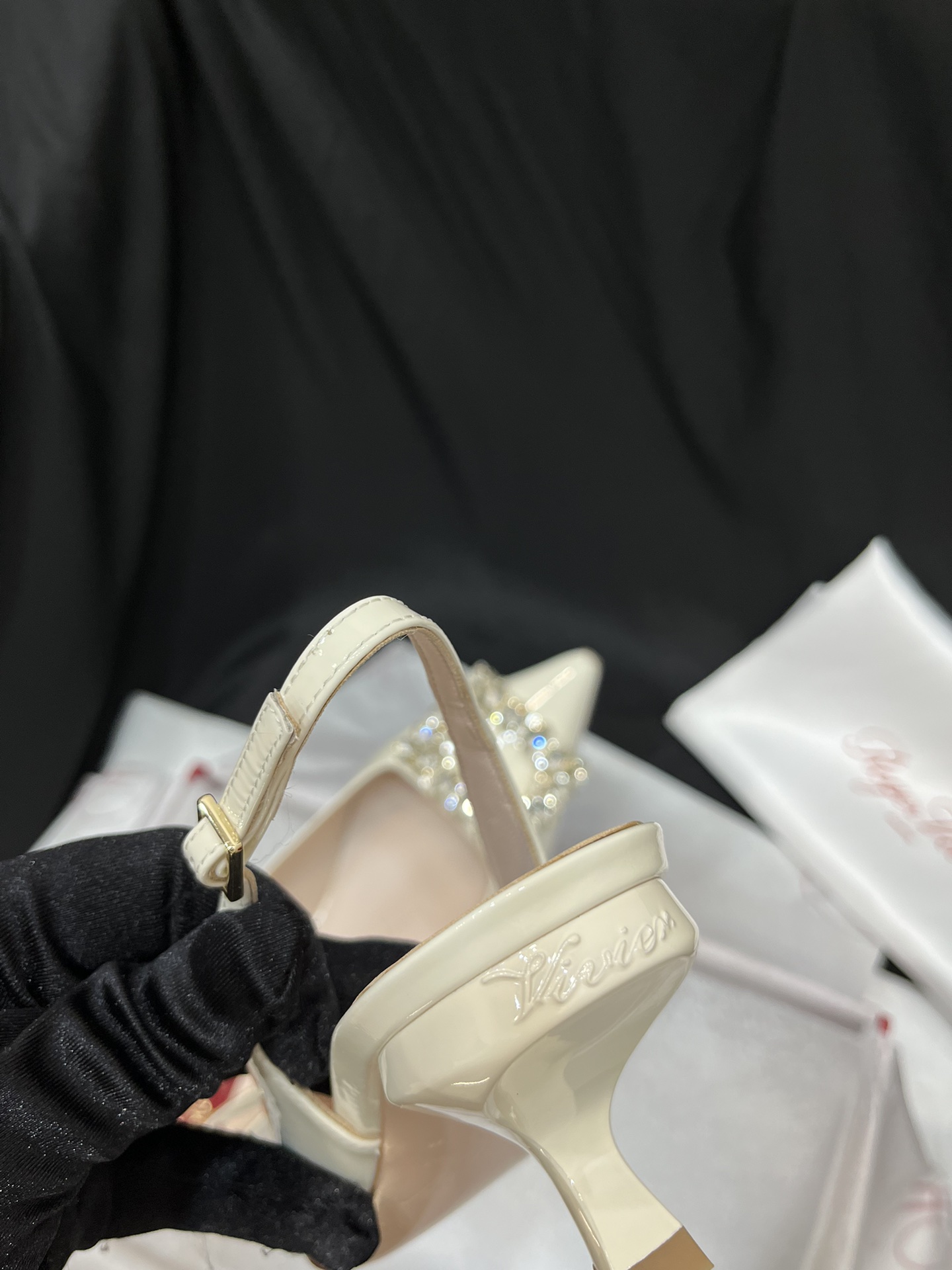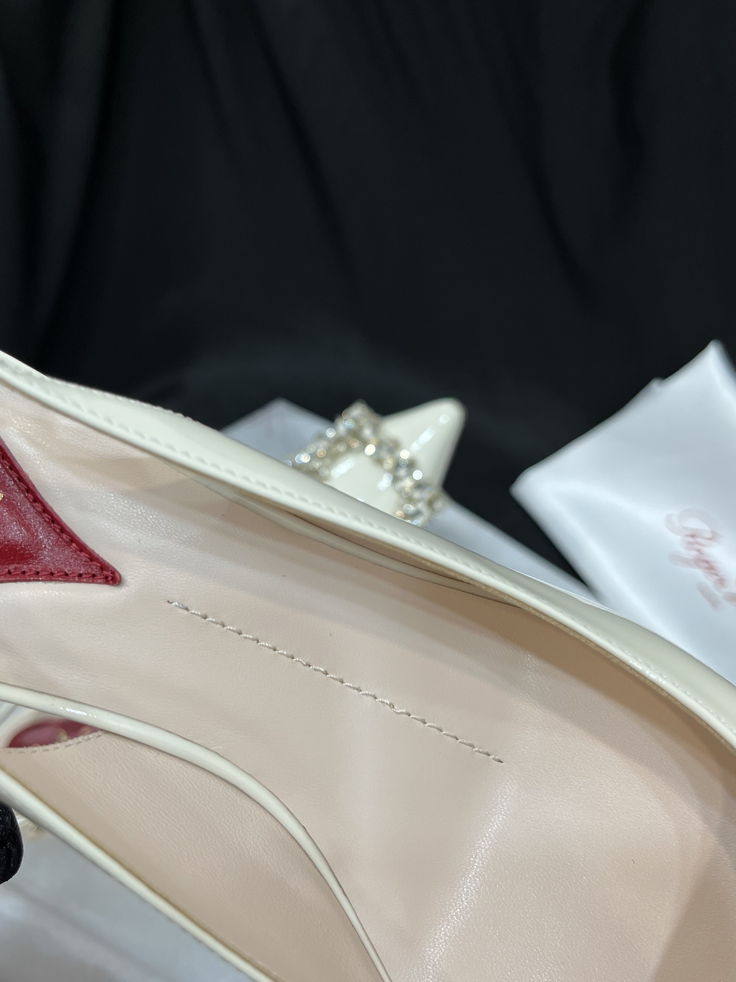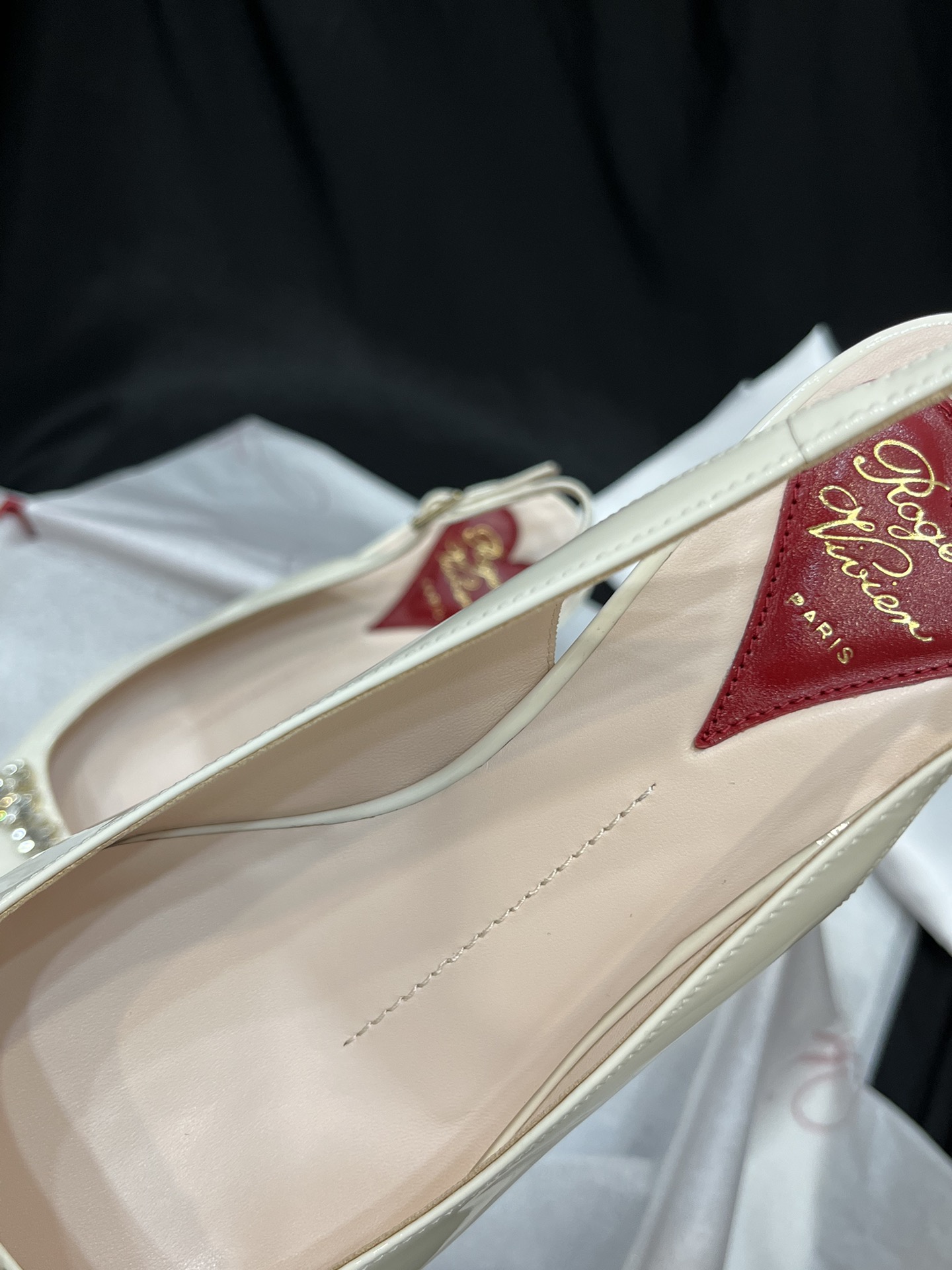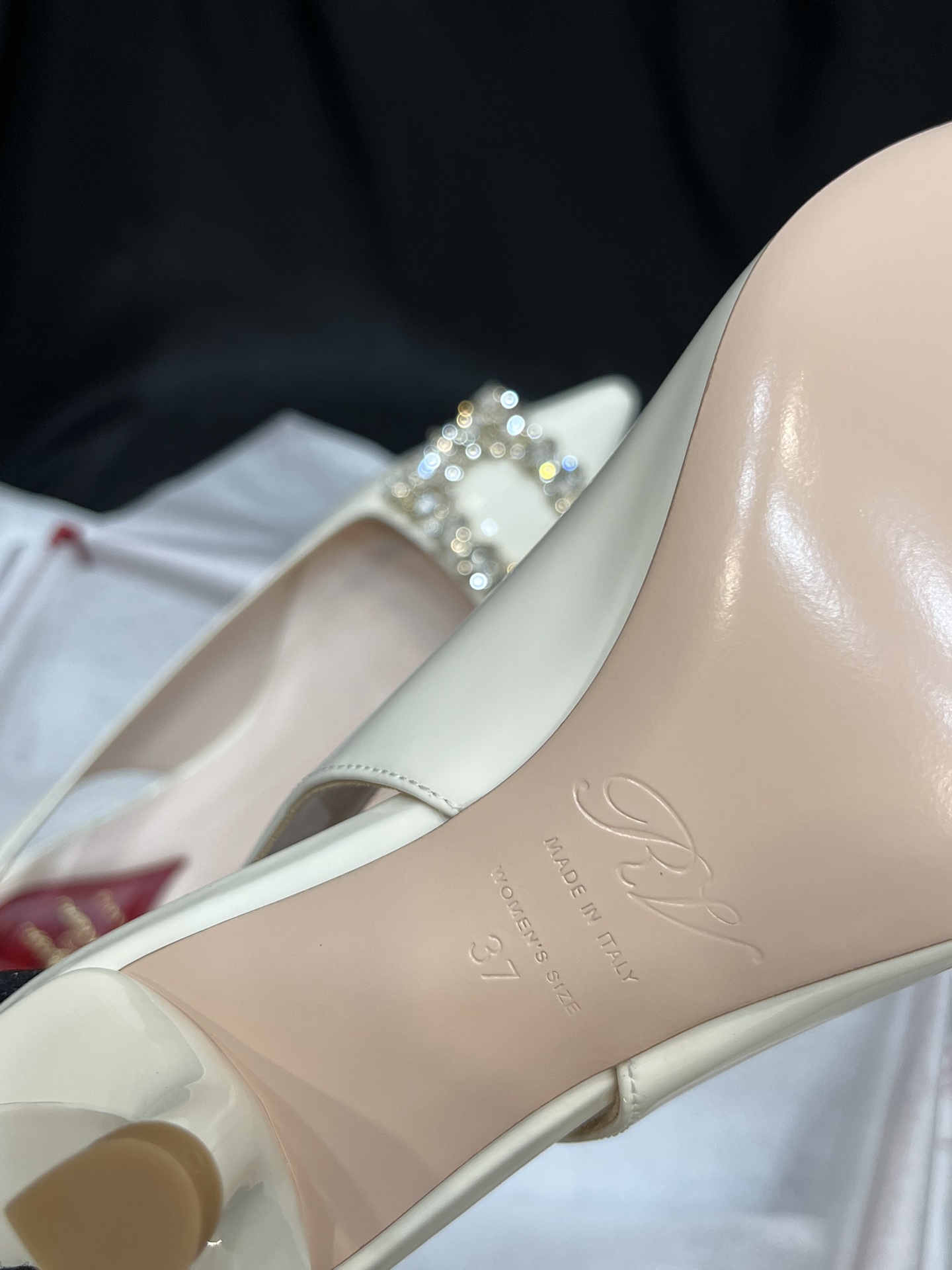 这款鞋子是AAAAA 1:1 质量 (非常棒). 使用了和原版一模一样的材料. 商标部分也保持了和罗杰维维耶/Roger Vivier一样. 图片拍摄是实物鞋子拍摄, 您所收到的实物保证和我们图片一模一样.