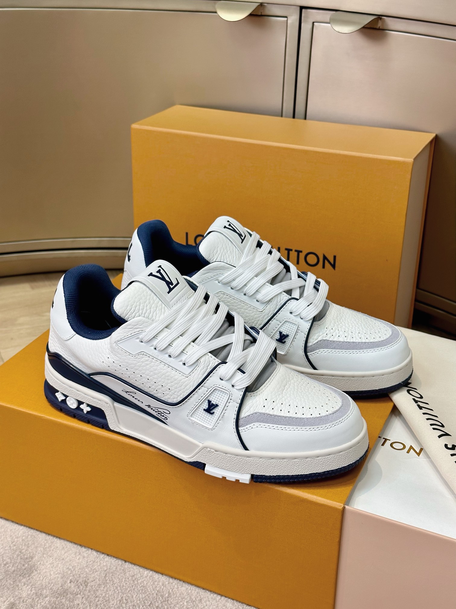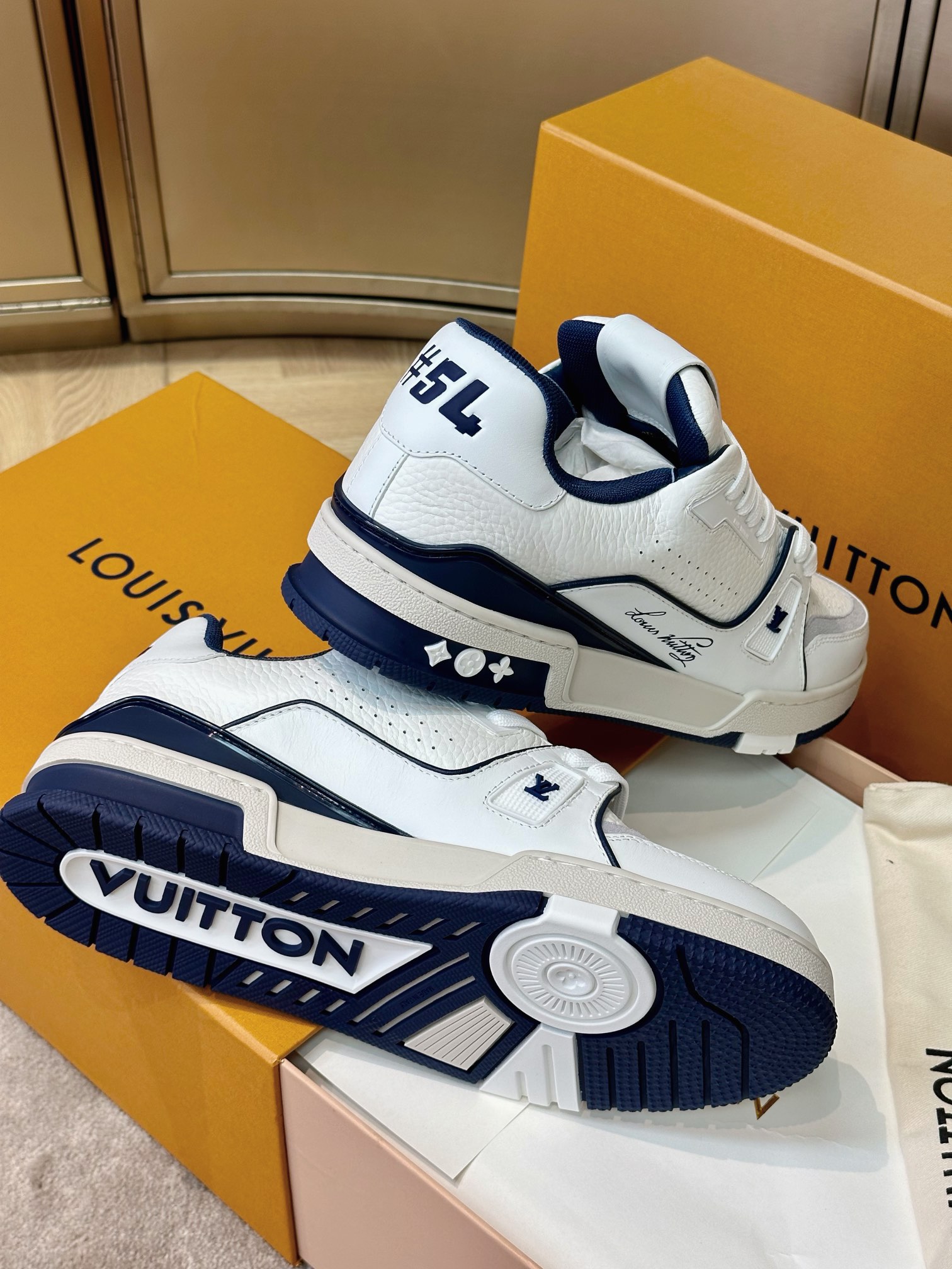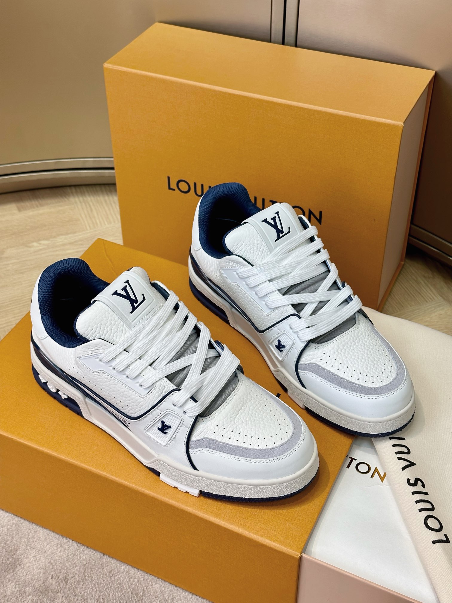 这款鞋子是AAAAA 1:1 质量 (非常棒). 使用了和原版一模一样的材料. 商标部分也保持了和路易威登/Louis Vuitton一样. 图片拍摄是实物鞋子拍摄, 您所收到的实物保证和我们图片一模一样.