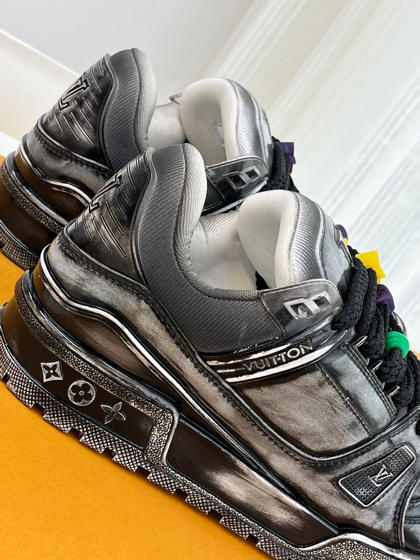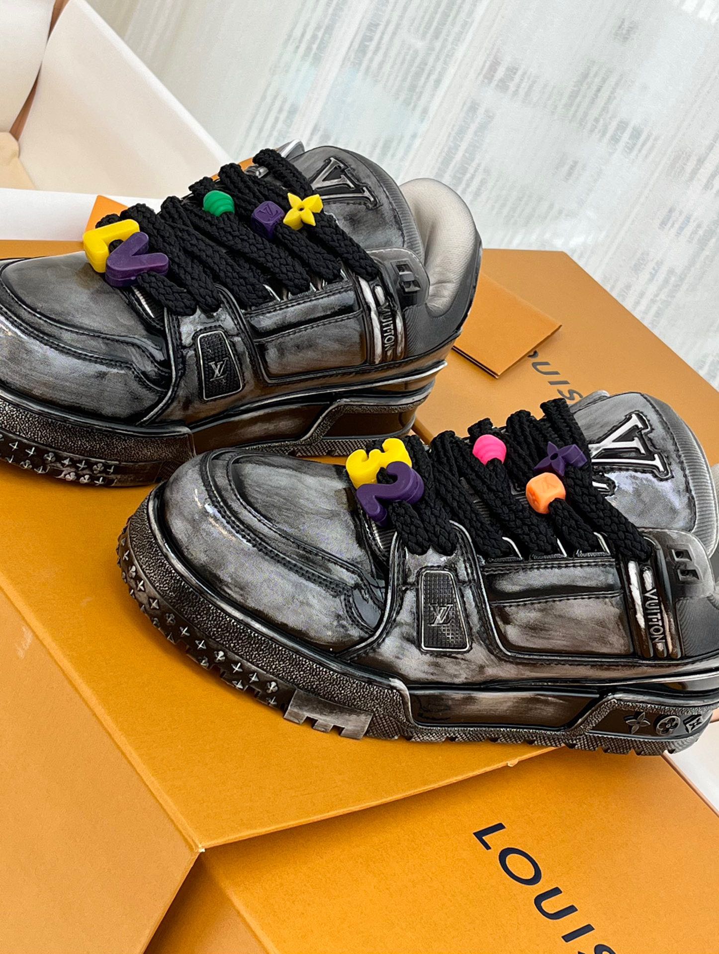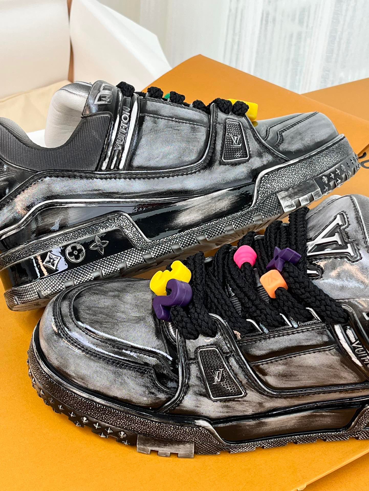 这款鞋子是AAAAA 1:1 质量 (非常棒). 使用了和原版一模一样的材料. 商标部分也保持了和路易威登/Louis Vuitton一样. 图片拍摄是实物鞋子拍摄, 您所收到的实物保证和我们图片一模一样.