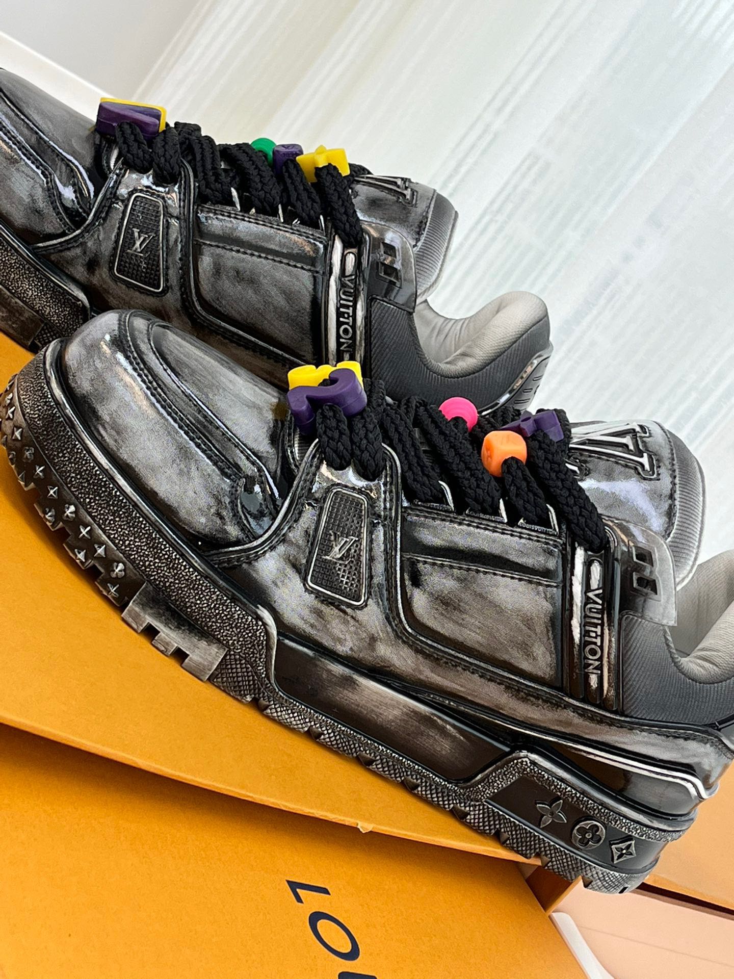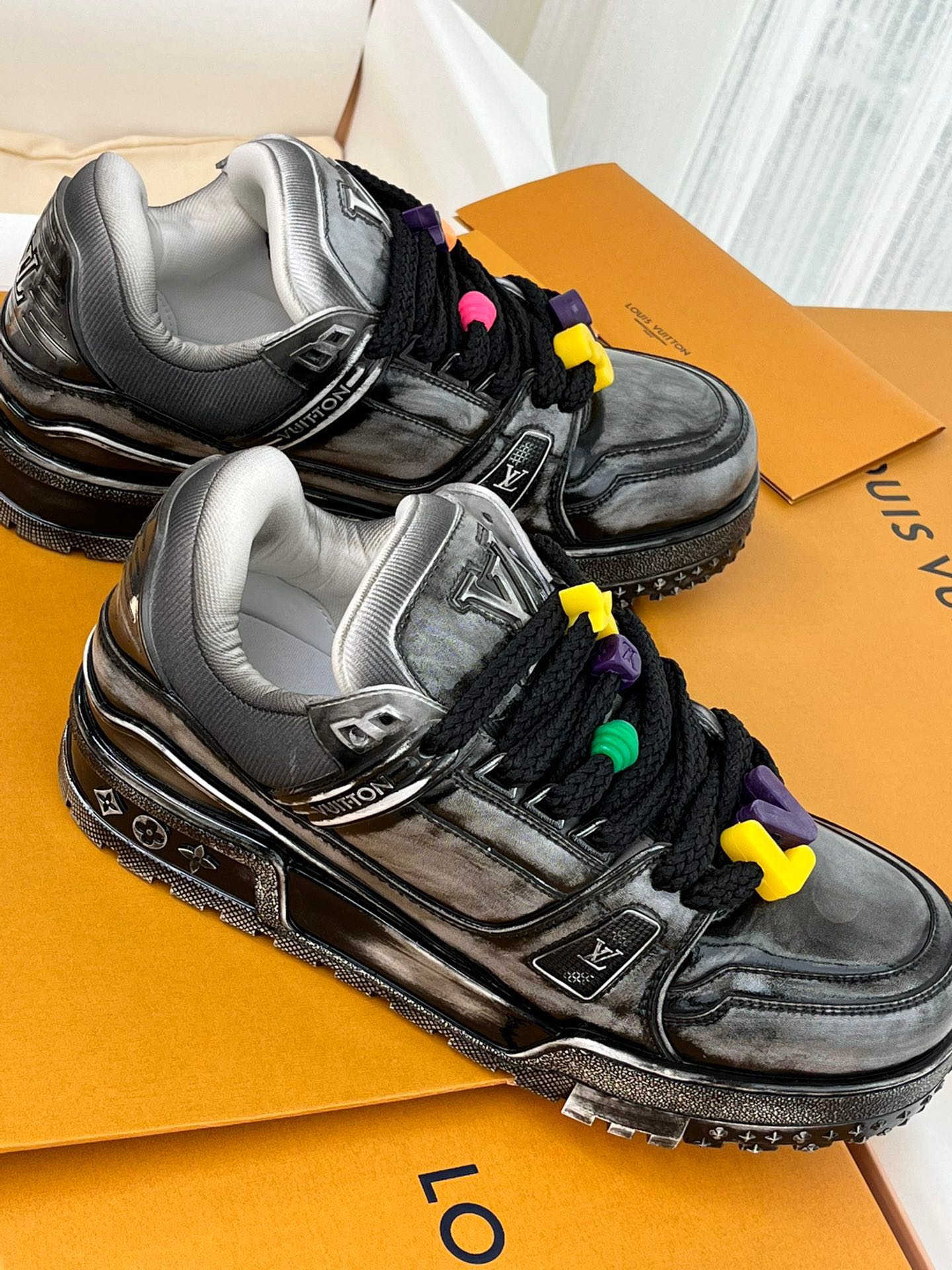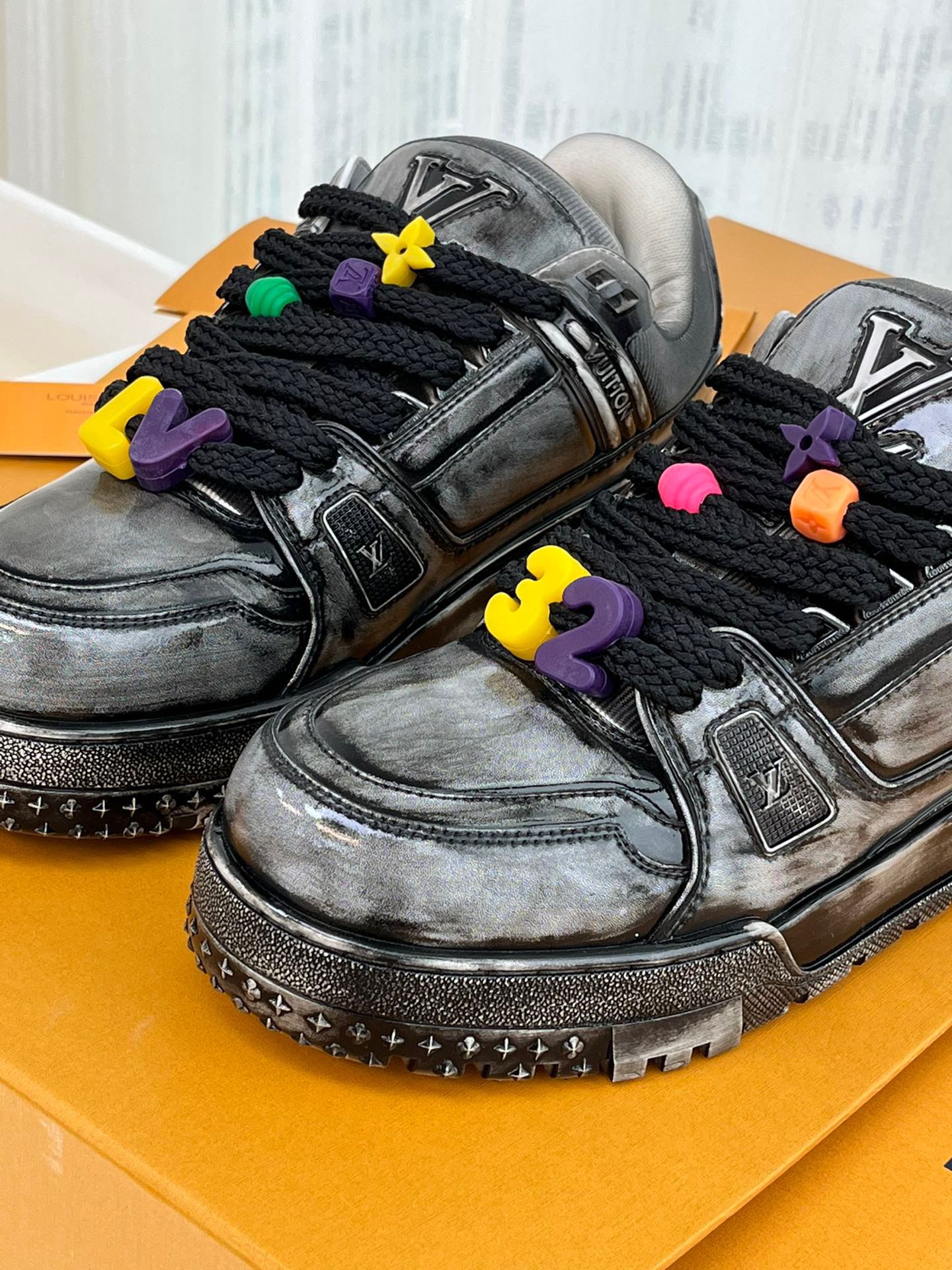 这款鞋子是AAAAA 1:1 质量 (非常棒). 使用了和原版一模一样的材料. 商标部分也保持了和路易威登/Louis Vuitton一样. 图片拍摄是实物鞋子拍摄, 您所收到的实物保证和我们图片一模一样.