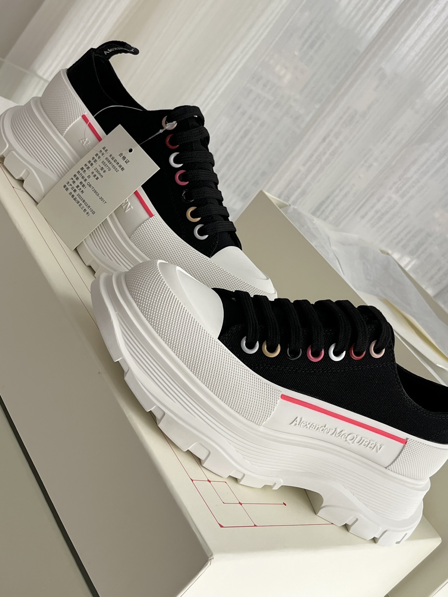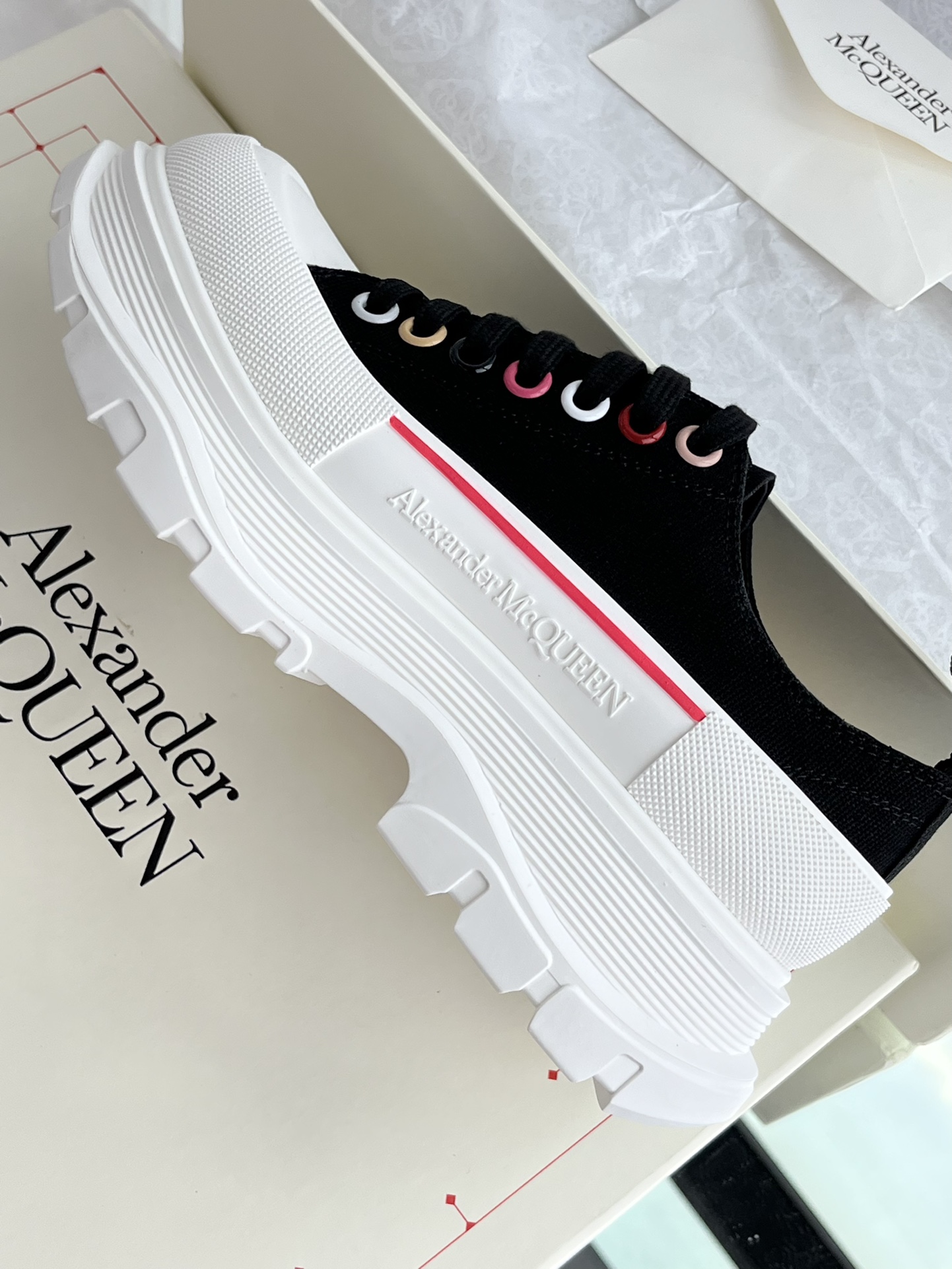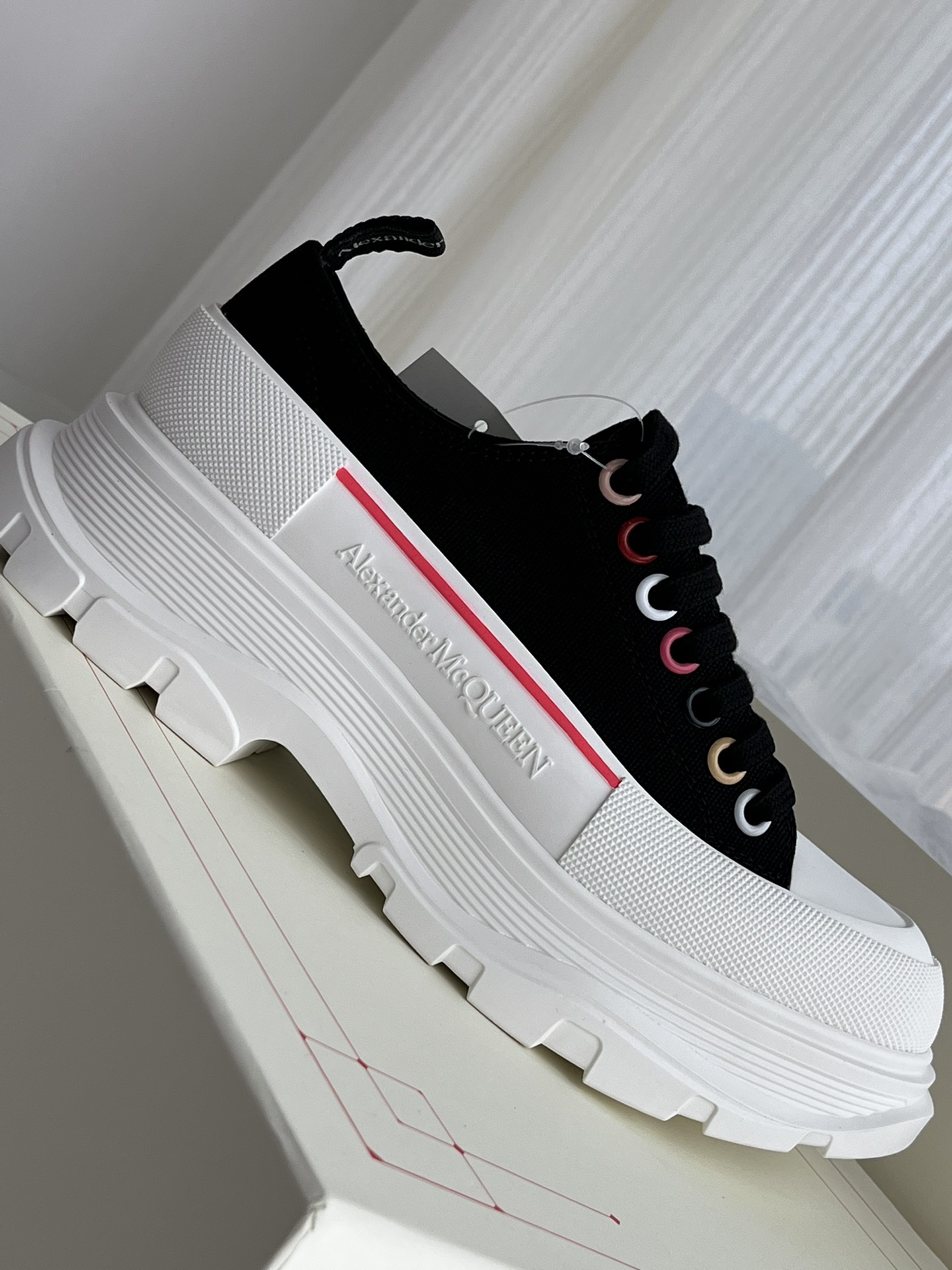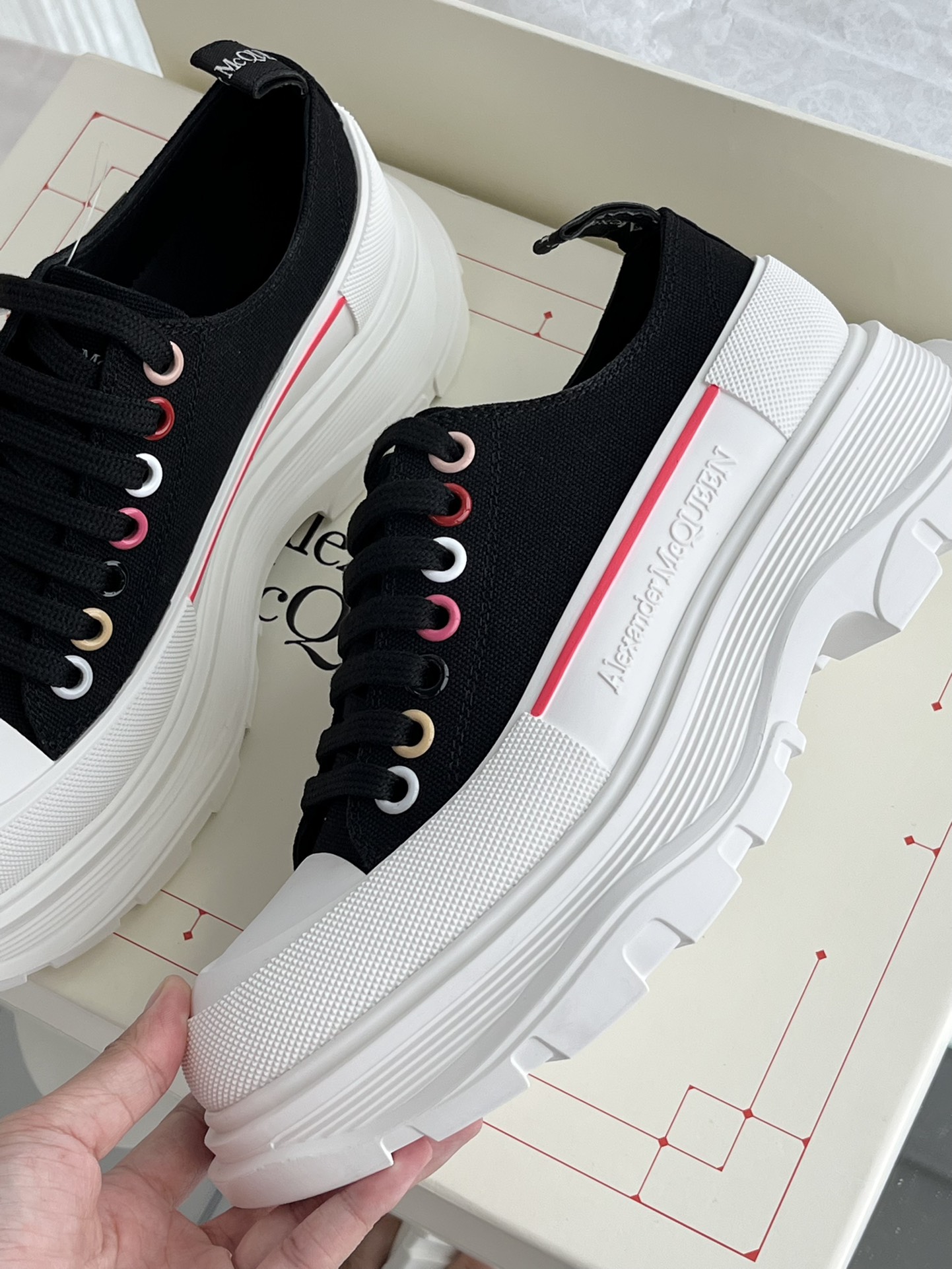 这款鞋子是AAAAA 1:1 质量 (非常棒). 使用了和原版一模一样的材料. 商标部分也保持了和亚历山大·麦昆/McQueen一样. 图片拍摄是实物鞋子拍摄, 您所收到的实物保证和我们图片一模一样.