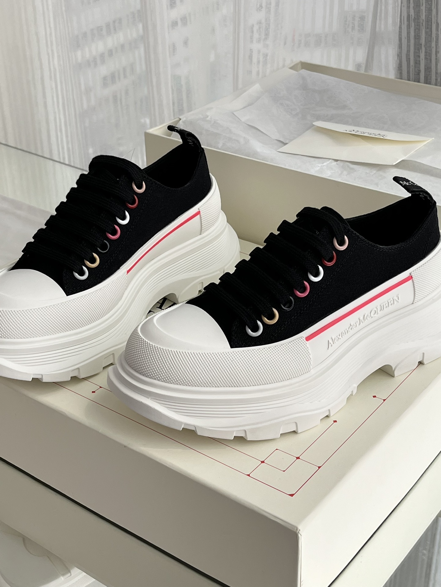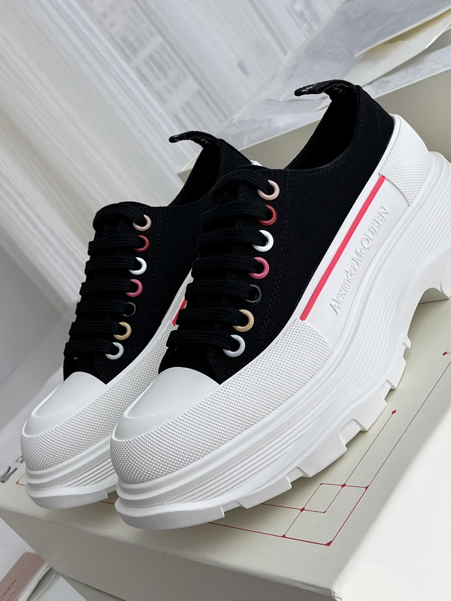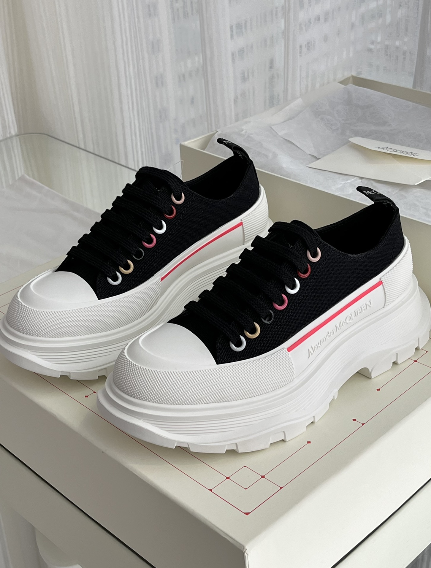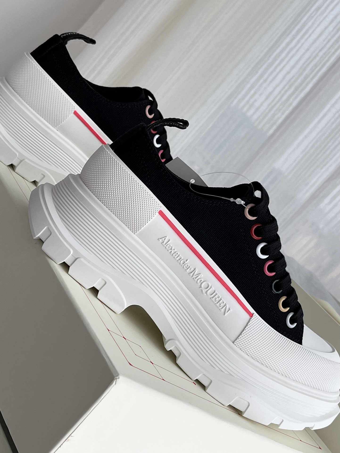 这款鞋子是AAAAA 1:1 质量 (非常棒). 使用了和原版一模一样的材料. 商标部分也保持了和亚历山大·麦昆/McQueen一样. 图片拍摄是实物鞋子拍摄, 您所收到的实物保证和我们图片一模一样.