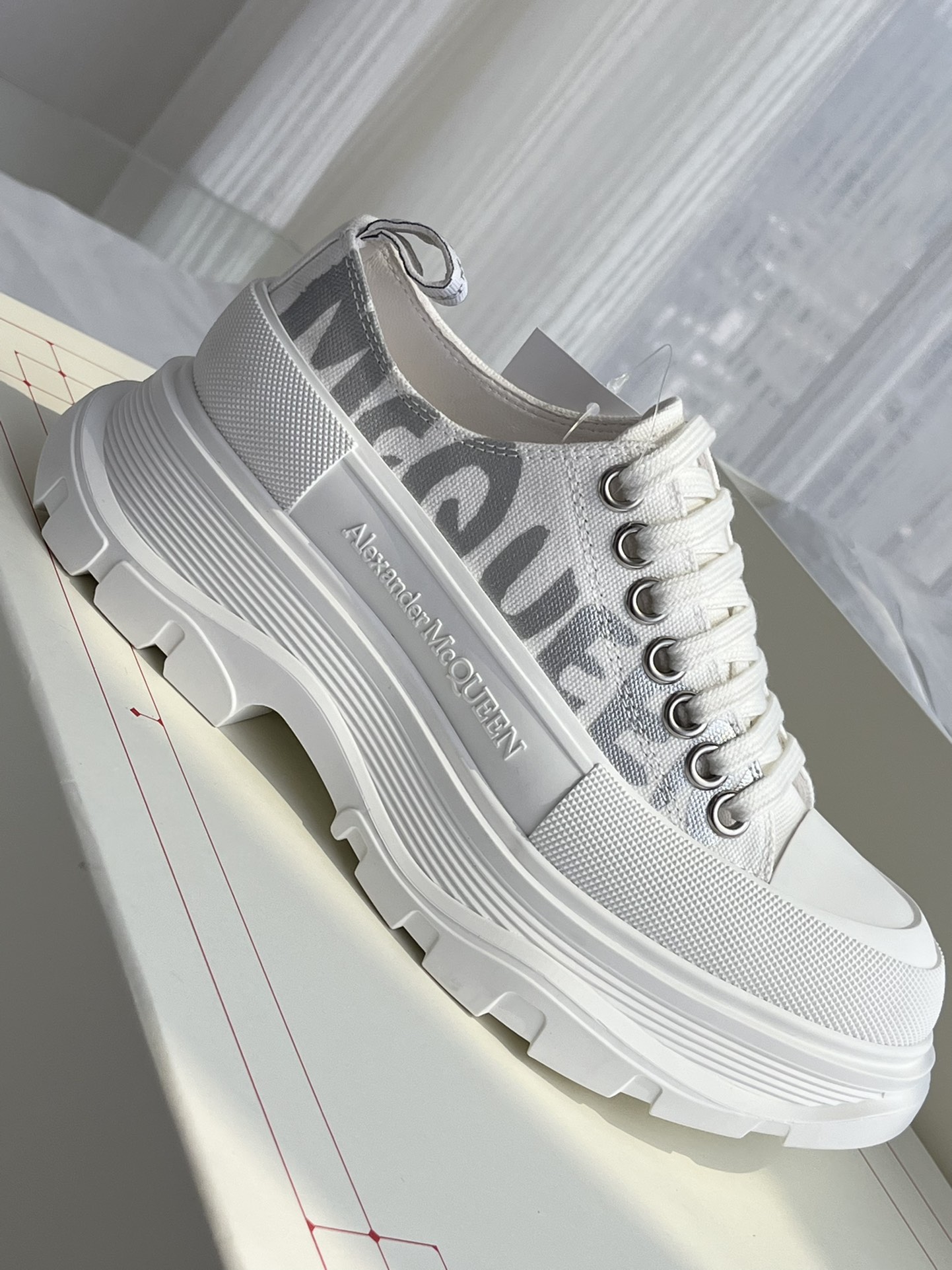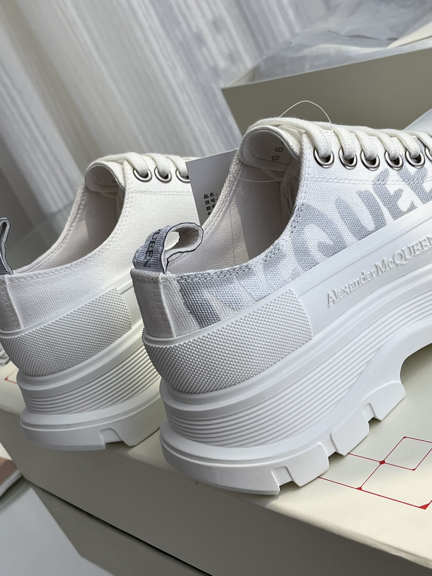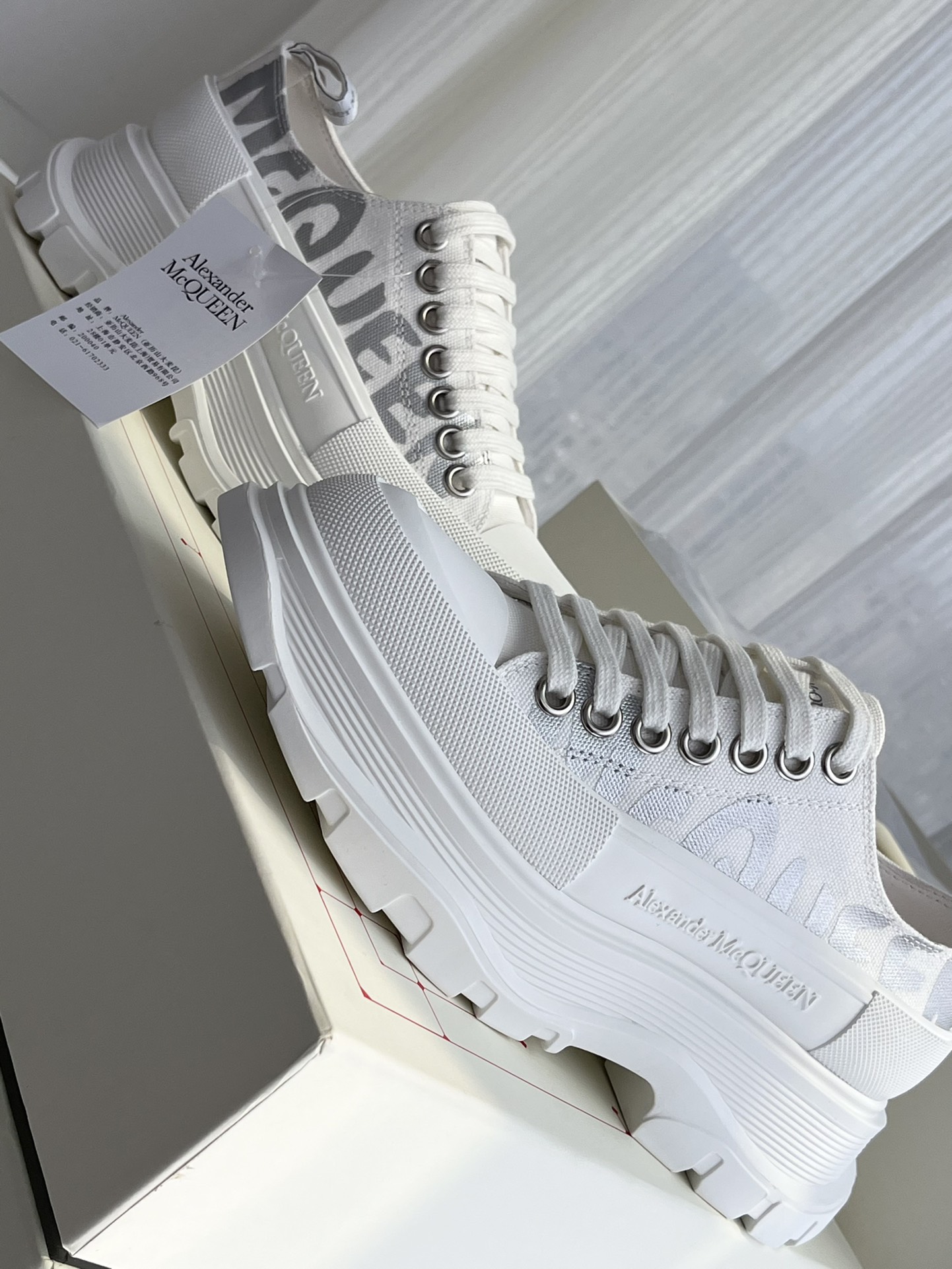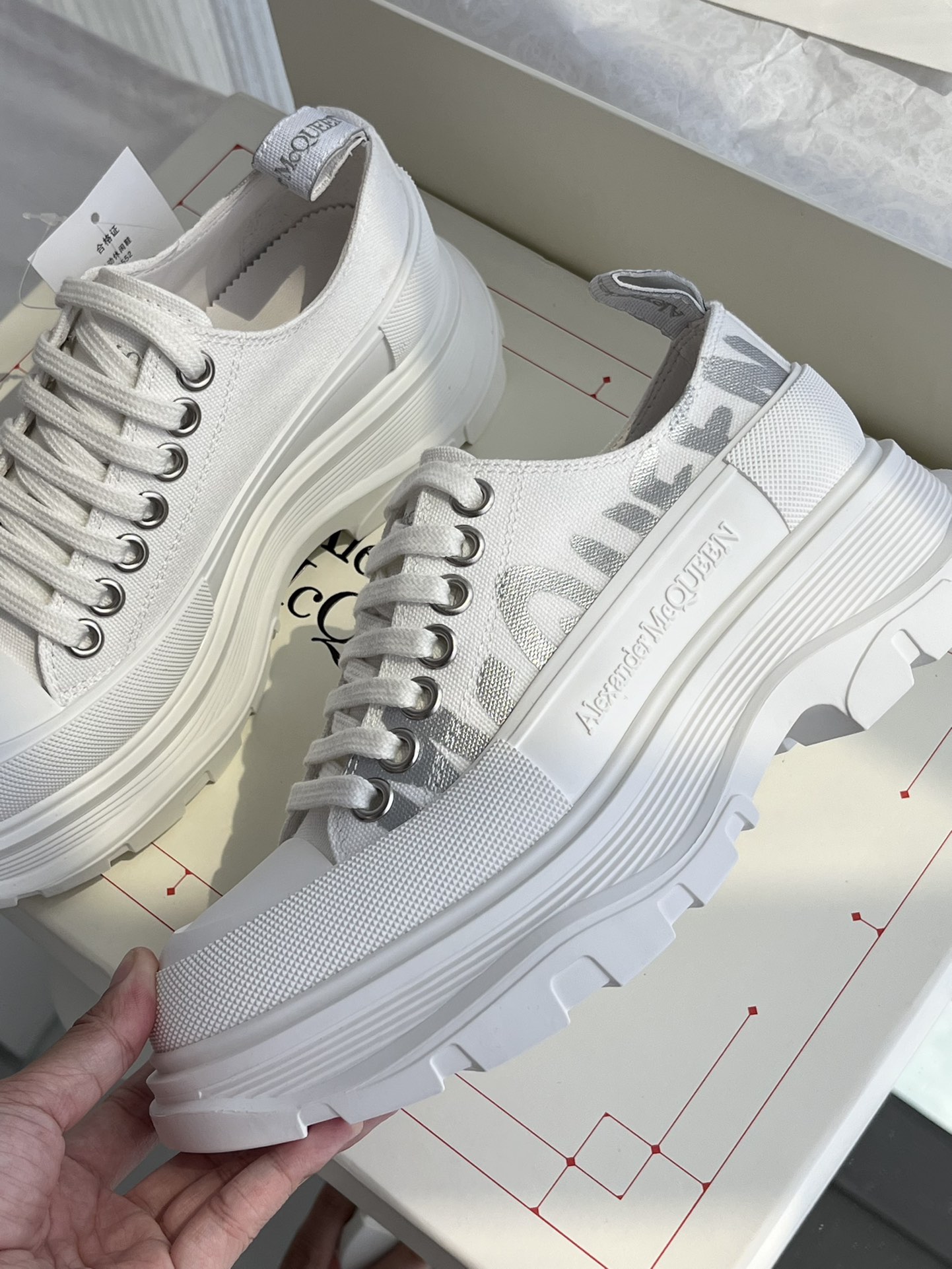 这款鞋子是AAAAA 1:1 质量 (非常棒). 使用了和原版一模一样的材料. 商标部分也保持了和亚历山大·麦昆/McQueen一样. 图片拍摄是实物鞋子拍摄, 您所收到的实物保证和我们图片一模一样.