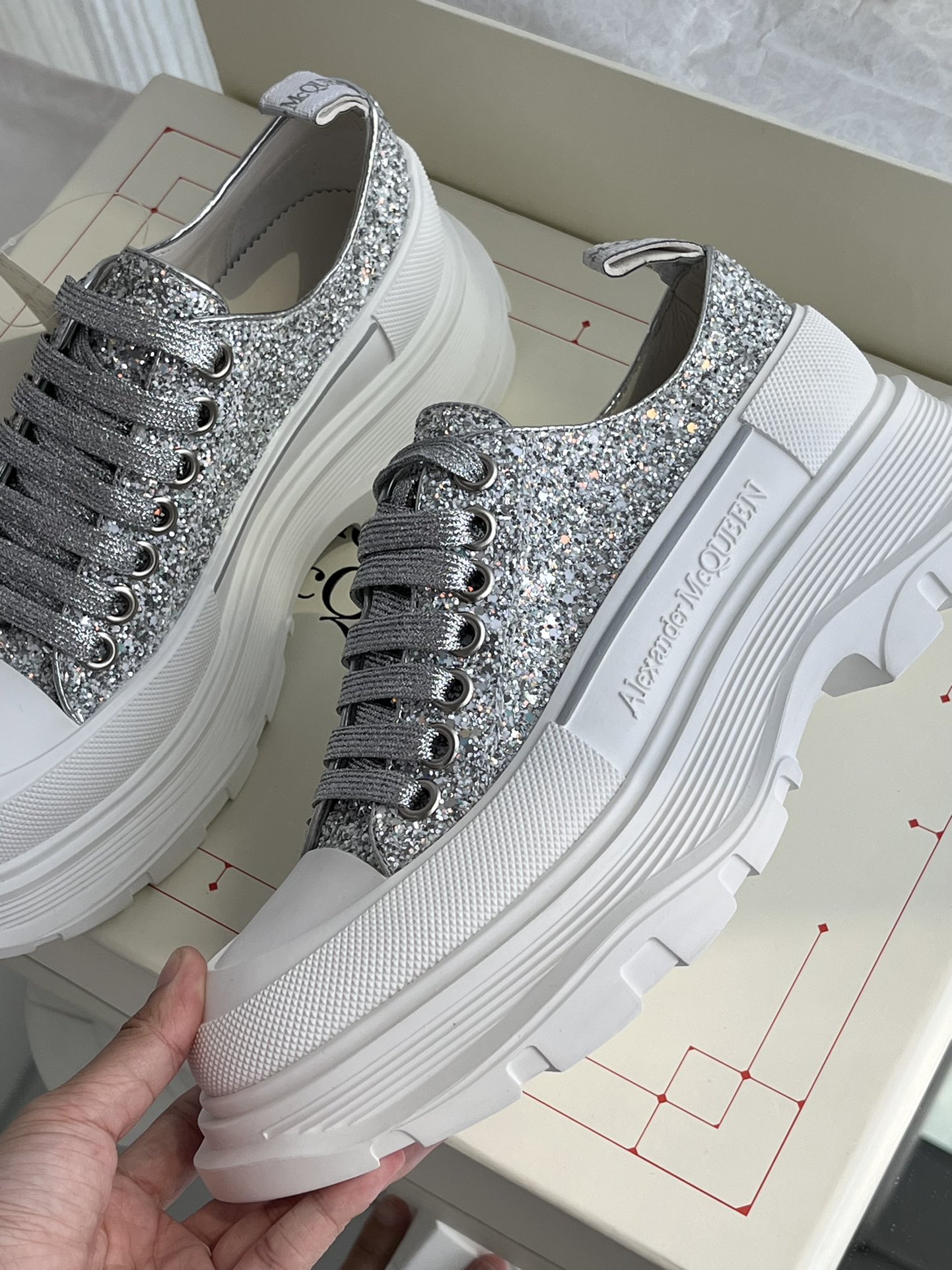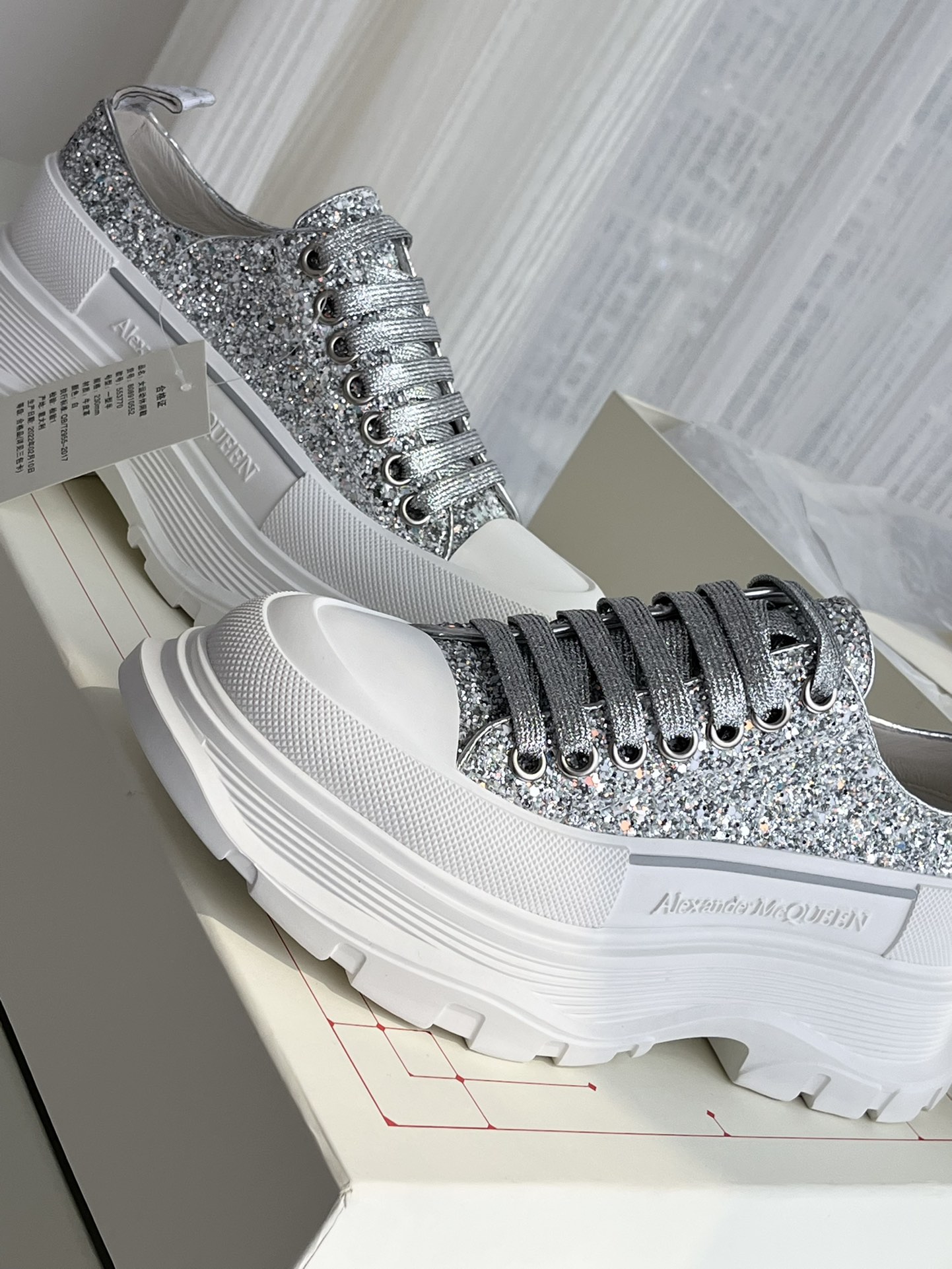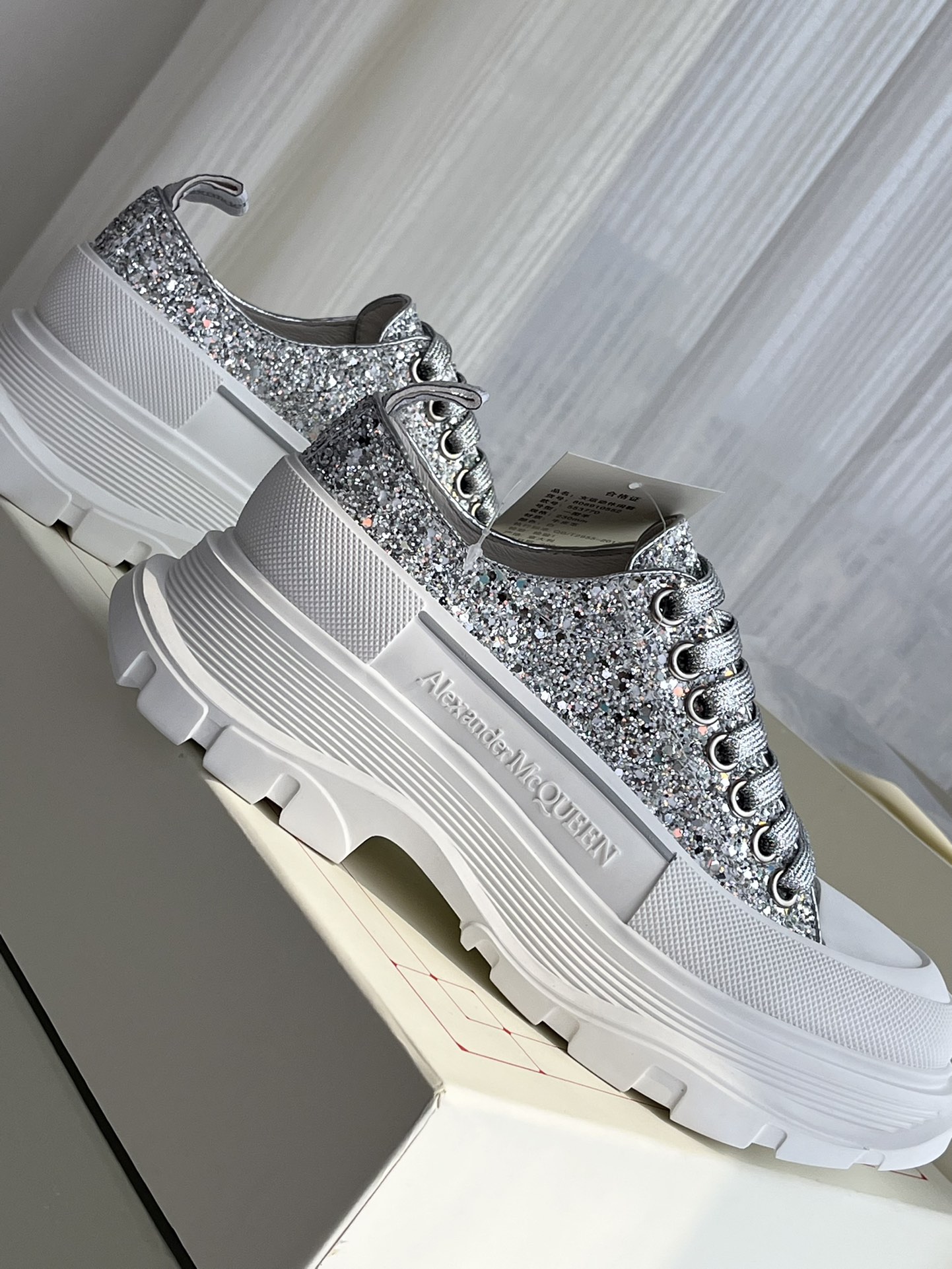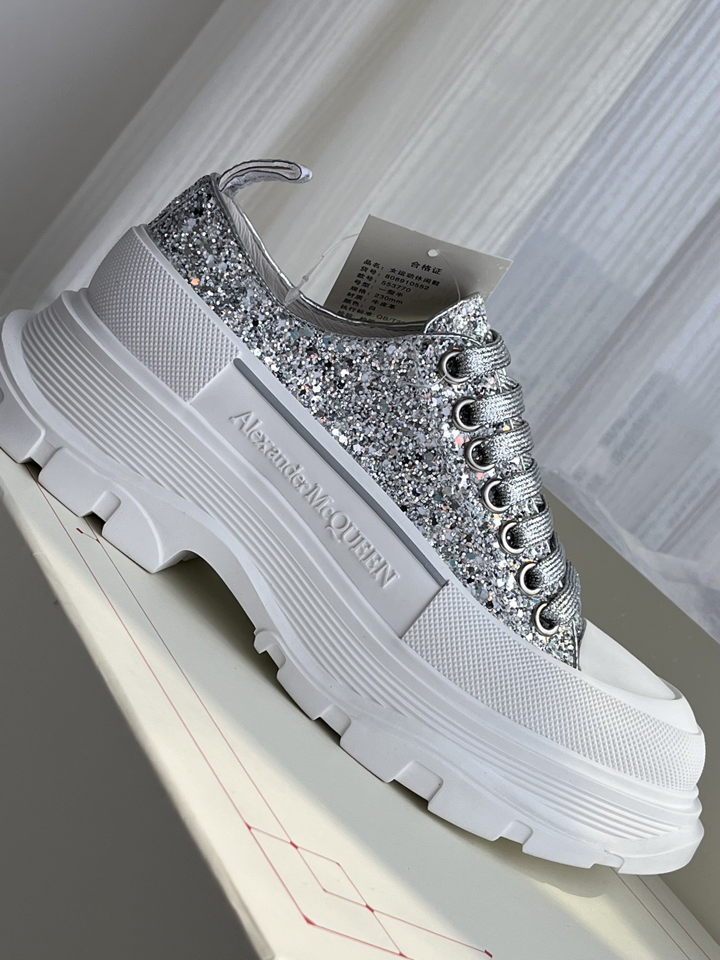 这款鞋子是AAAAA 1:1 质量 (非常棒). 使用了和原版一模一样的材料. 商标部分也保持了和亚历山大·麦昆/McQueen一样. 图片拍摄是实物鞋子拍摄, 您所收到的实物保证和我们图片一模一样.