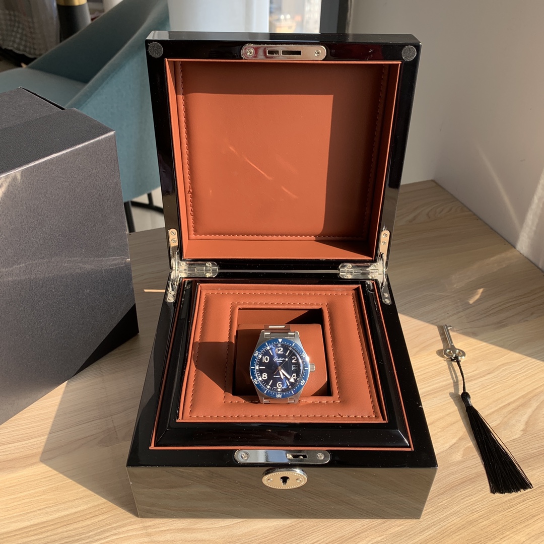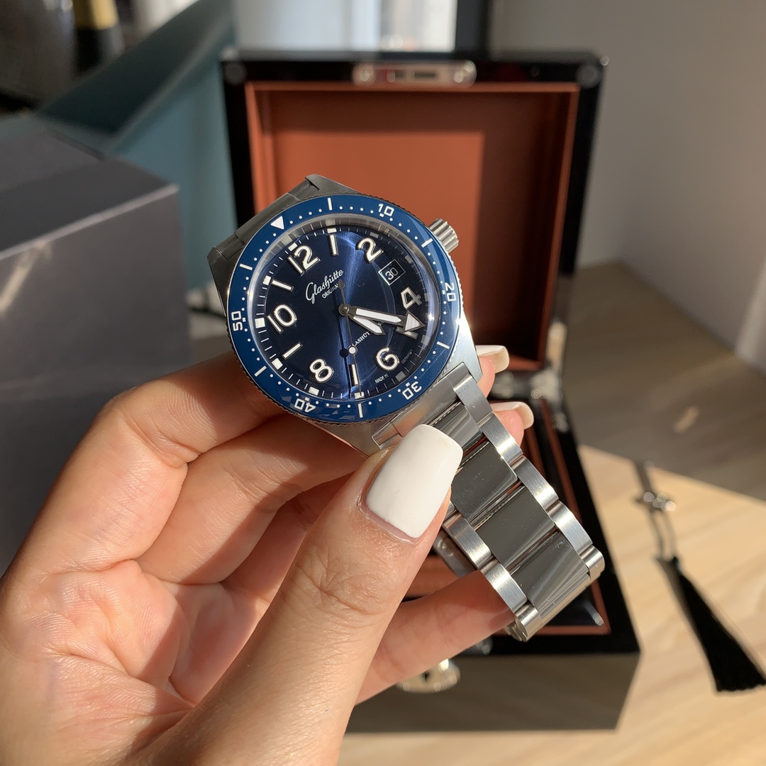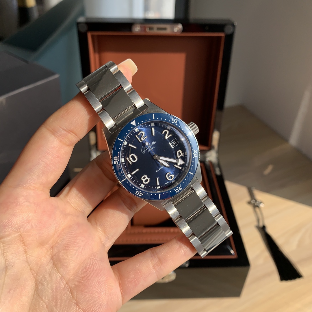 这款手表是AAAAA 1:1 质量 (非常棒). 使用了和原版一模一样的材料. 商标部分也保持了和格拉苏蒂/Glashütte Original一样. 图片拍摄是实物手表拍摄, 您所收到的实物保证和我们图片一模一样.