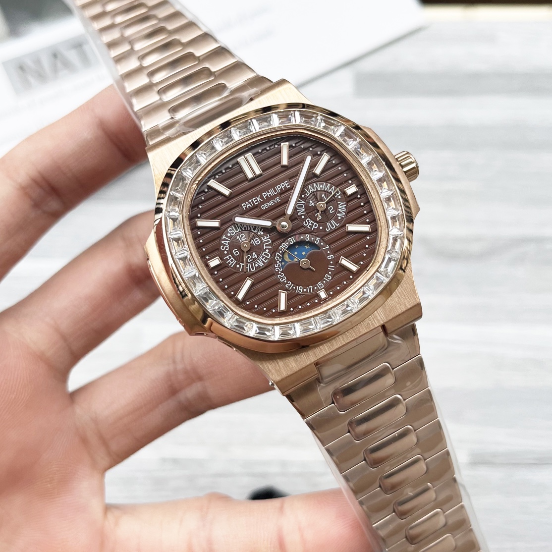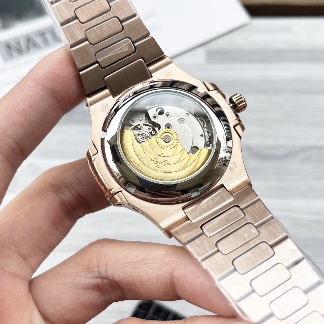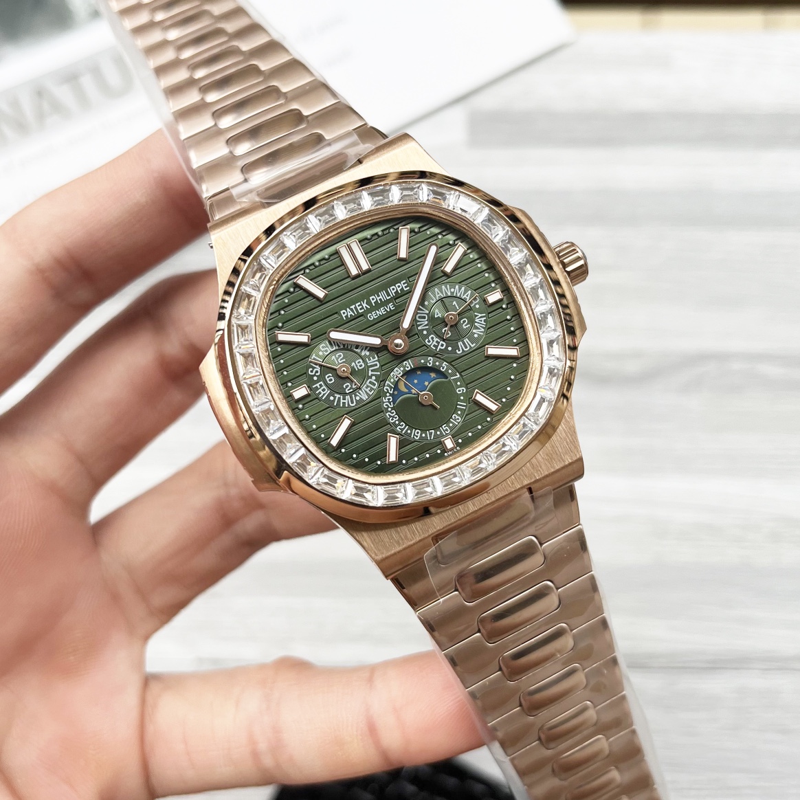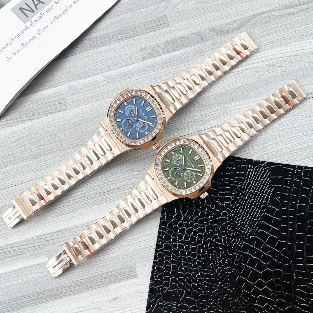 这款手表是AAAAA 1:1 质量 (非常棒). 使用了和原版一模一样的材料. 商标部分也保持了和百达翡丽/Patek Philippe一样. 图片拍摄是实物手表拍摄, 您所收到的实物保证和我们图片一模一样.