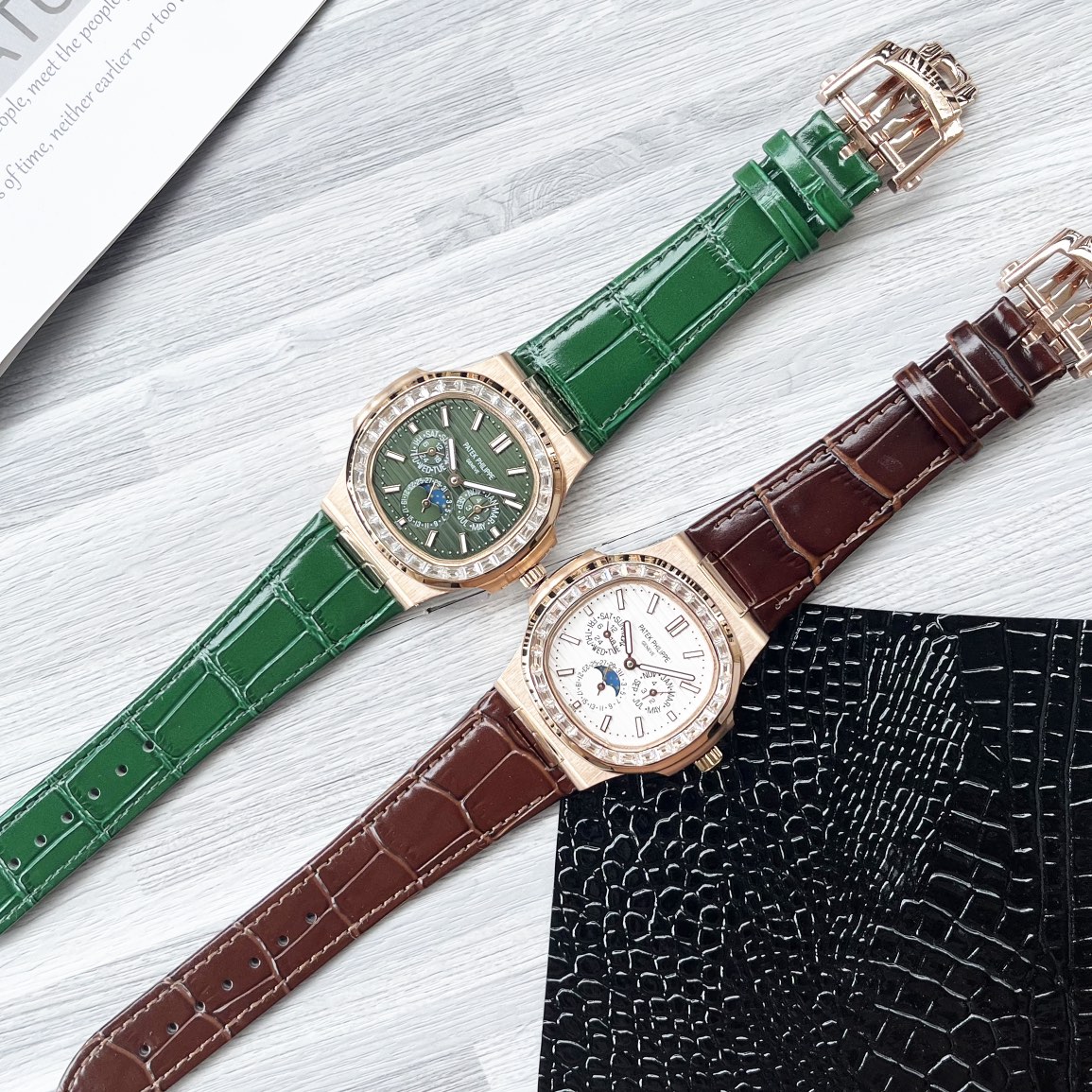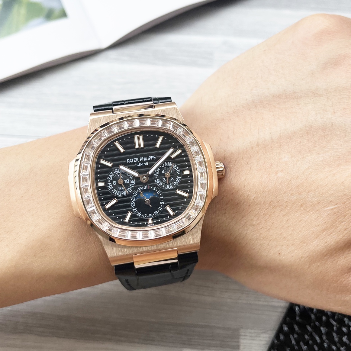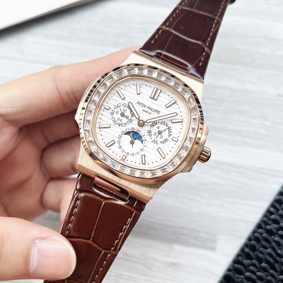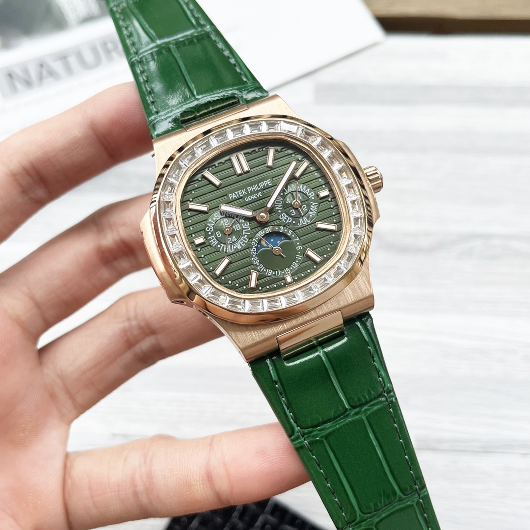 这款手表是AAAAA 1:1 质量 (非常棒). 使用了和原版一模一样的材料. 商标部分也保持了和百达翡丽/Patek Philippe一样. 图片拍摄是实物手表拍摄, 您所收到的实物保证和我们图片一模一样.