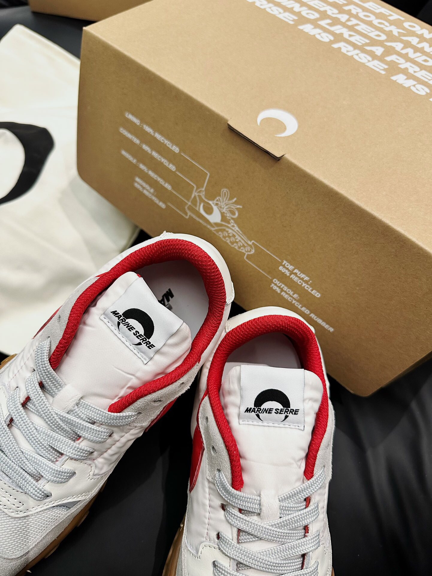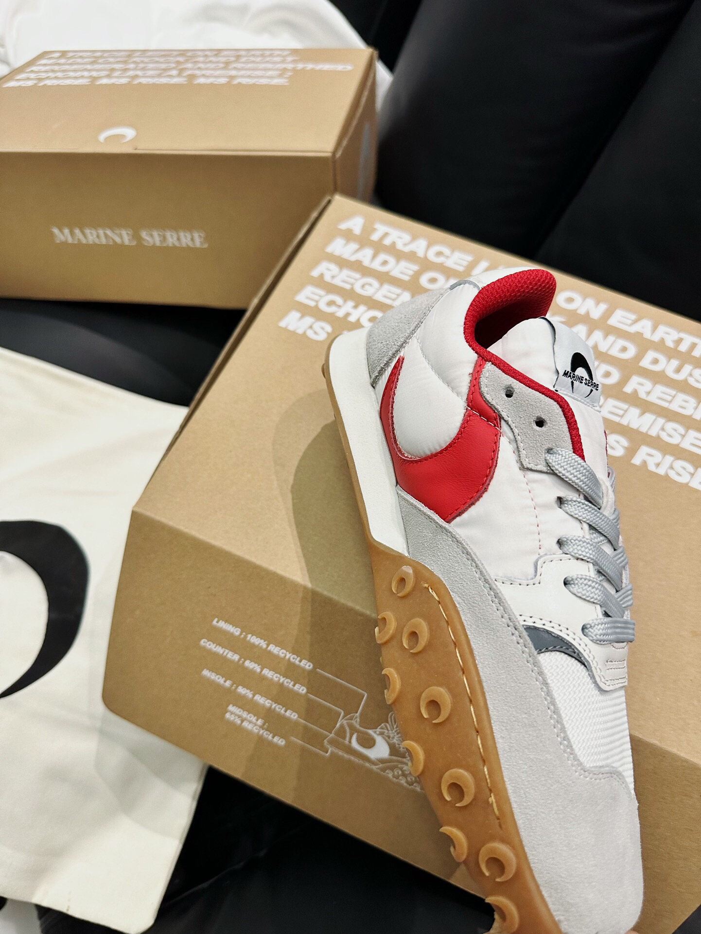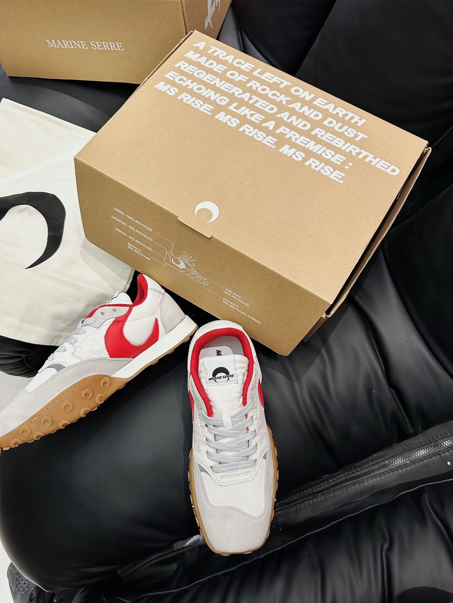 这款鞋子是AAAAA 1:1 质量 (非常棒). 使用了和原版一模一样的材料. 商标部分也保持了和Marine Serre一样. 图片拍摄是实物鞋子拍摄, 您所收到的实物保证和我们图片一模一样.
