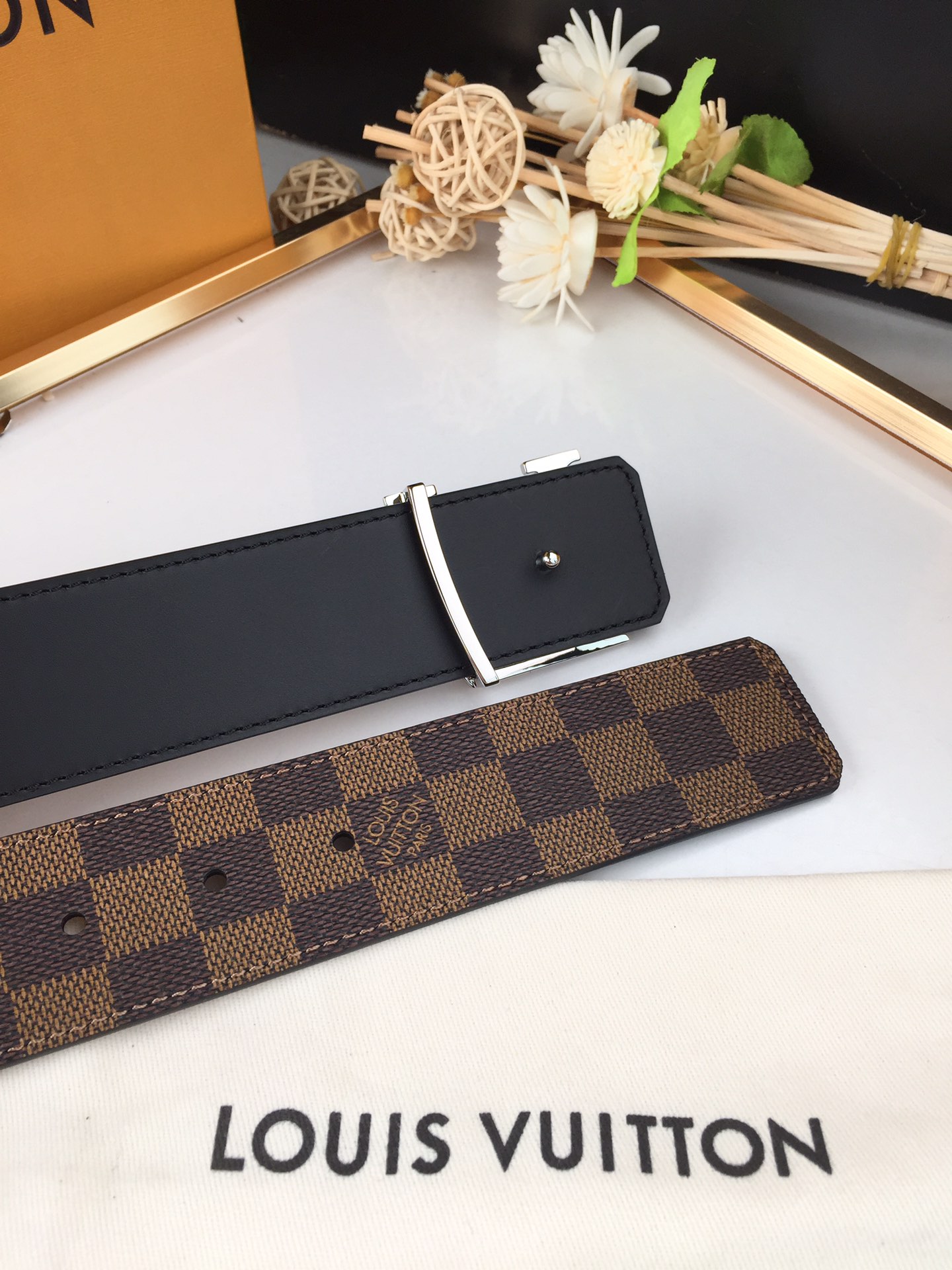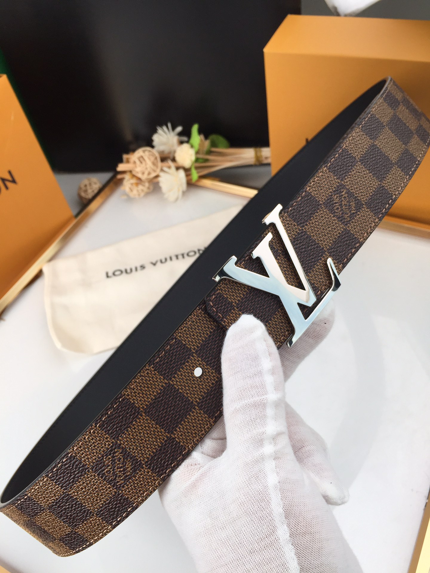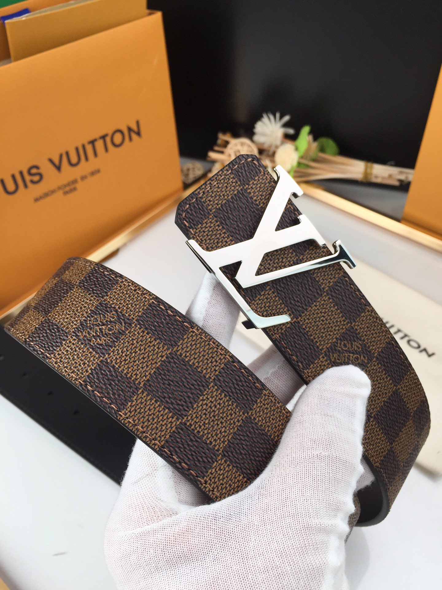 这款皮带是AAAAA 1:1 质量 (非常棒). 使用了和原版一模一样的材料. 商标部分也保持了和路易威登/Louis Vuitton一样. 图片拍摄是实物皮带拍摄, 您所收到的实物保证和我们图片一模一样.