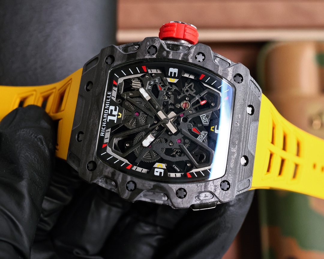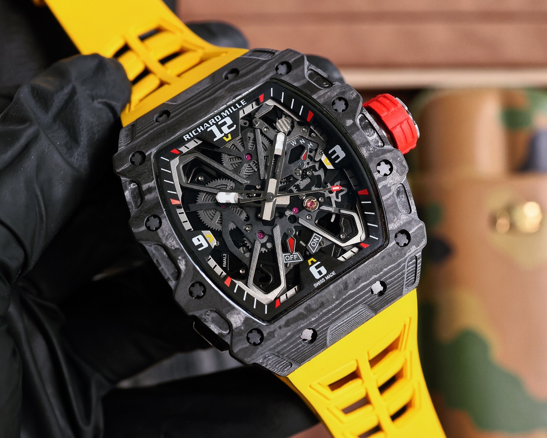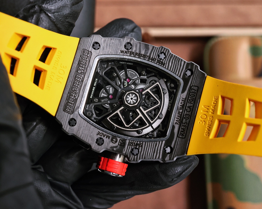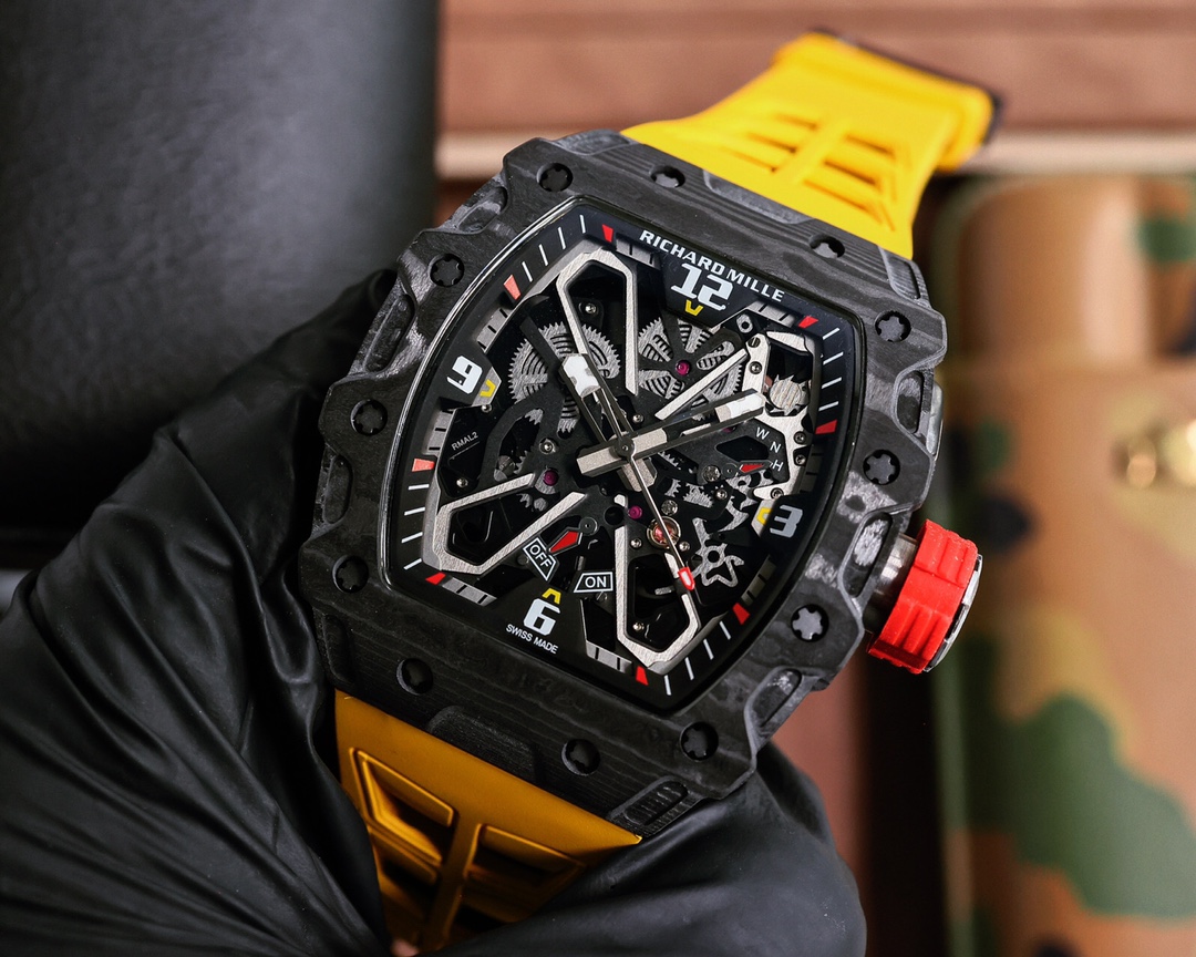 这款手表是AAAAA 1:1 质量 (非常棒). 使用了和原版一模一样的材料. 商标部分也保持了和理查德·米尔/Richard Mille一样. 图片拍摄是实物手表拍摄, 您所收到的实物保证和我们图片一模一样.