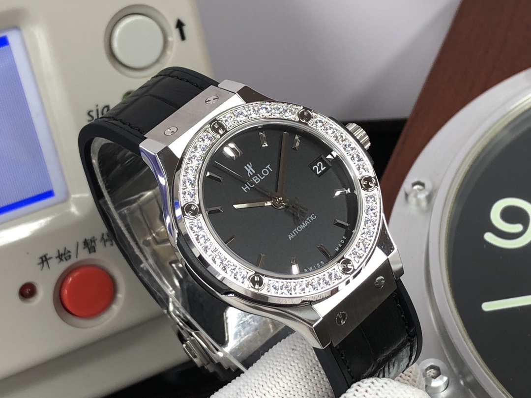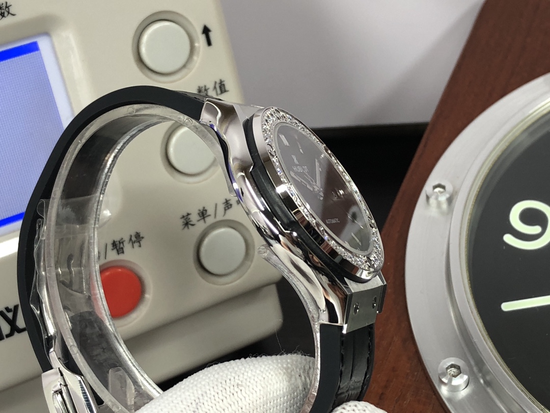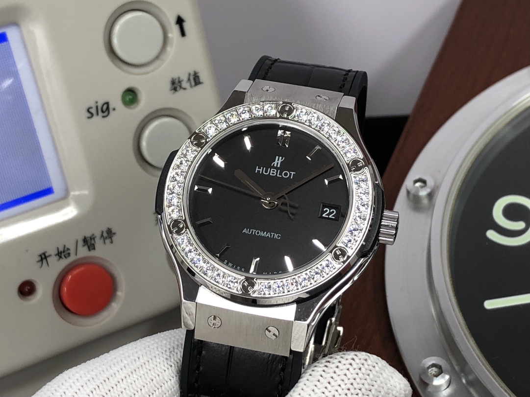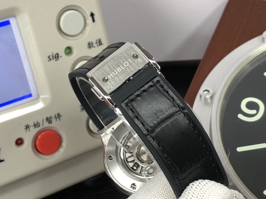 这款手表是AAAAA 1:1 质量 (非常棒). 使用了和原版一模一样的材料. 商标部分也保持了和Hublot一样. 图片拍摄是实物手表拍摄, 您所收到的实物保证和我们图片一模一样.
