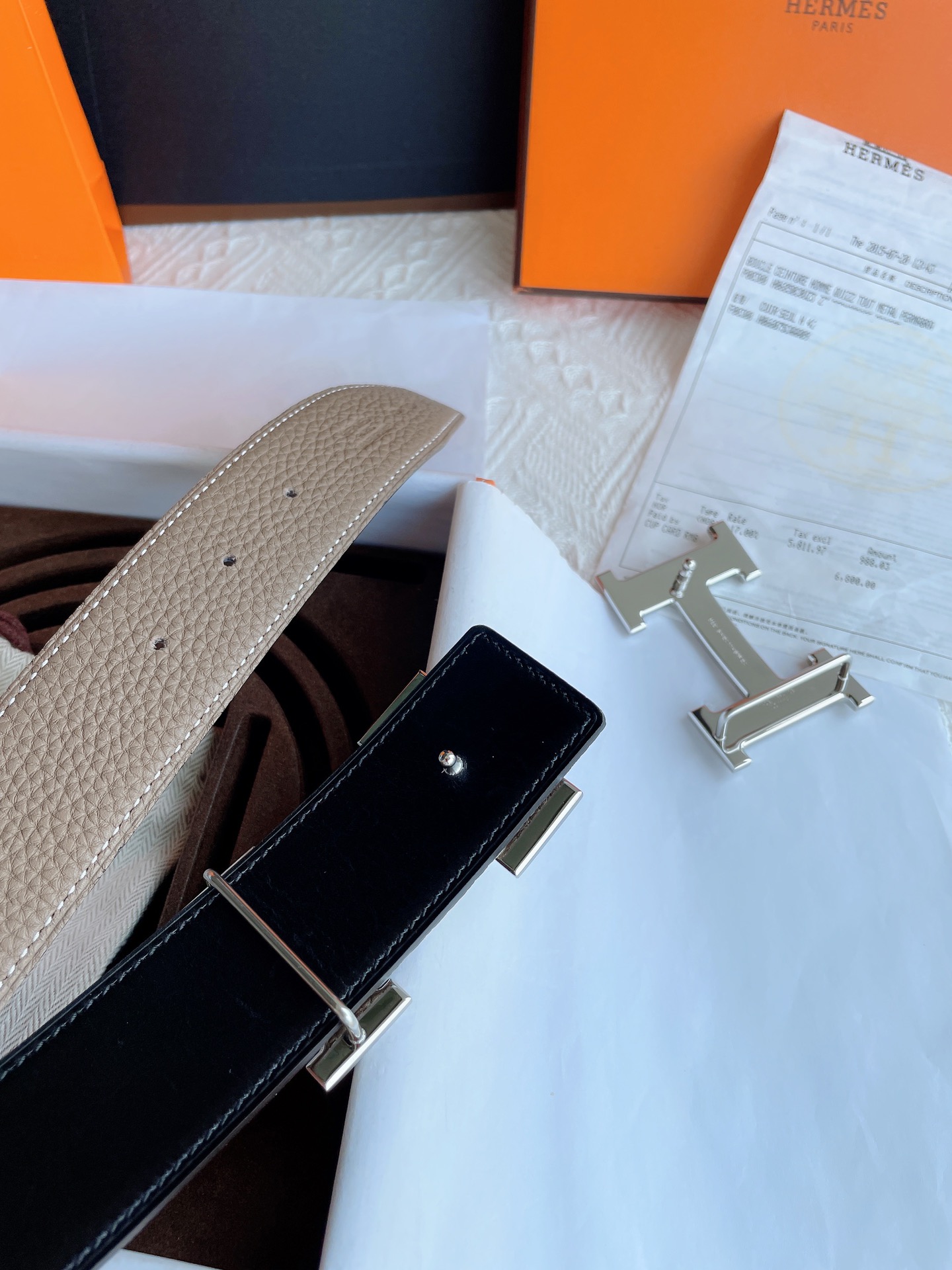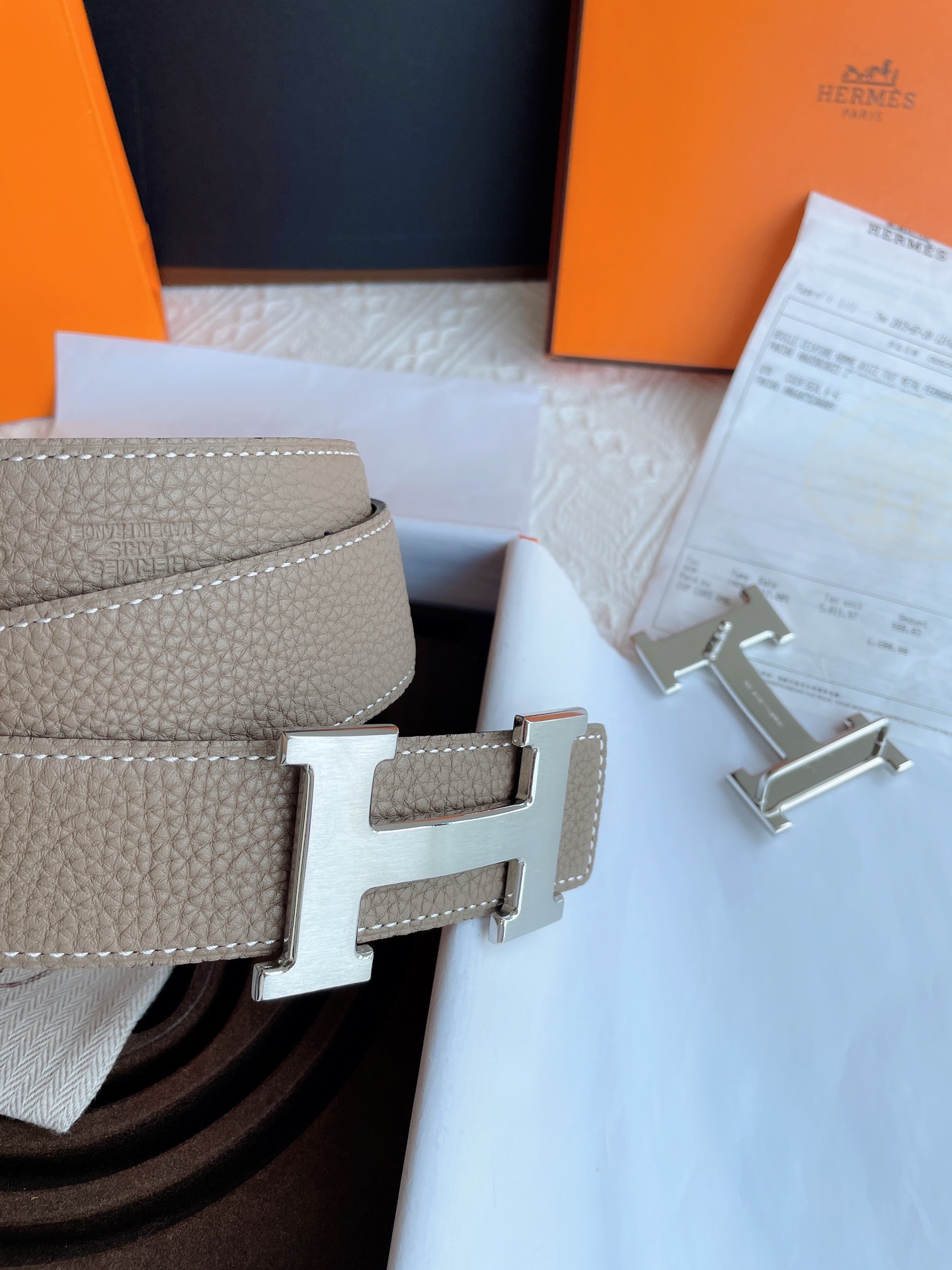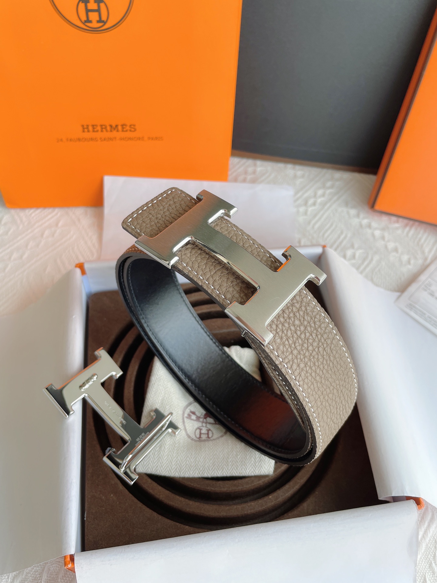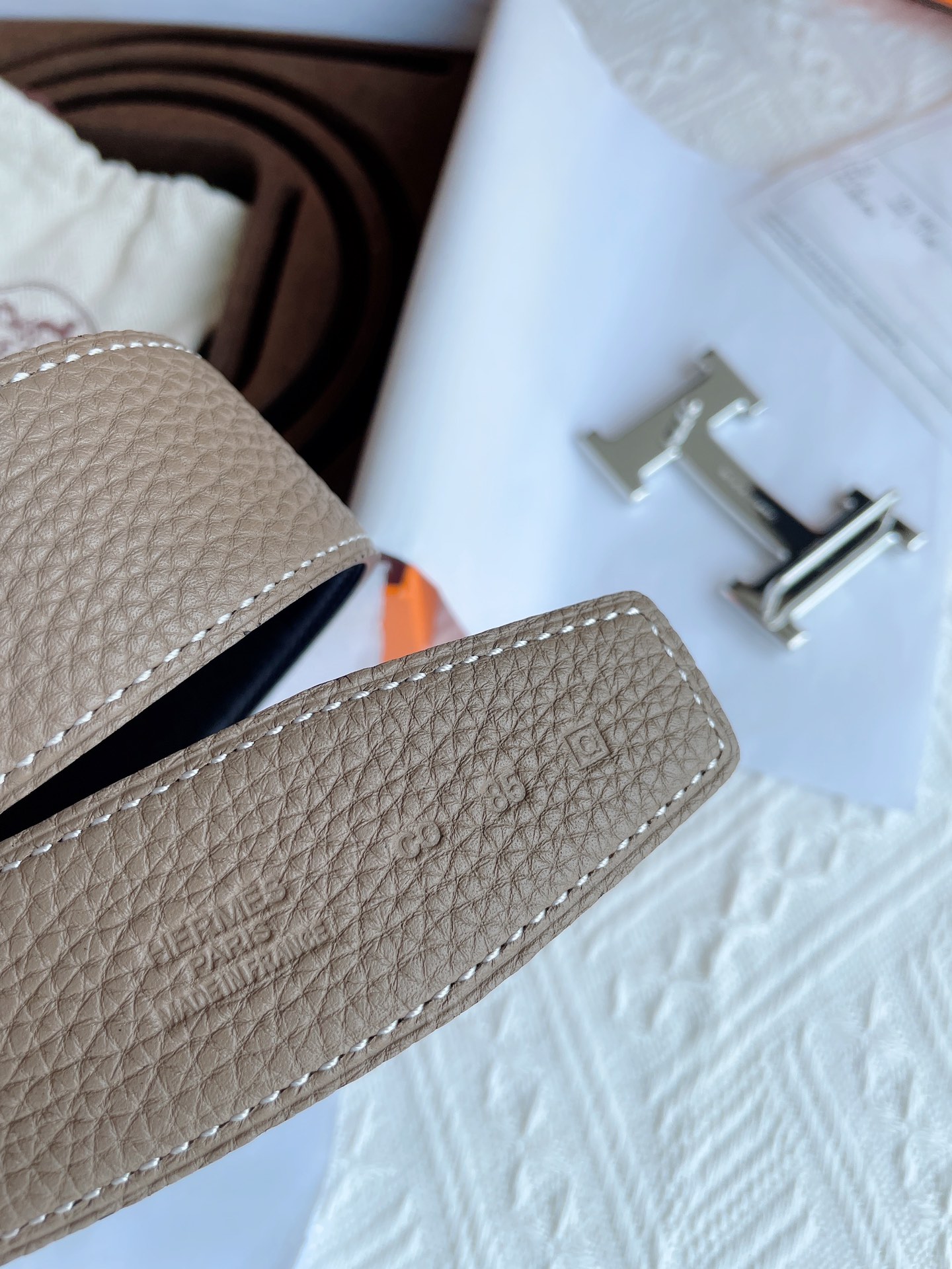 这款皮带是AAAAA 1:1 质量 (非常棒). 使用了和原版一模一样的材料. 商标部分也保持了和爱马仕/Hermes一样. 图片拍摄是实物皮带拍摄, 您所收到的实物保证和我们图片一模一样.