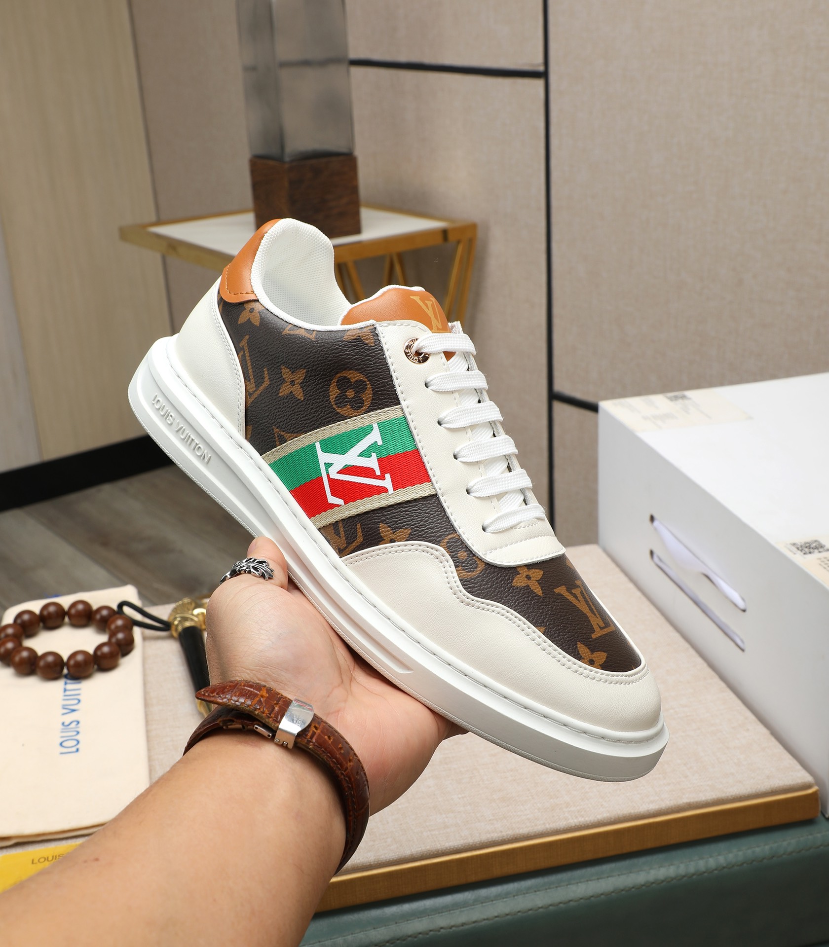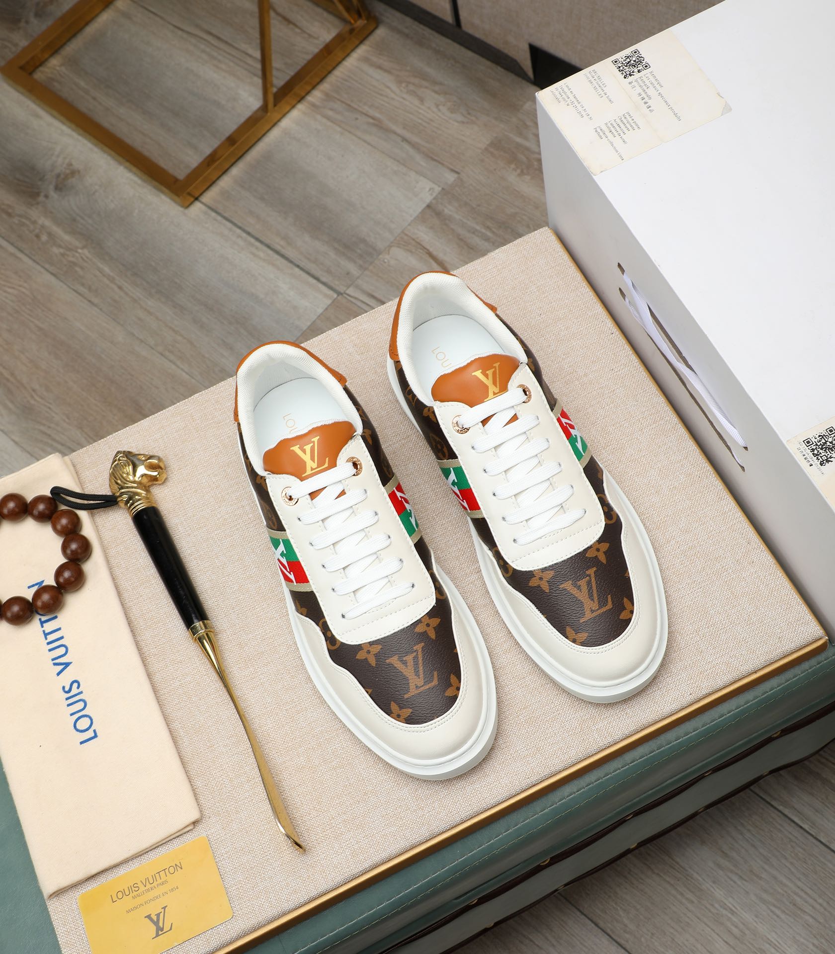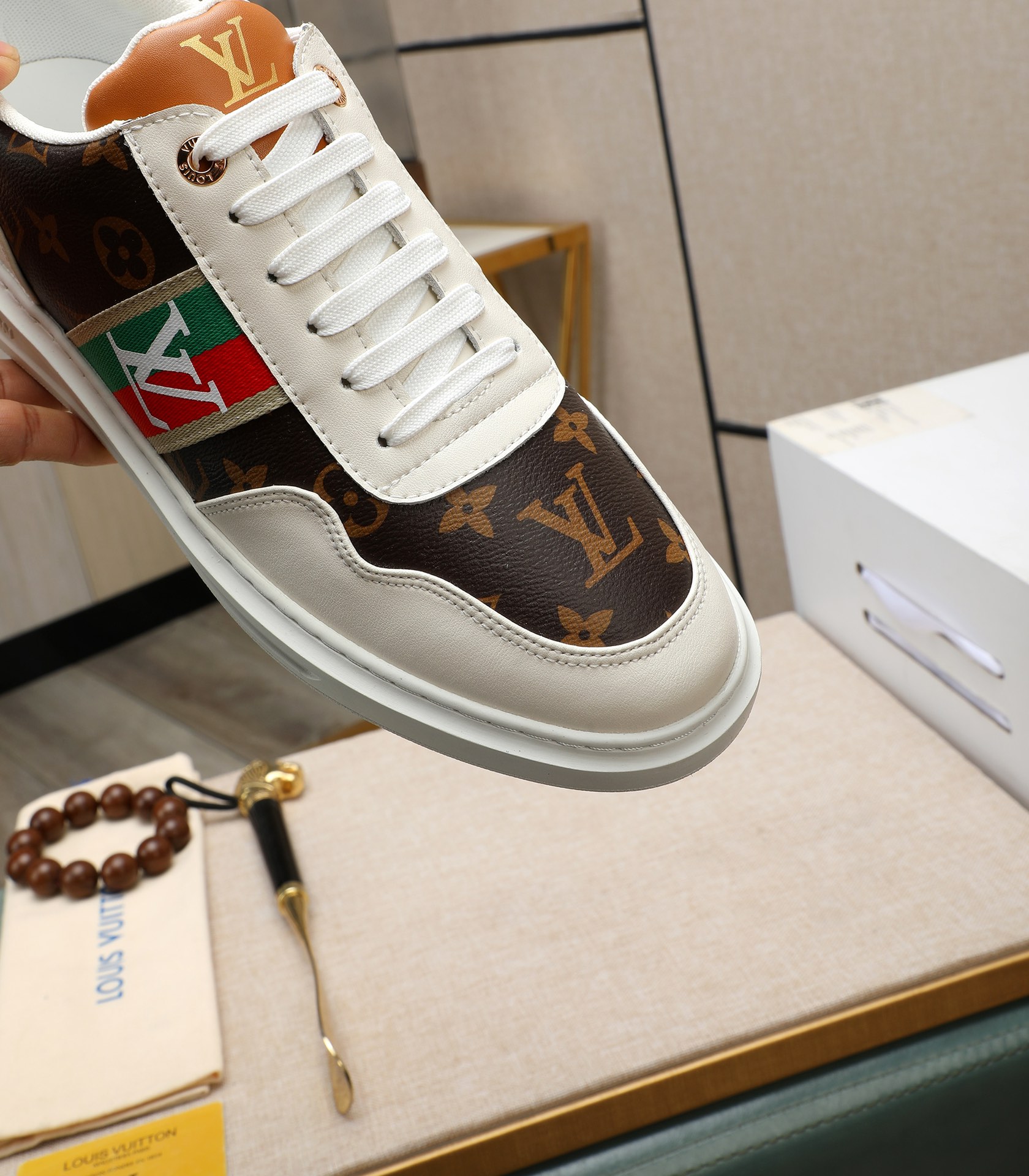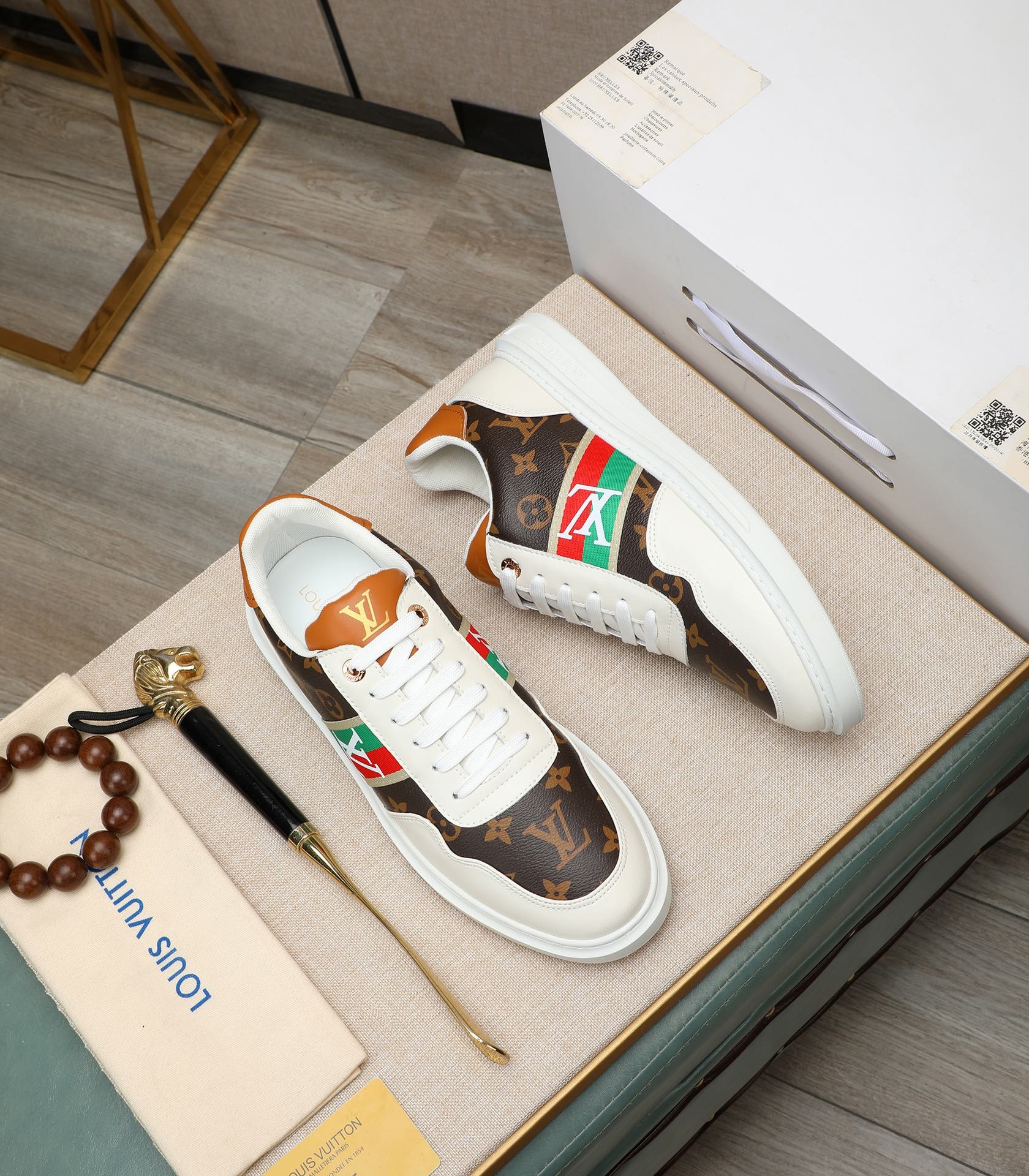 这款鞋子是AAAAA 1:1 质量 (非常棒). 使用了和原版一模一样的材料. 商标部分也保持了和路易威登/Louis Vuitton一样. 图片拍摄是实物鞋子拍摄, 您所收到的实物保证和我们图片一模一样.