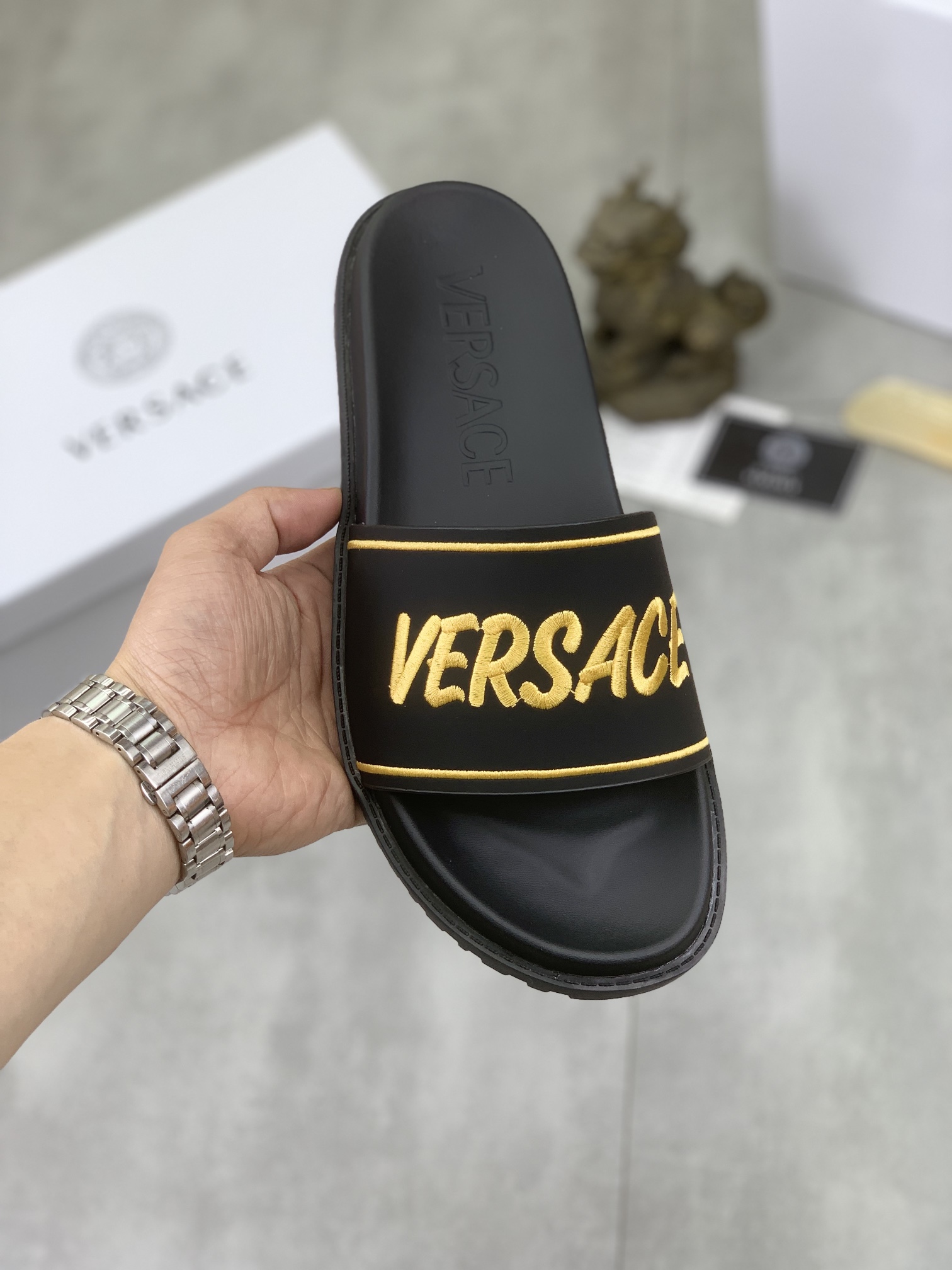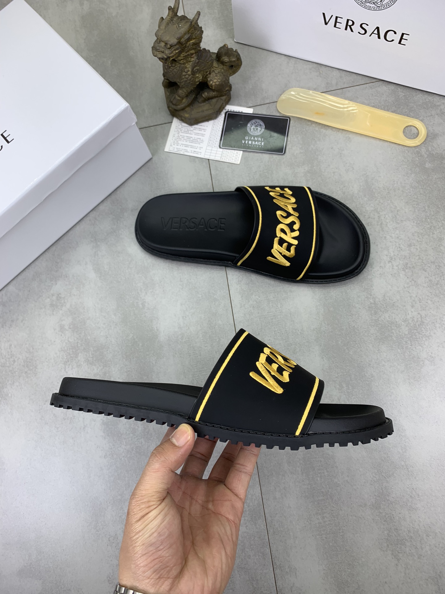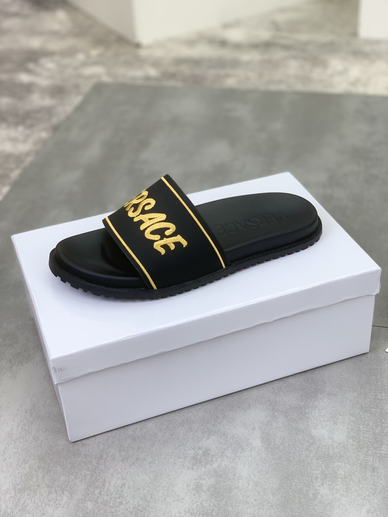 这款鞋子是AAAAA 1:1 质量 (非常棒). 使用了和原版一模一样的材料. 商标部分也保持了和范思哲/Versace一样. 图片拍摄是实物鞋子拍摄, 您所收到的实物保证和我们图片一模一样.
