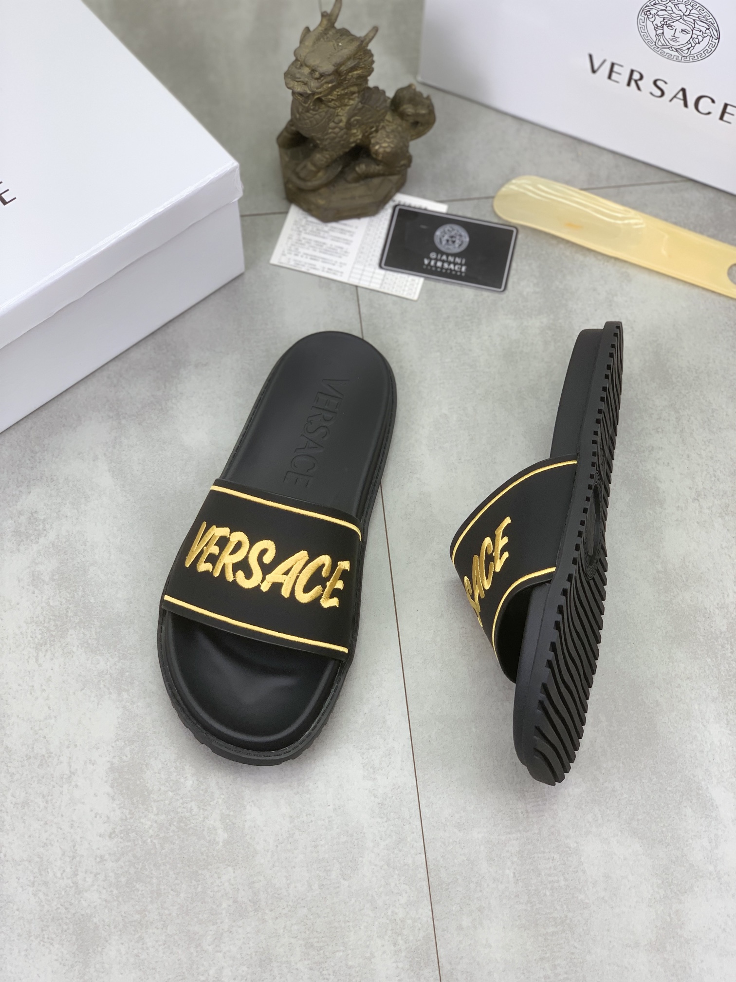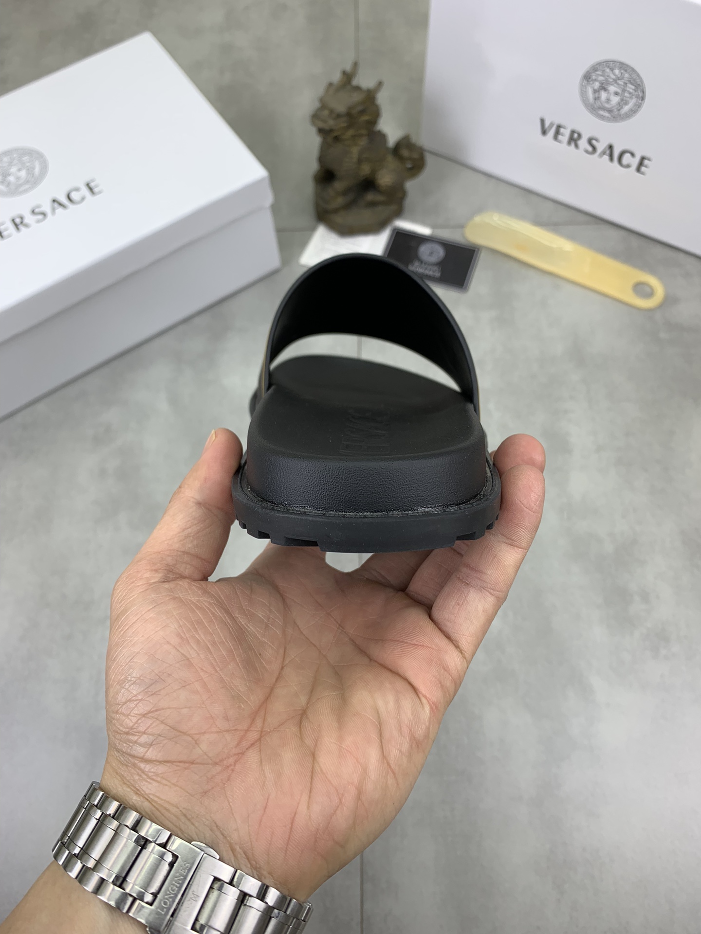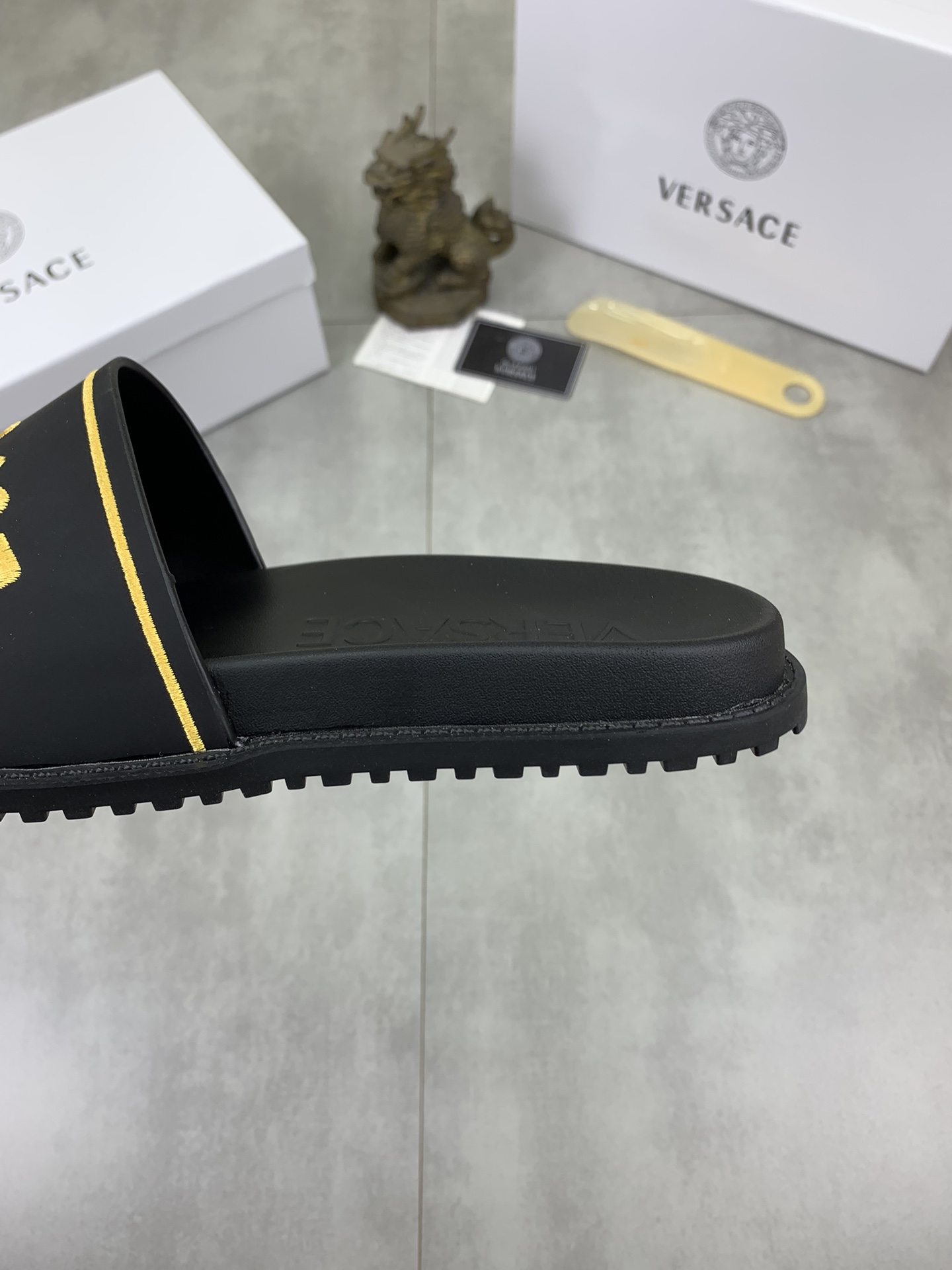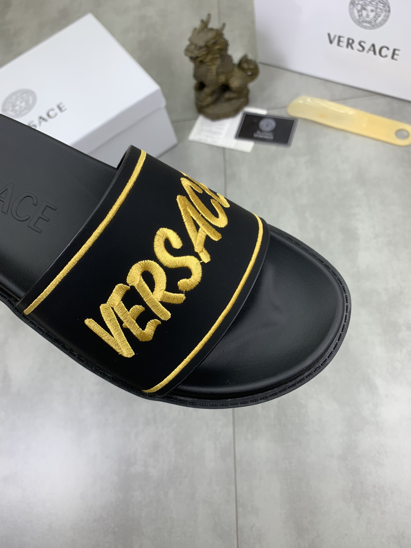 这款鞋子是AAAAA 1:1 质量 (非常棒). 使用了和原版一模一样的材料. 商标部分也保持了和范思哲/Versace一样. 图片拍摄是实物鞋子拍摄, 您所收到的实物保证和我们图片一模一样.