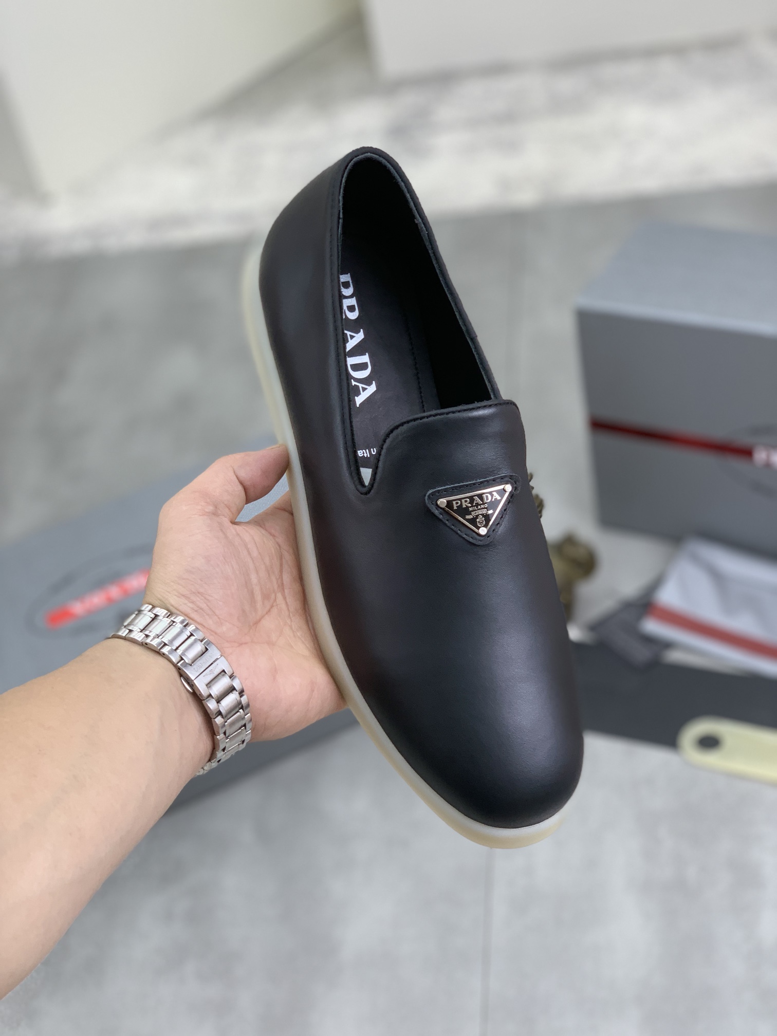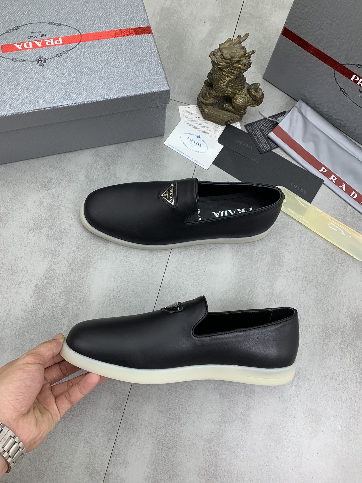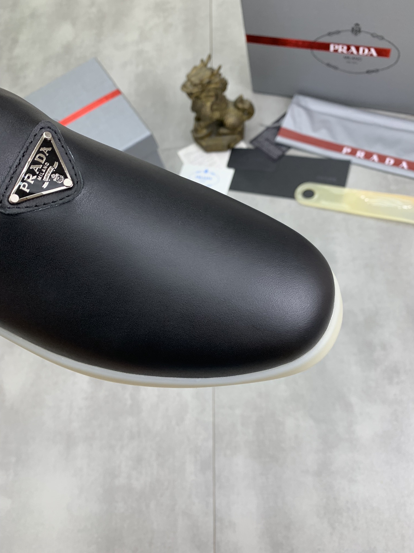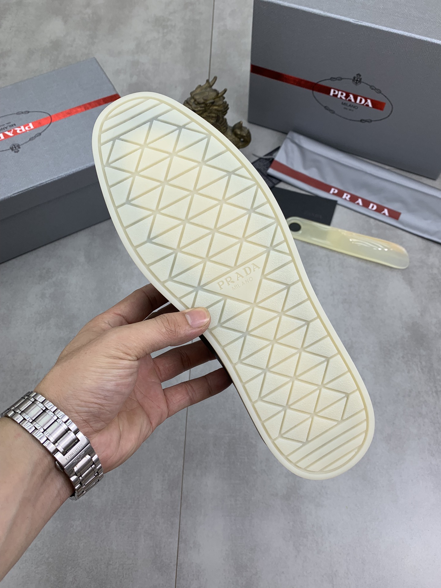 这款鞋子是AAAAA 1:1 质量 (非常棒). 使用了和原版一模一样的材料. 商标部分也保持了和普拉达/Prada一样. 图片拍摄是实物鞋子拍摄, 您所收到的实物保证和我们图片一模一样.