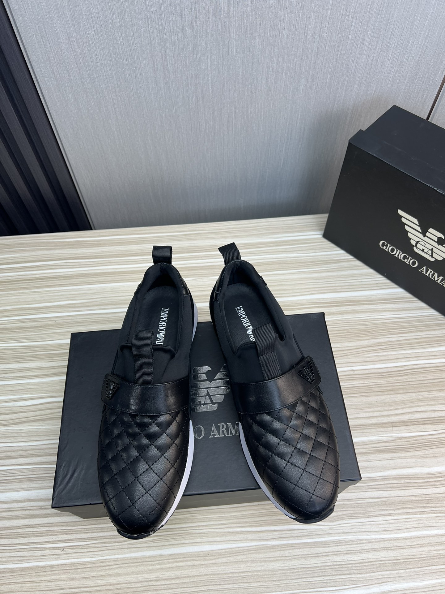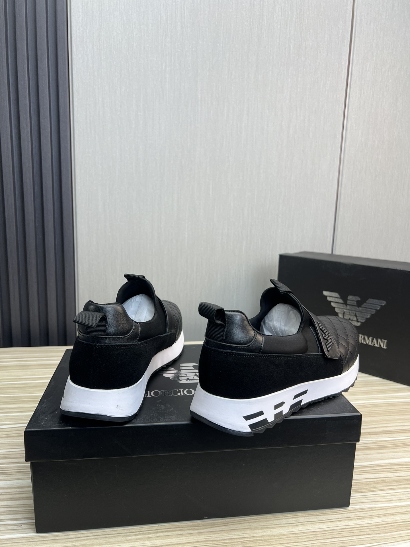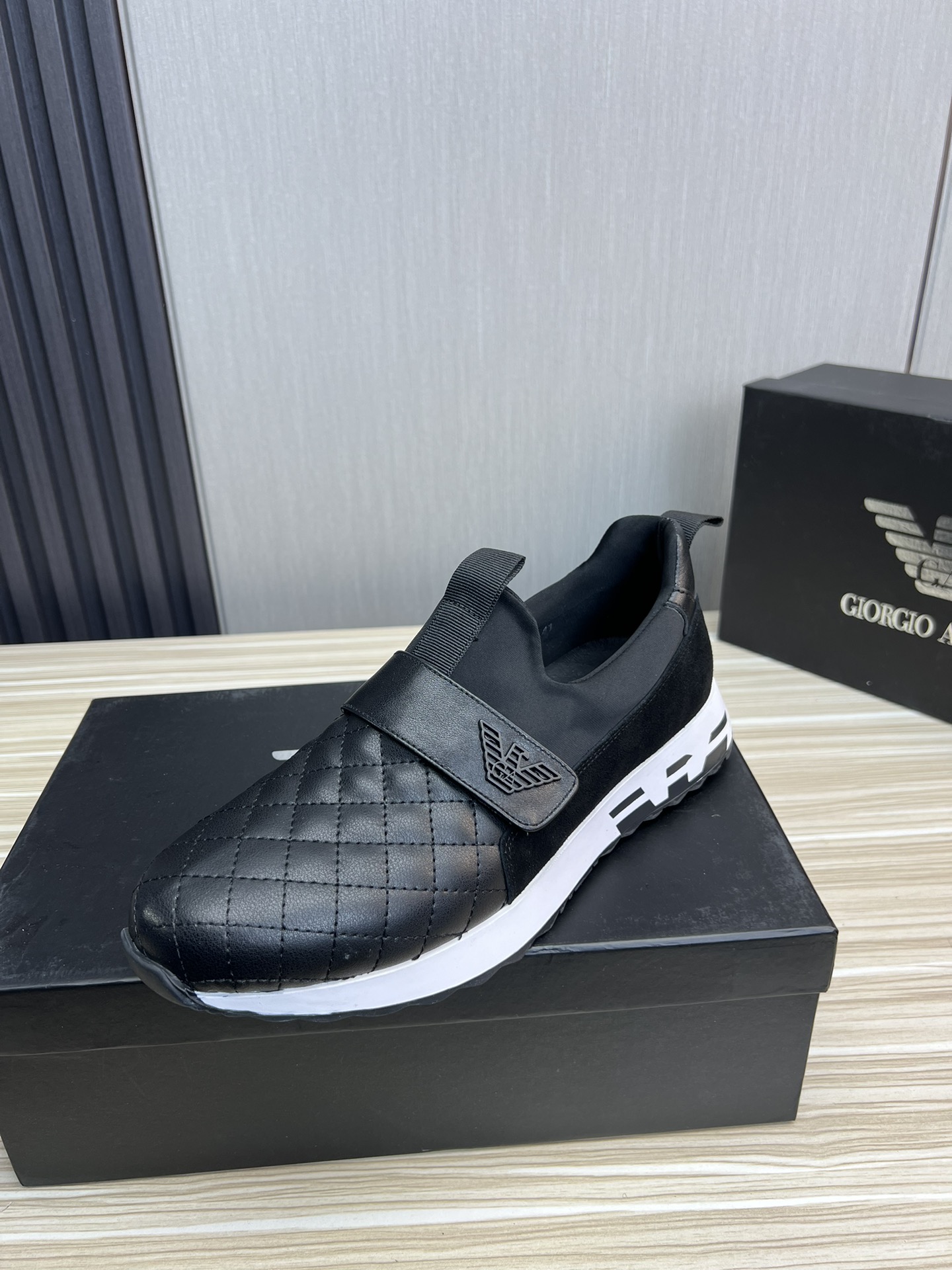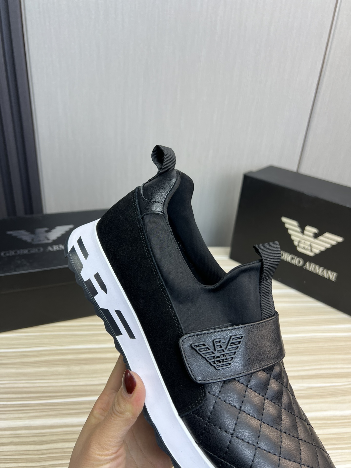 这款鞋子是AAAAA 1:1 质量 (非常棒). 使用了和原版一模一样的材料. 商标部分也保持了和阿玛尼/Armani一样. 图片拍摄是实物鞋子拍摄, 您所收到的实物保证和我们图片一模一样.