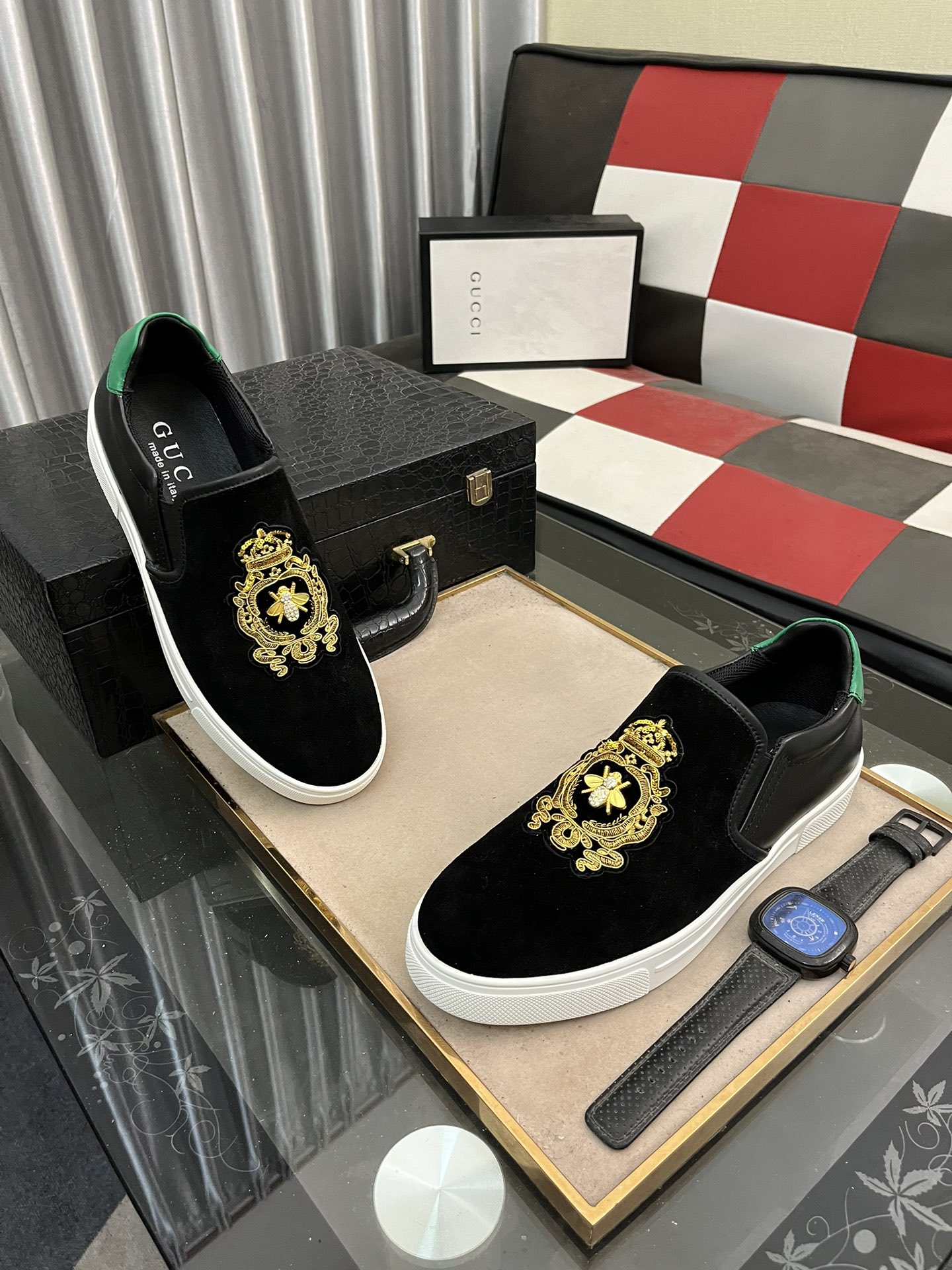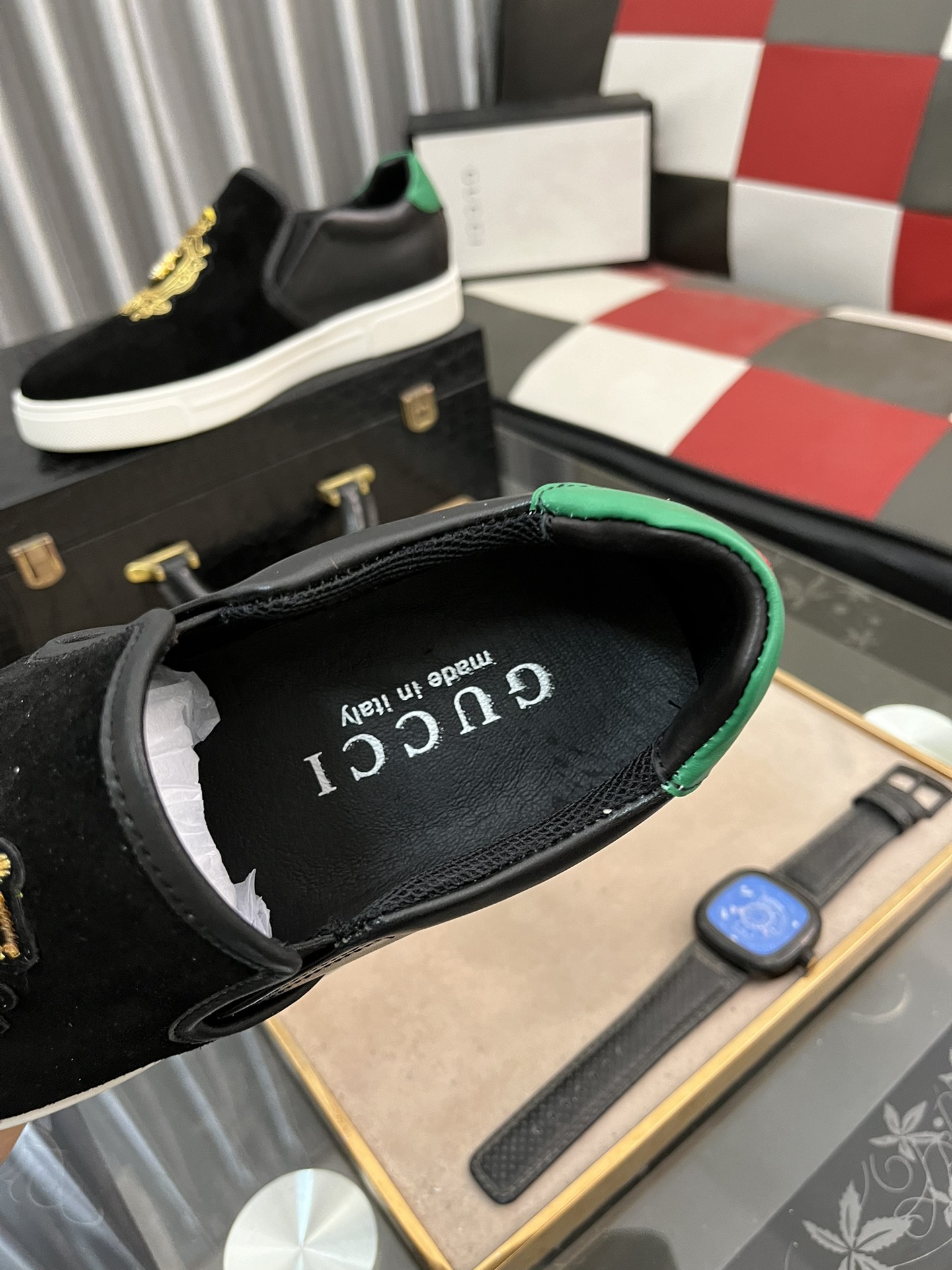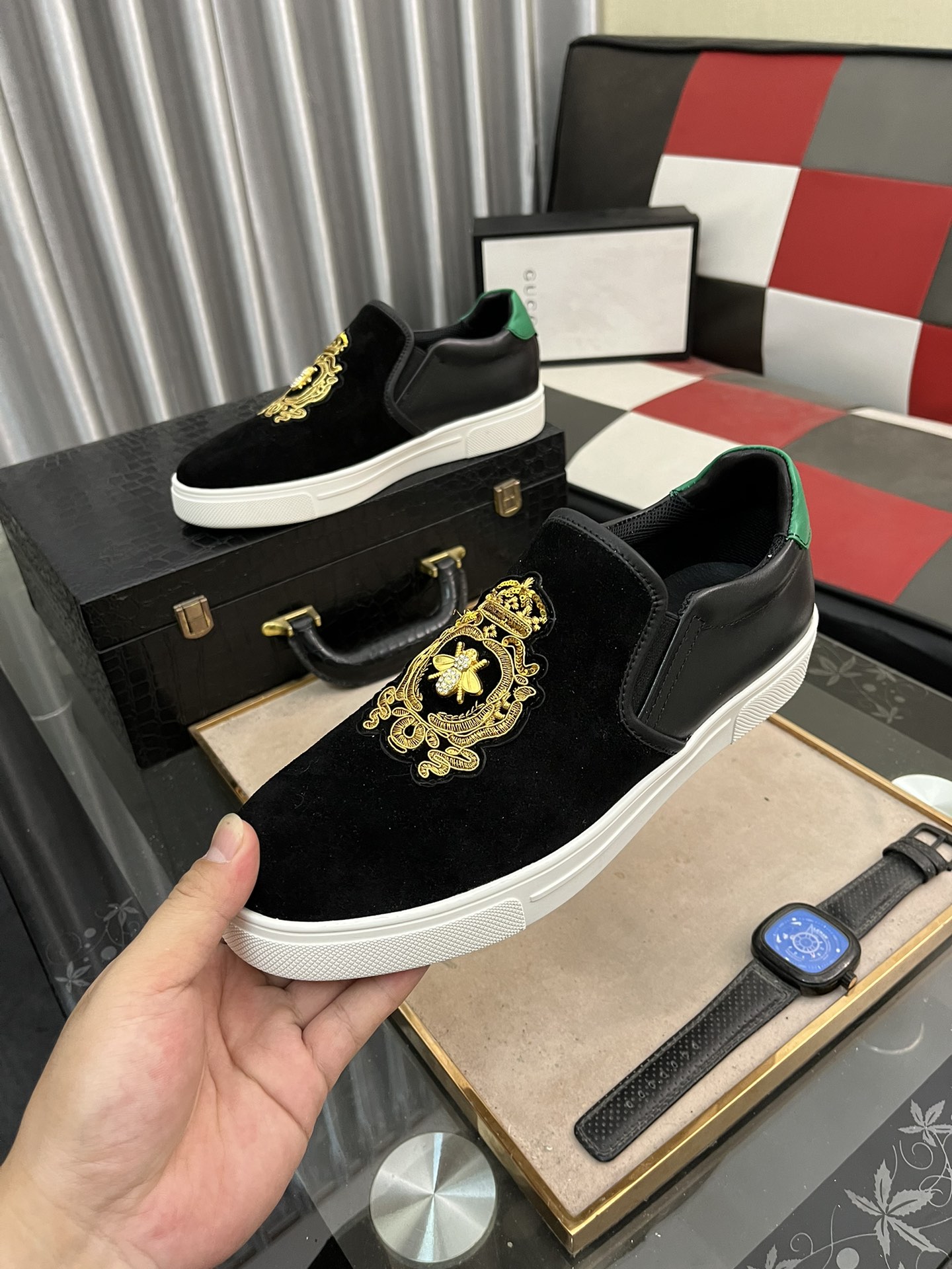 这款鞋子是AAAAA 1:1 质量 (非常棒). 使用了和原版一模一样的材料. 商标部分也保持了和古奇/Gucci一样. 图片拍摄是实物鞋子拍摄, 您所收到的实物保证和我们图片一模一样.