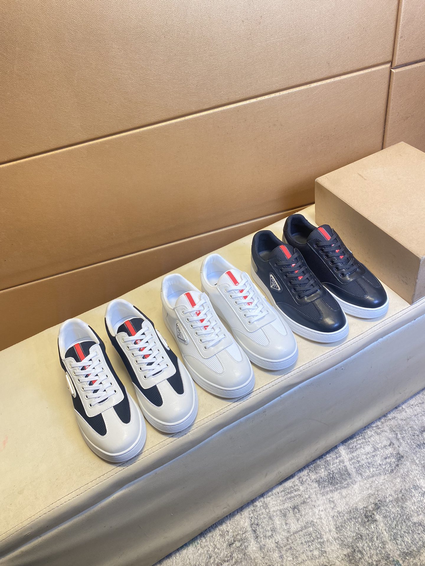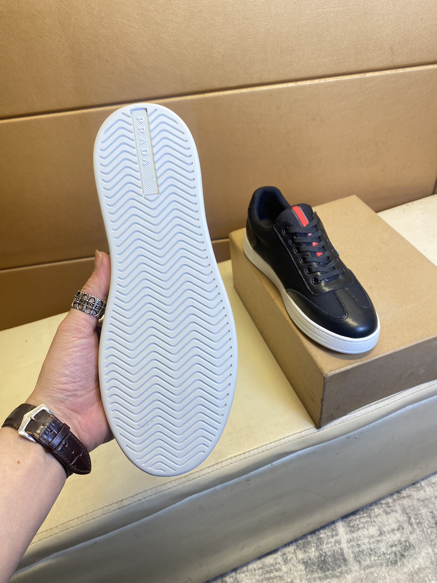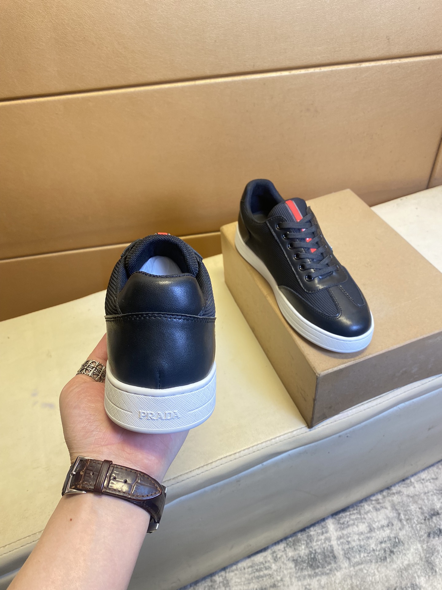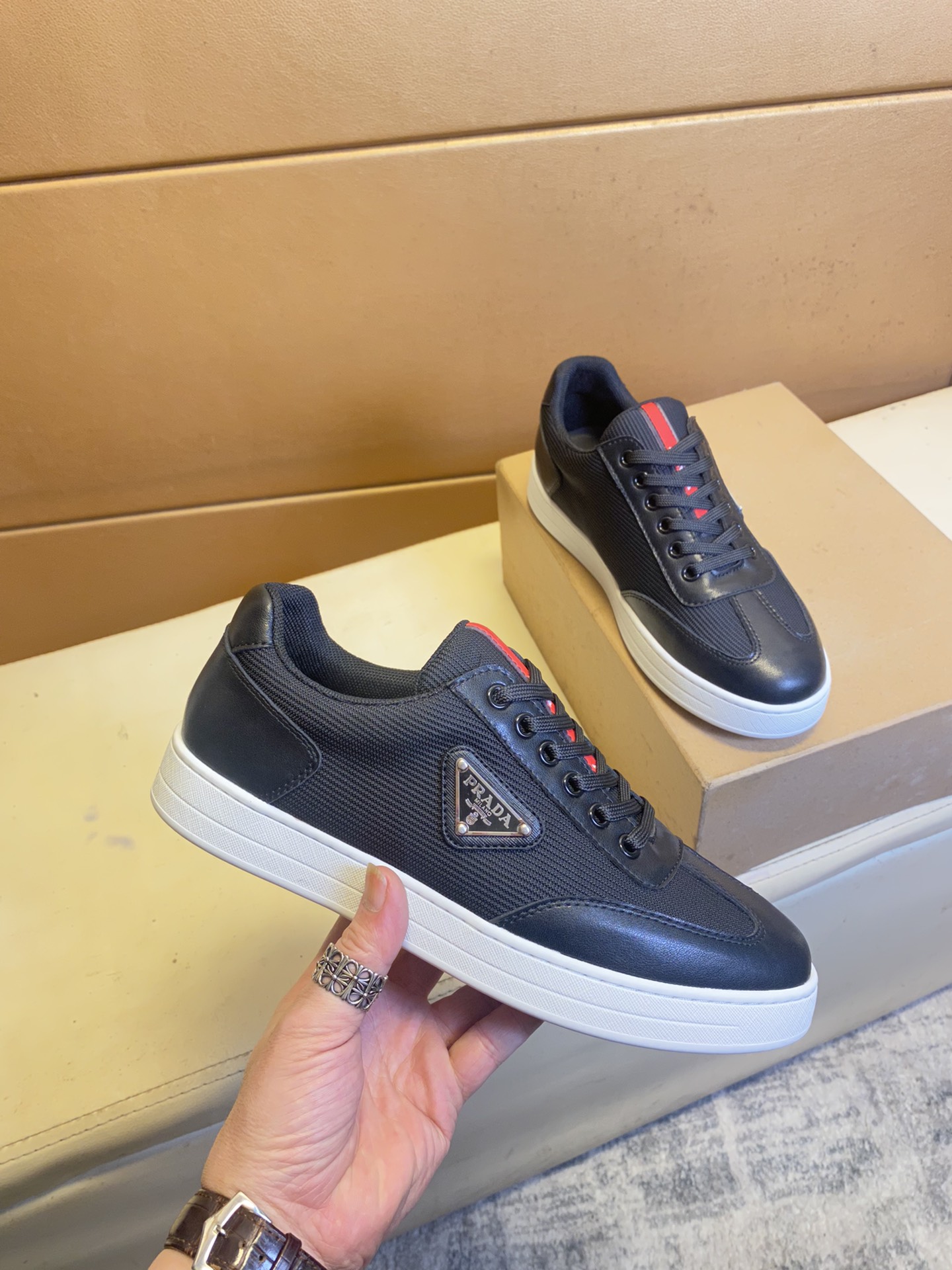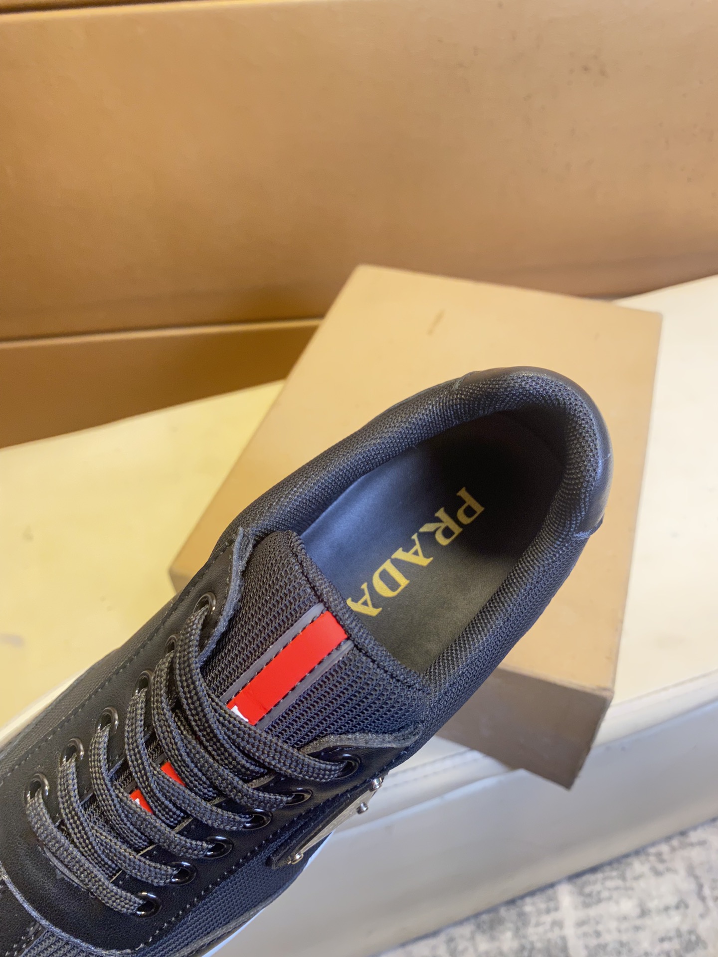 这款鞋子是AAAAA 1:1 质量 (非常棒). 使用了和原版一模一样的材料. 商标部分也保持了和普拉达/Prada一样. 图片拍摄是实物鞋子拍摄, 您所收到的实物保证和我们图片一模一样.