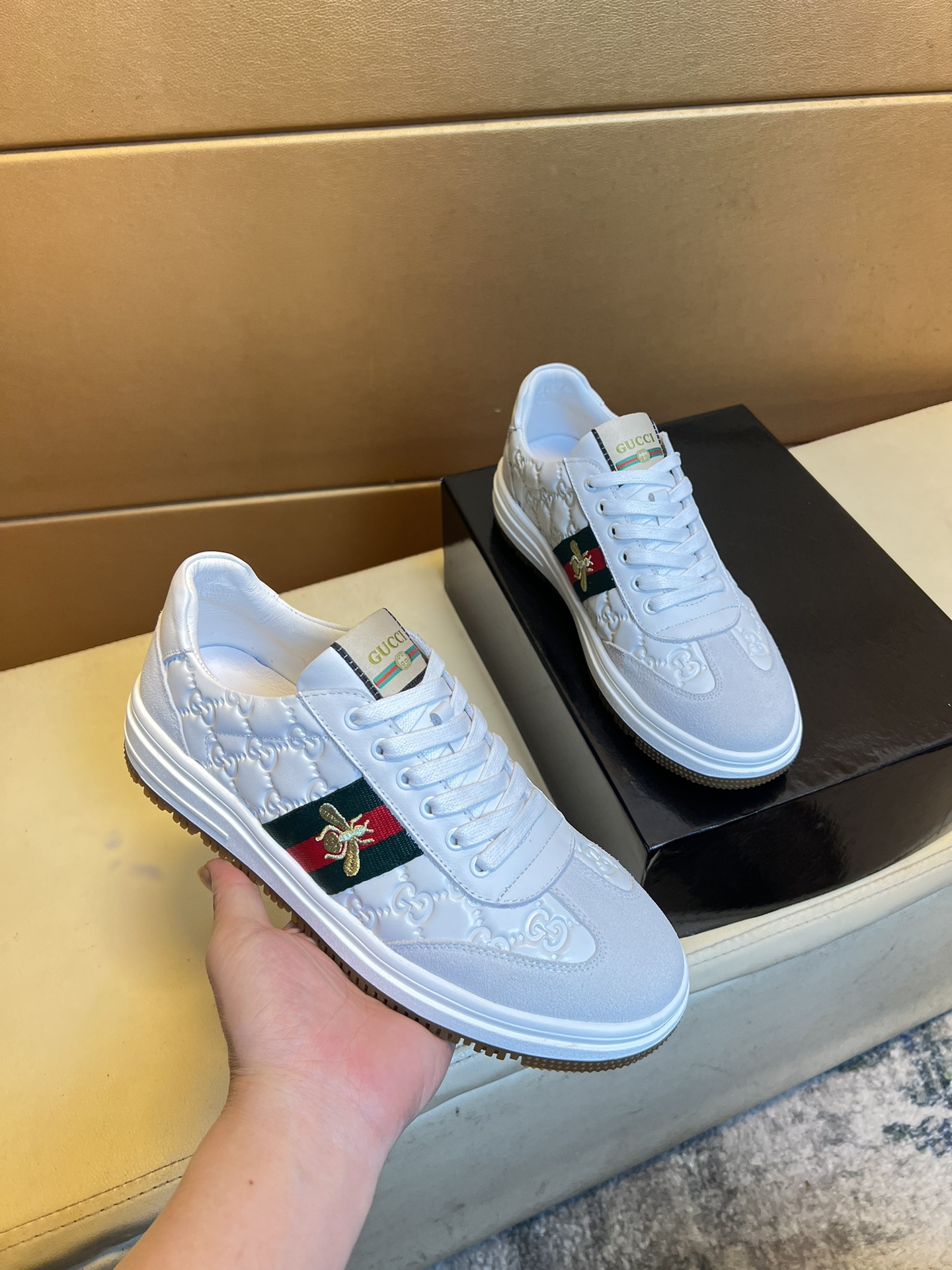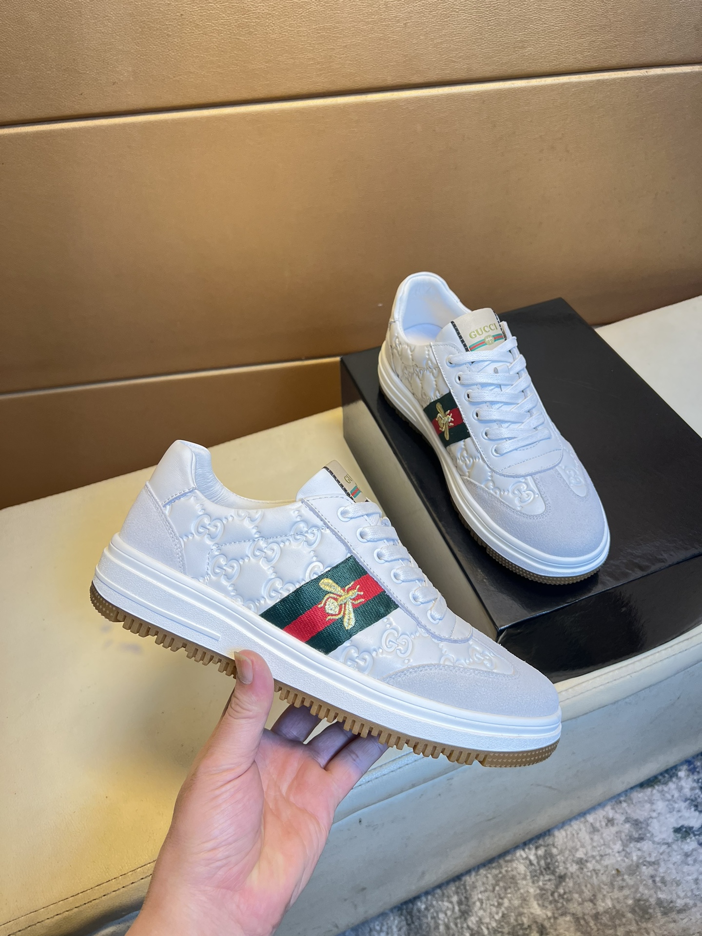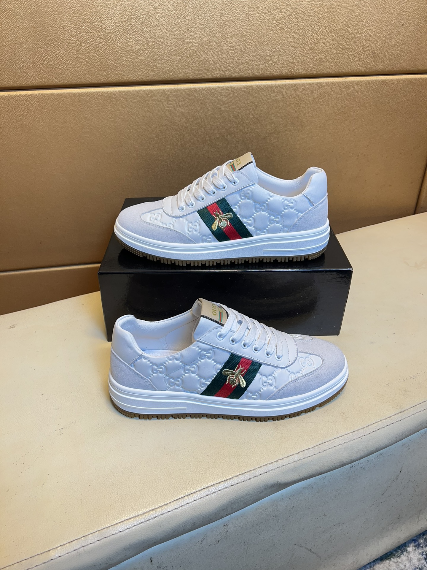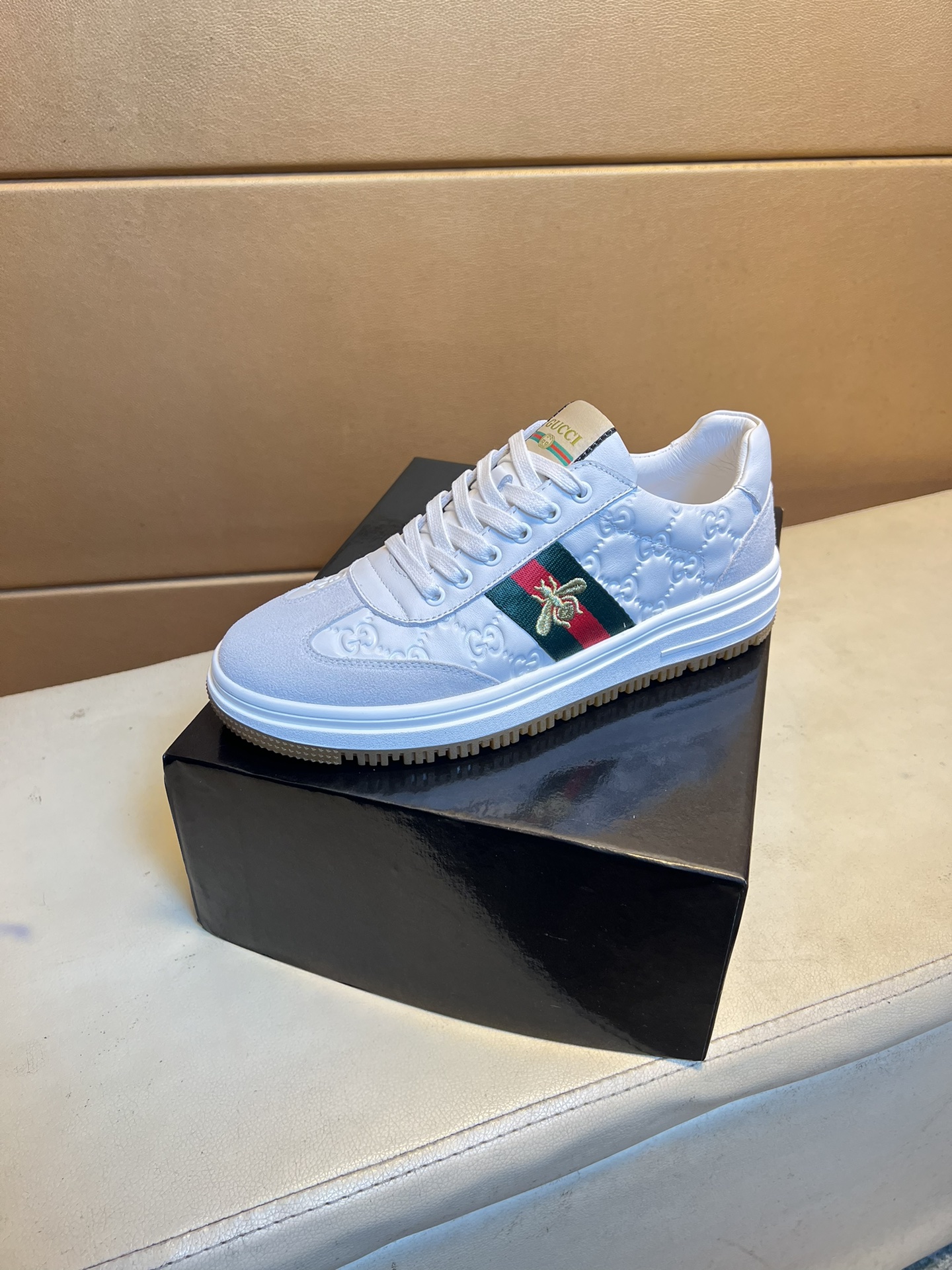 这款鞋子是AAAAA 1:1 质量 (非常棒). 使用了和原版一模一样的材料. 商标部分也保持了和古奇/Gucci一样. 图片拍摄是实物鞋子拍摄, 您所收到的实物保证和我们图片一模一样.