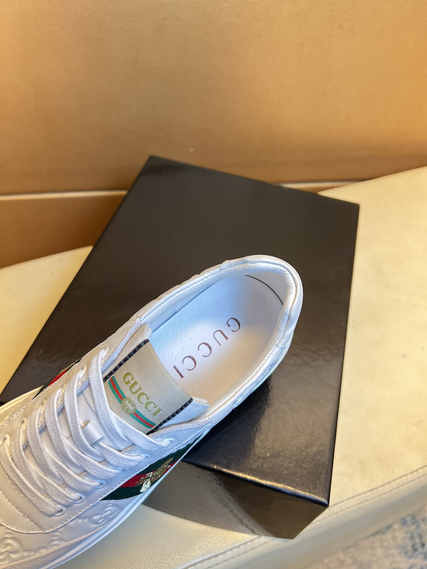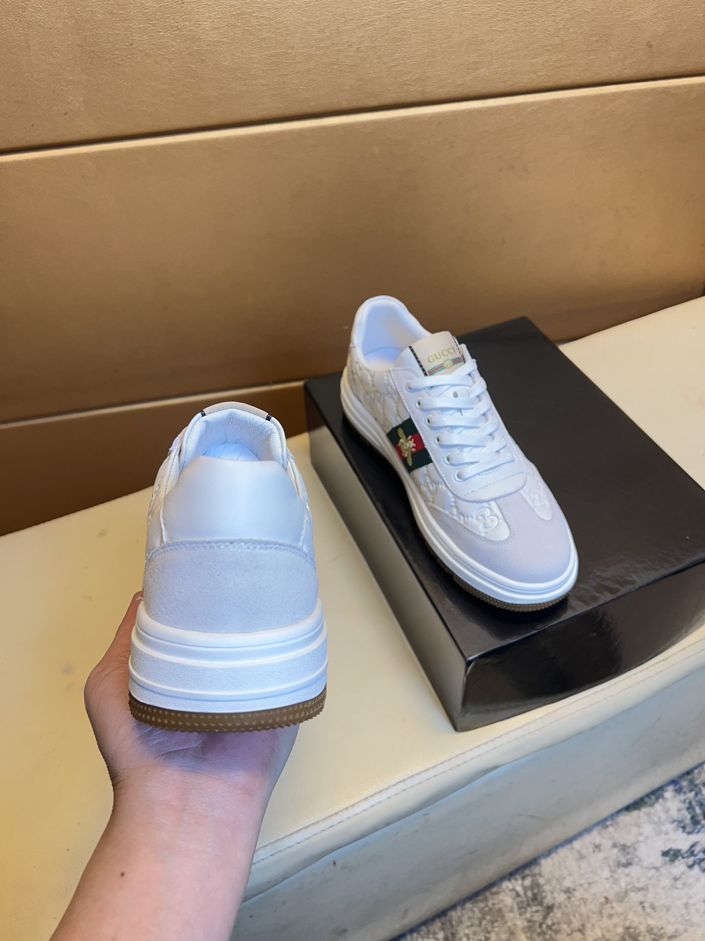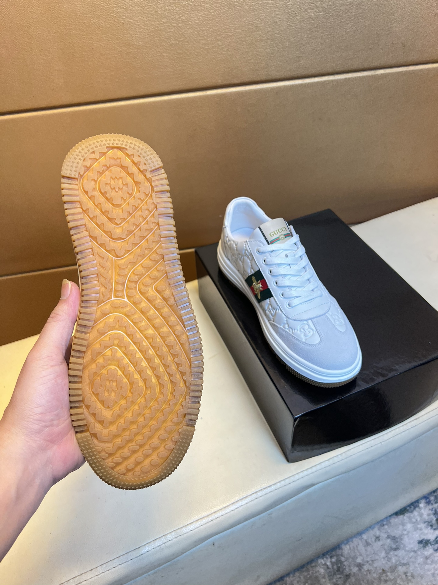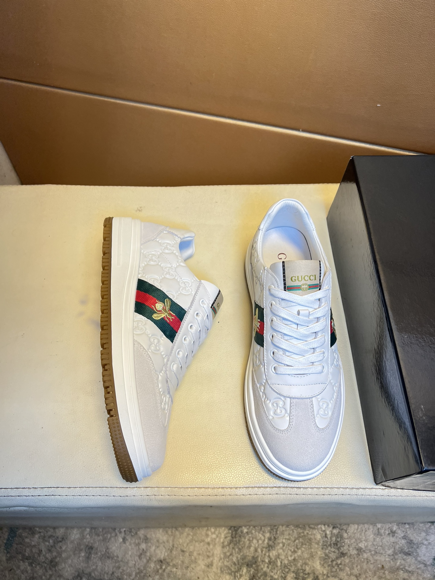 这款鞋子是AAAAA 1:1 质量 (非常棒). 使用了和原版一模一样的材料. 商标部分也保持了和古奇/Gucci一样. 图片拍摄是实物鞋子拍摄, 您所收到的实物保证和我们图片一模一样.