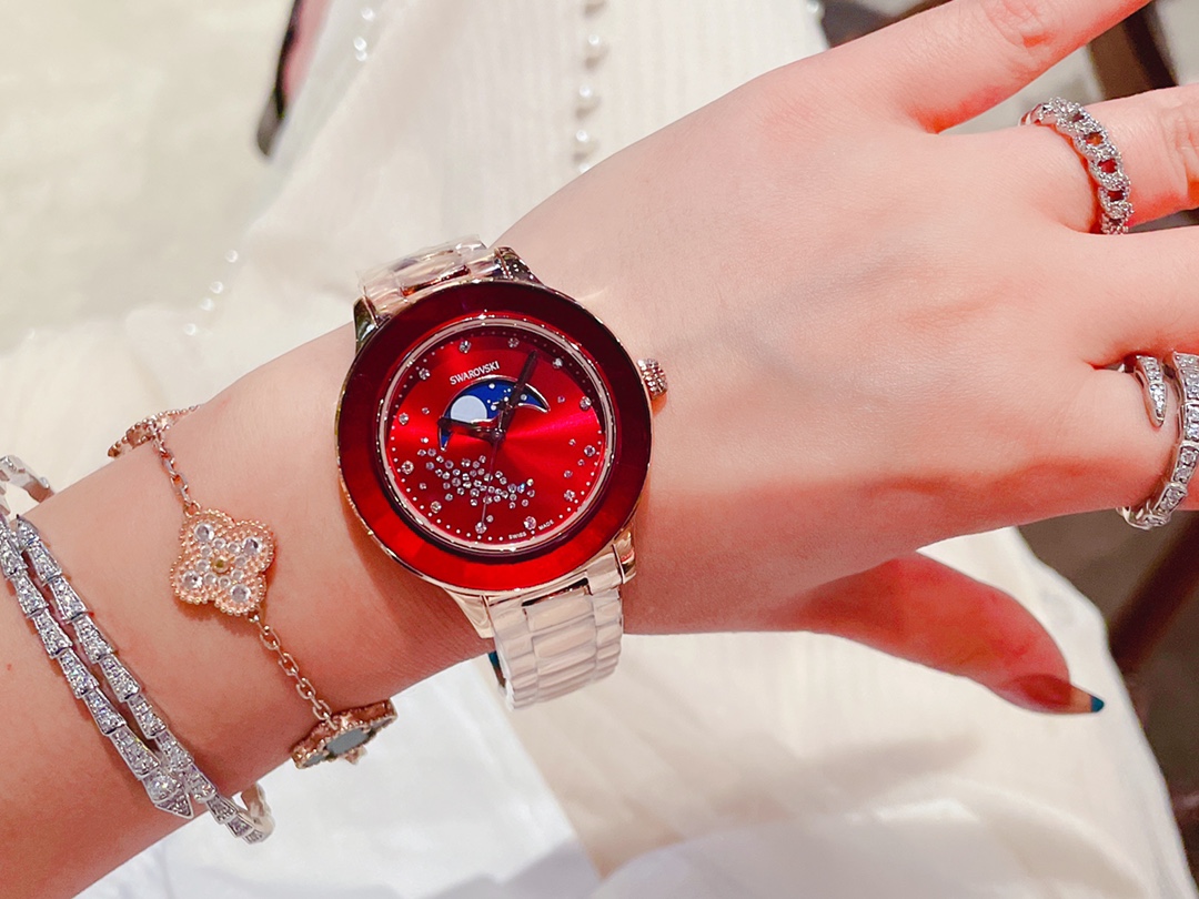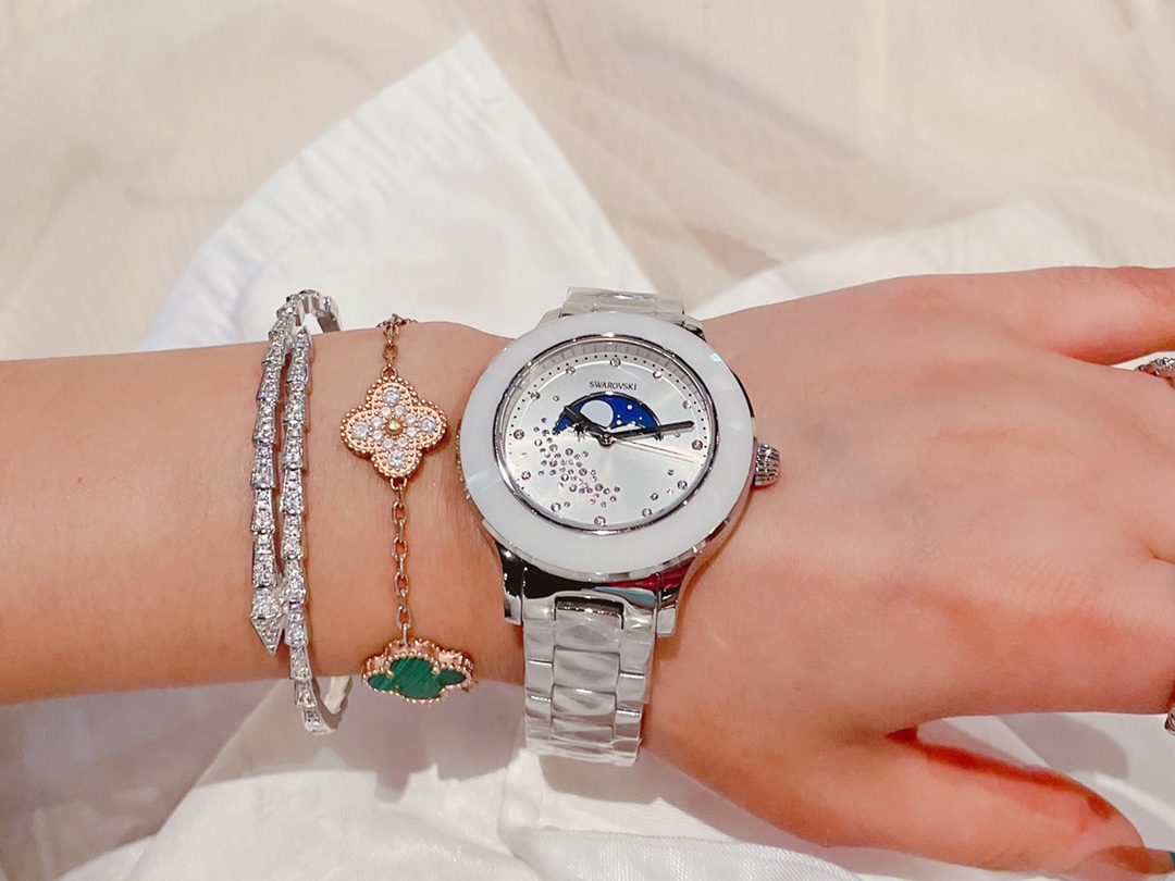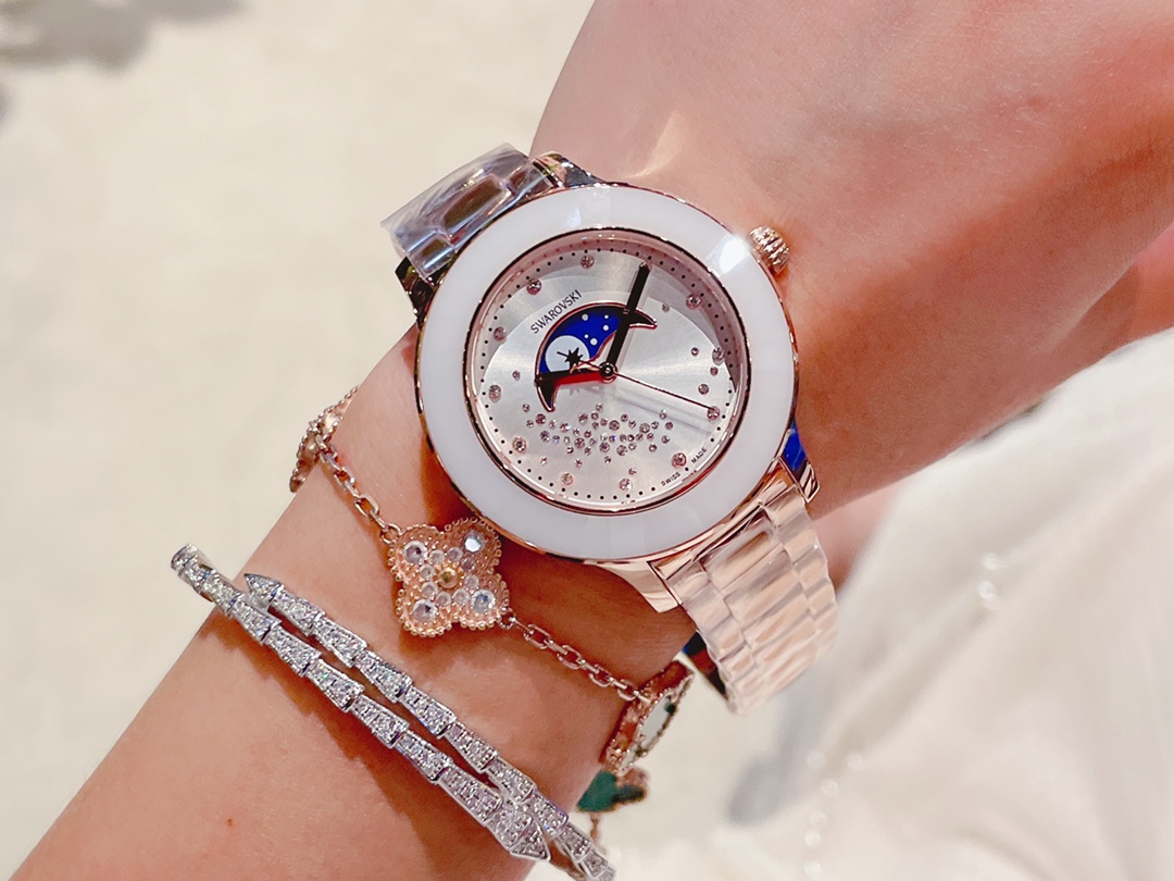 这款手表是AAAAA 1:1 质量 (非常棒). 使用了和原版一模一样的材料. 商标部分也保持了和施华洛世奇/Swarovski一样. 图片拍摄是实物手表拍摄, 您所收到的实物保证和我们图片一模一样.