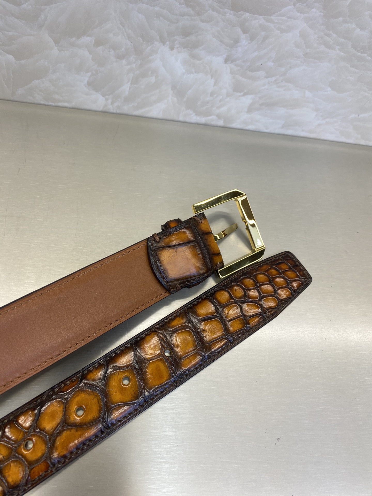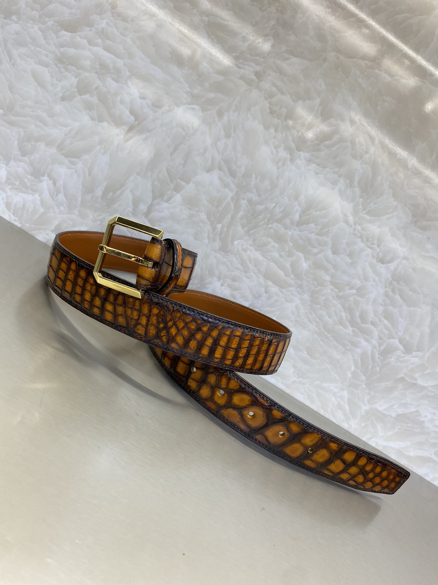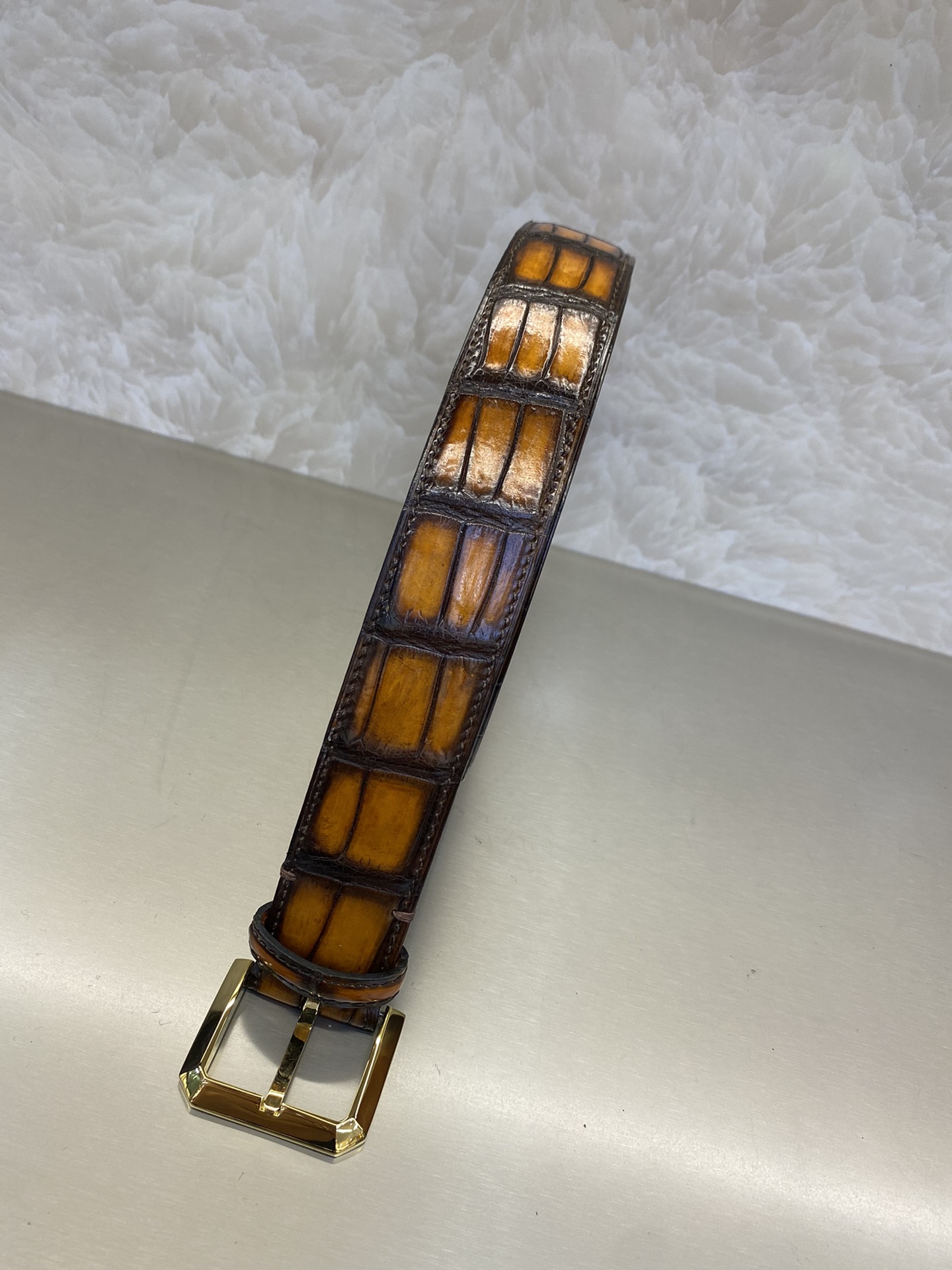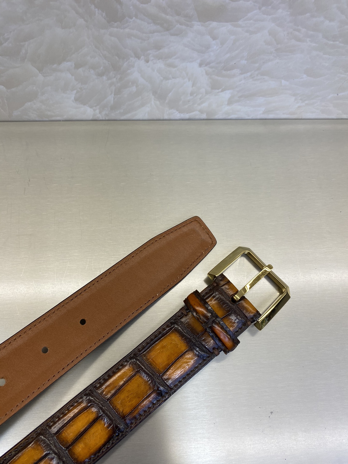这款皮带是AAAAA 1:1 质量 (非常棒). 使用了和原版一模一样的材料. 商标部分也保持了和Berluti一样. 图片拍摄是实物皮带拍摄, 您所收到的实物保证和我们图片一模一样.