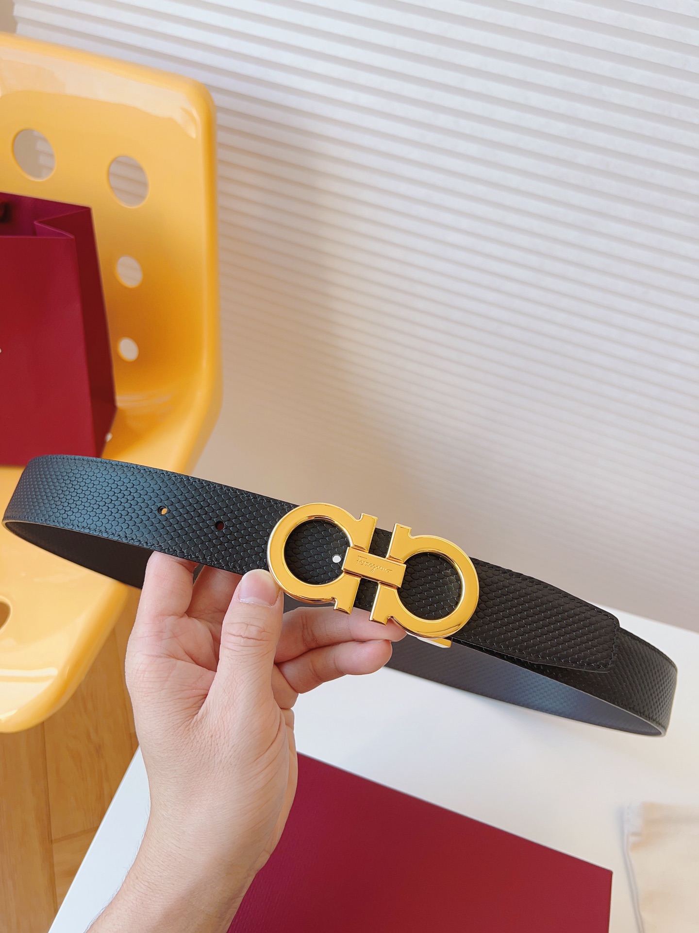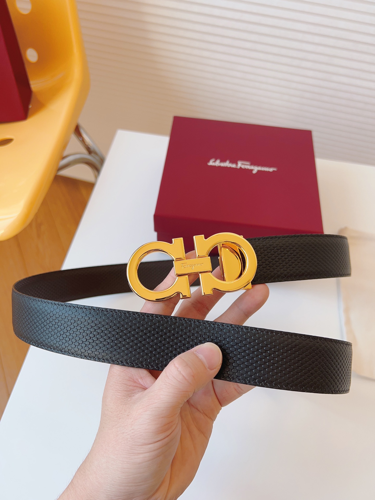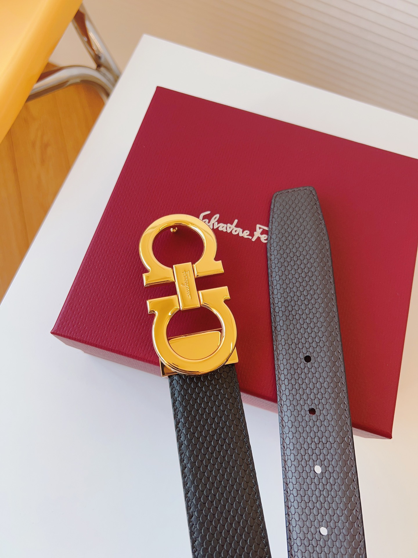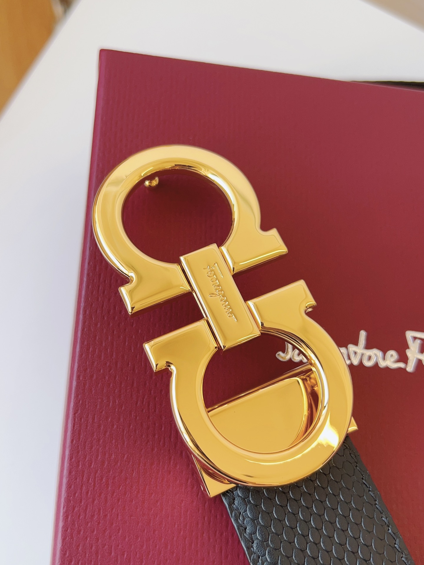 这款皮带是AAAAA 1:1 质量 (非常棒). 使用了和原版一模一样的材料. 商标部分也保持了和菲拉格慕/Salvatore Ferragamo一样. 图片拍摄是实物皮带拍摄, 您所收到的实物保证和我们图片一模一样.