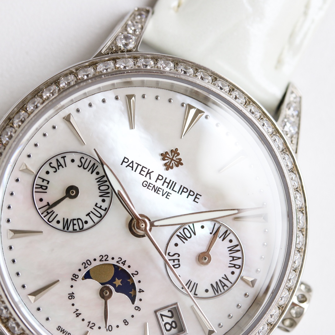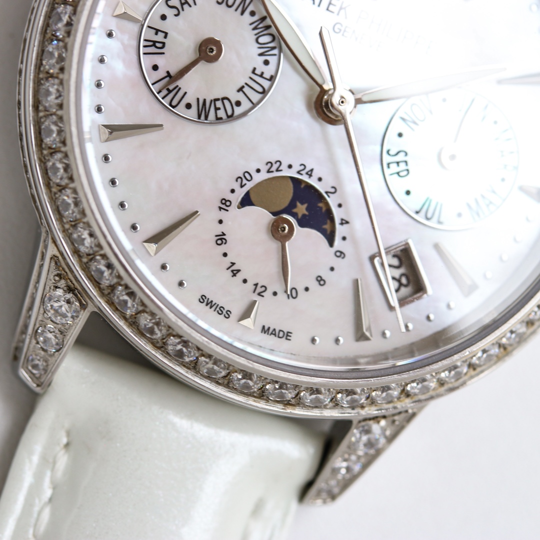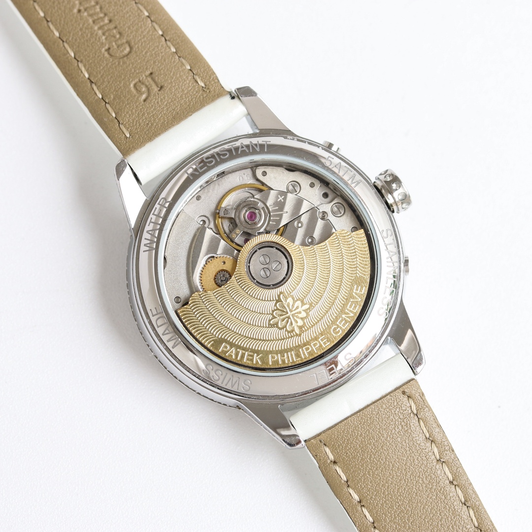 这款手表是AAAAA 1:1 质量 (非常棒). 使用了和原版一模一样的材料. 商标部分也保持了和百达翡丽/Patek Philippe一样. 图片拍摄是实物手表拍摄, 您所收到的实物保证和我们图片一模一样.