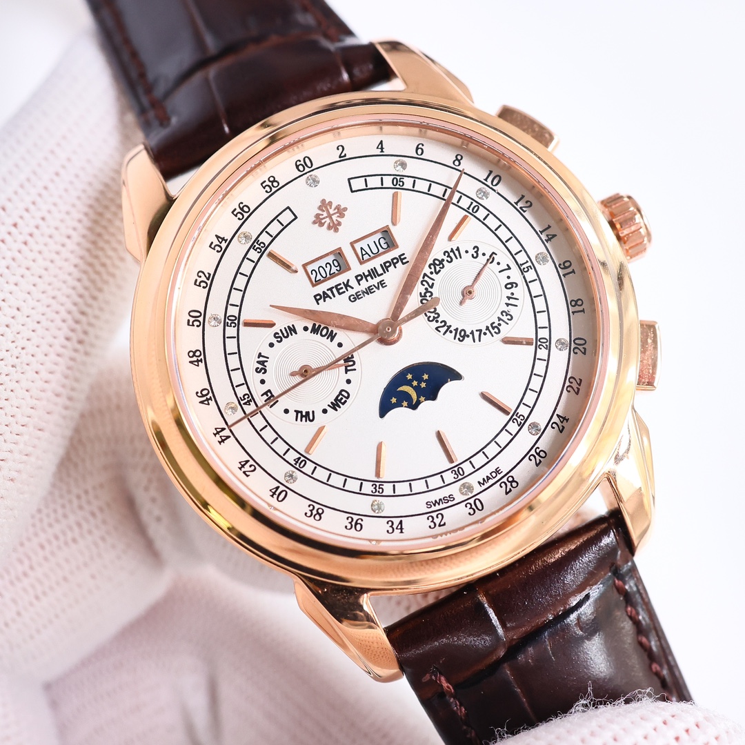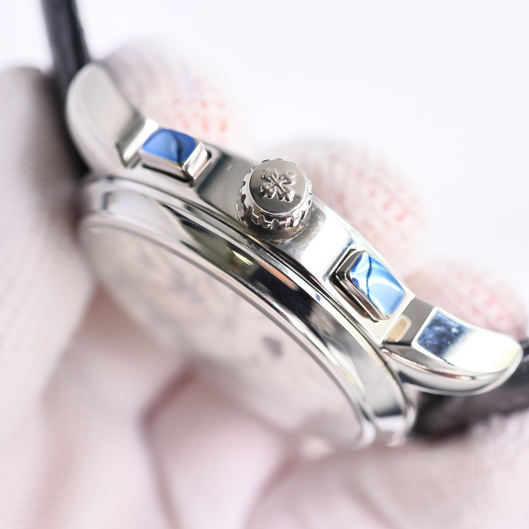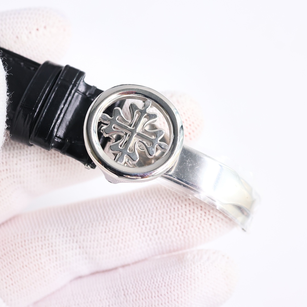 这款手表是AAAAA 1:1 质量 (非常棒). 使用了和原版一模一样的材料. 商标部分也保持了和百达翡丽/Patek Philippe一样. 图片拍摄是实物手表拍摄, 您所收到的实物保证和我们图片一模一样.