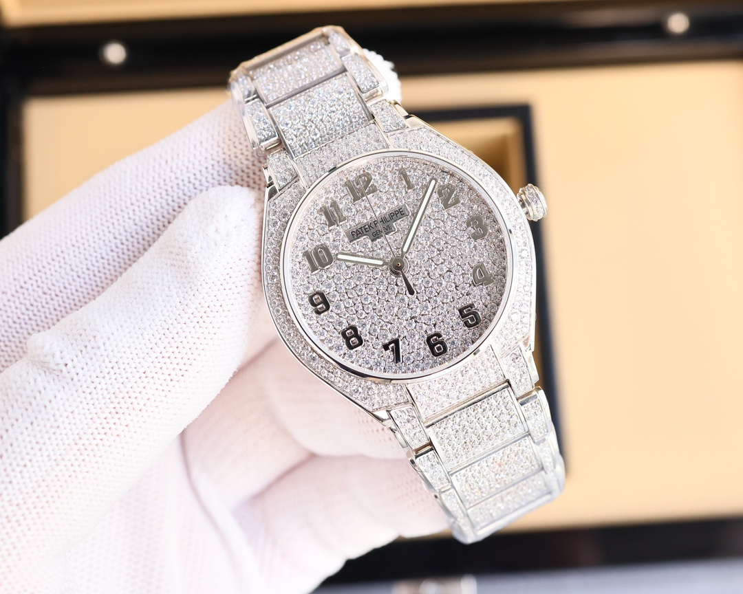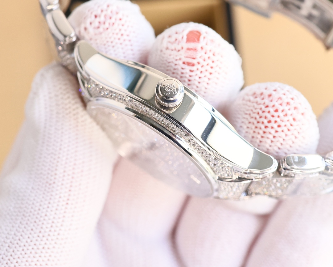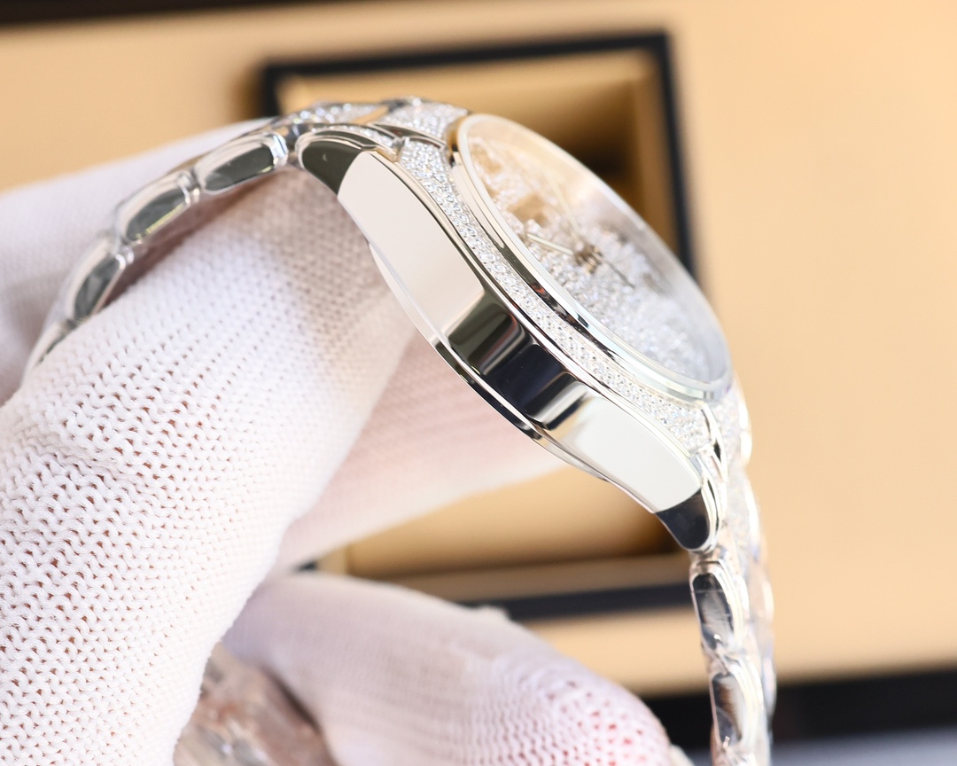 这款手表是AAAAA 1:1 质量 (非常棒). 使用了和原版一模一样的材料. 商标部分也保持了和百达翡丽/Patek Philippe一样. 图片拍摄是实物手表拍摄, 您所收到的实物保证和我们图片一模一样.