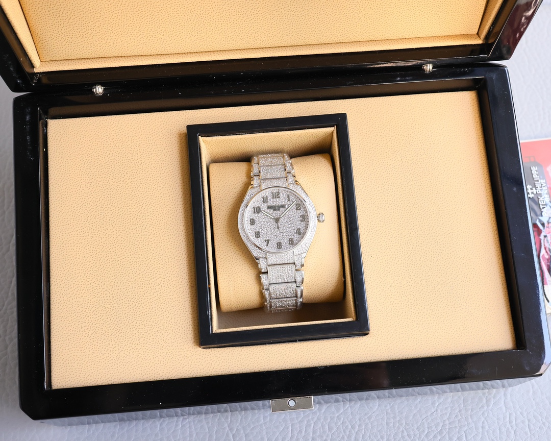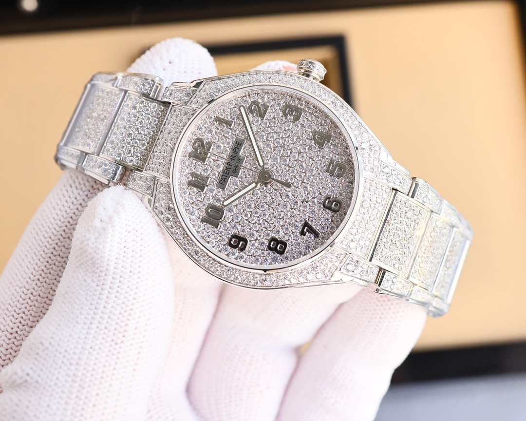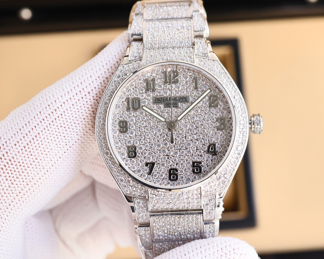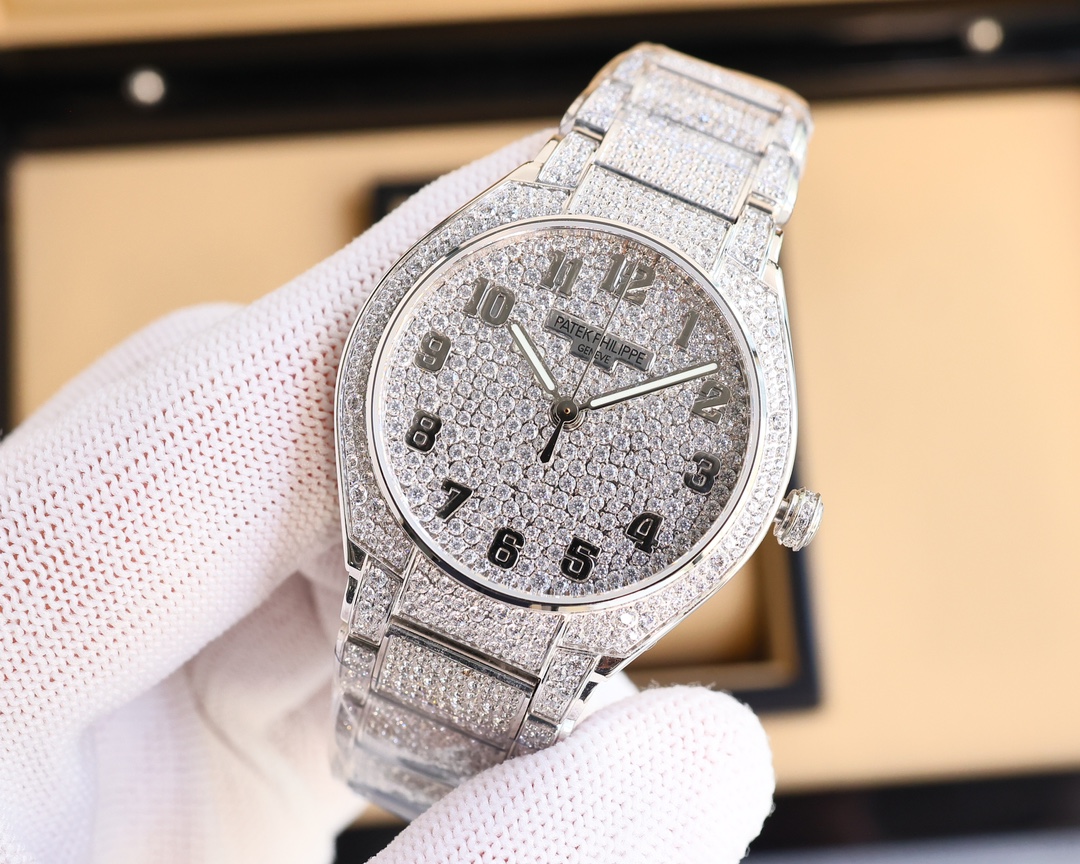 这款手表是AAAAA 1:1 质量 (非常棒). 使用了和原版一模一样的材料. 商标部分也保持了和百达翡丽/Patek Philippe一样. 图片拍摄是实物手表拍摄, 您所收到的实物保证和我们图片一模一样.