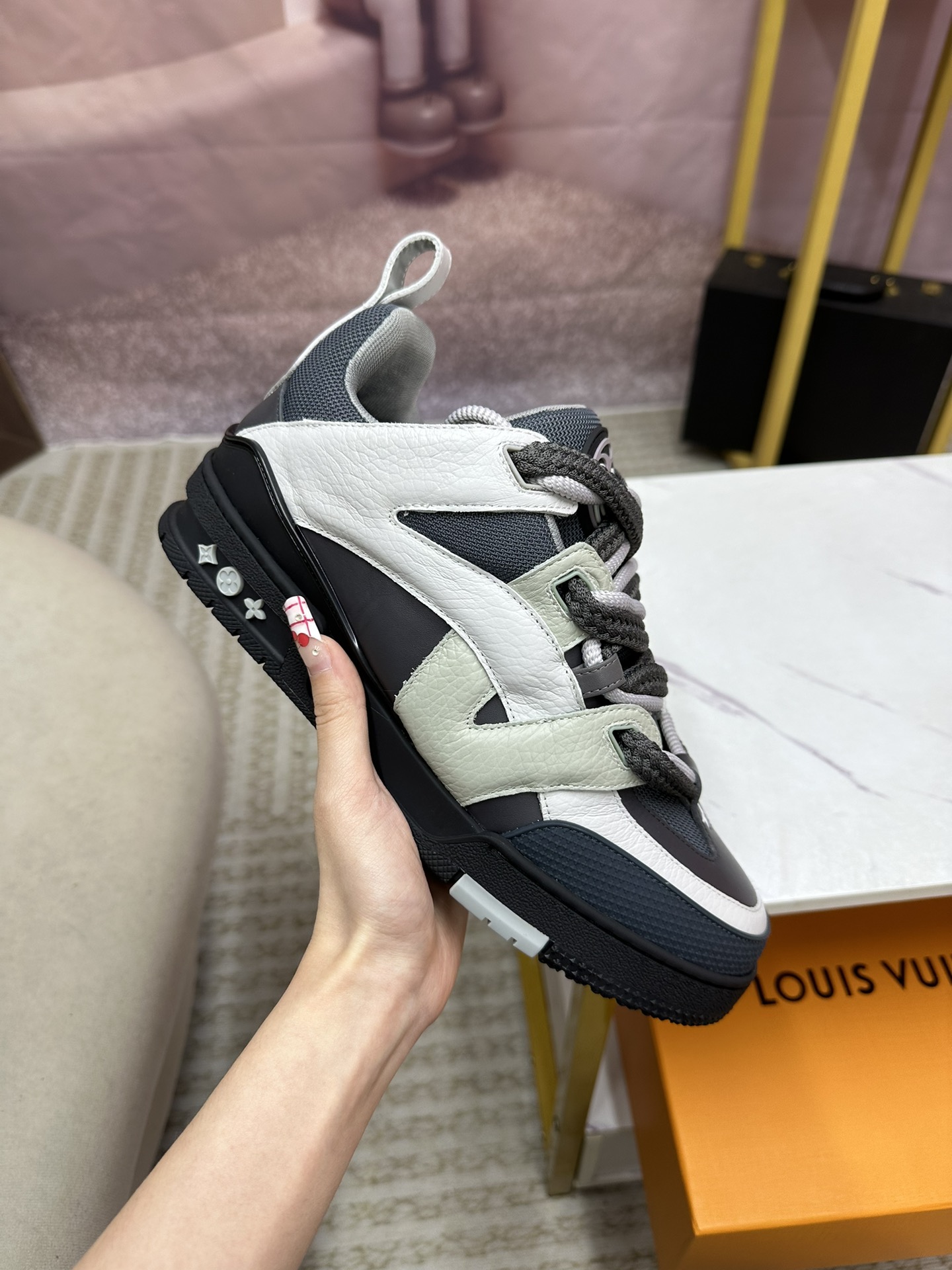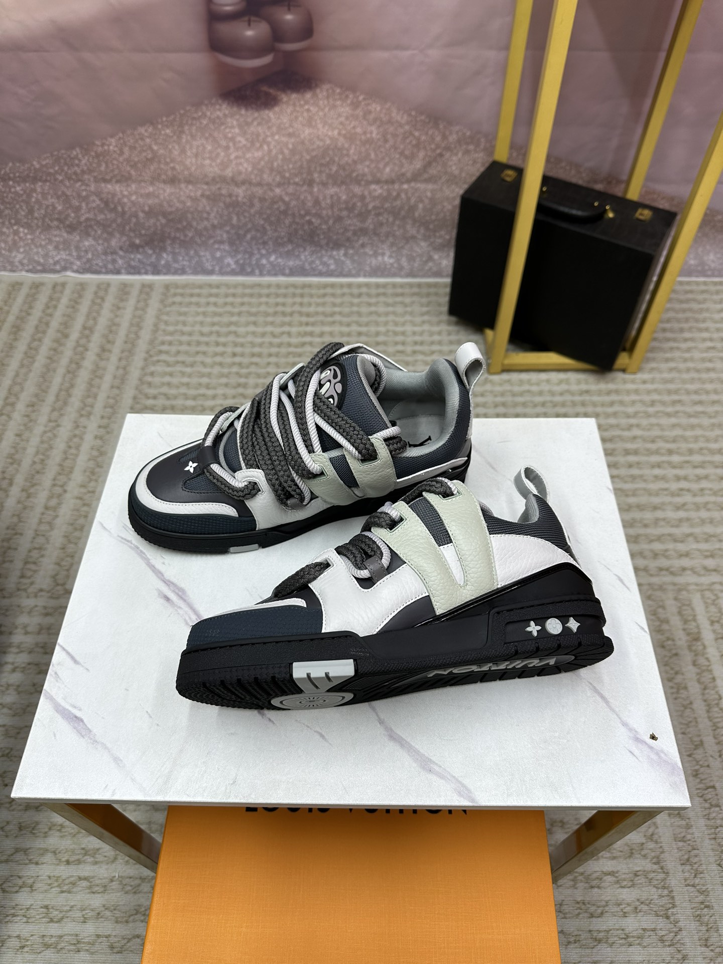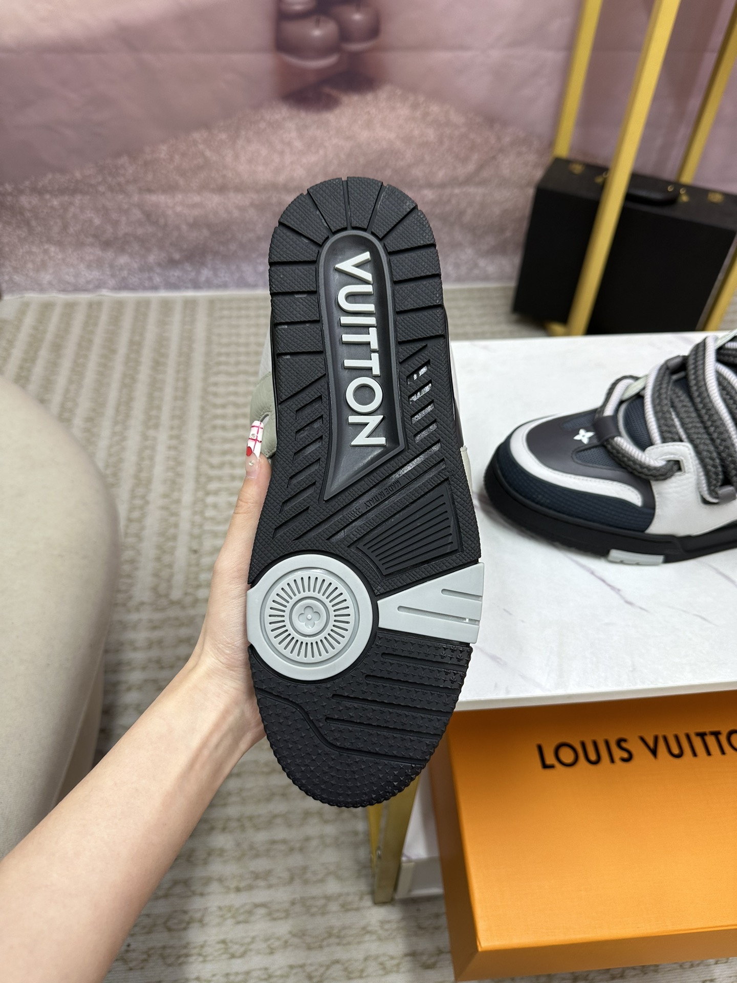 这款鞋子是AAAAA 1:1 质量 (非常棒). 使用了和原版一模一样的材料. 商标部分也保持了和路易威登/Louis Vuitton一样. 图片拍摄是实物鞋子拍摄, 您所收到的实物保证和我们图片一模一样.