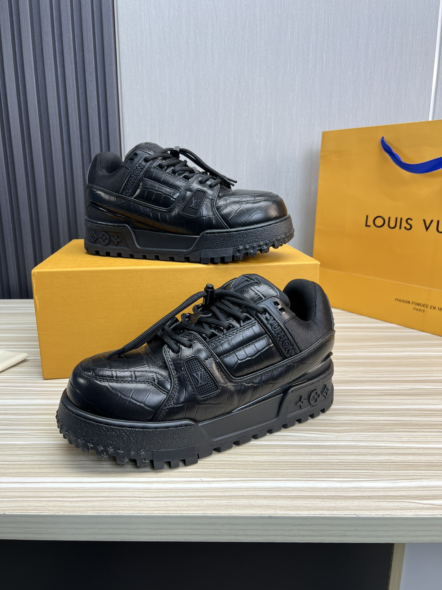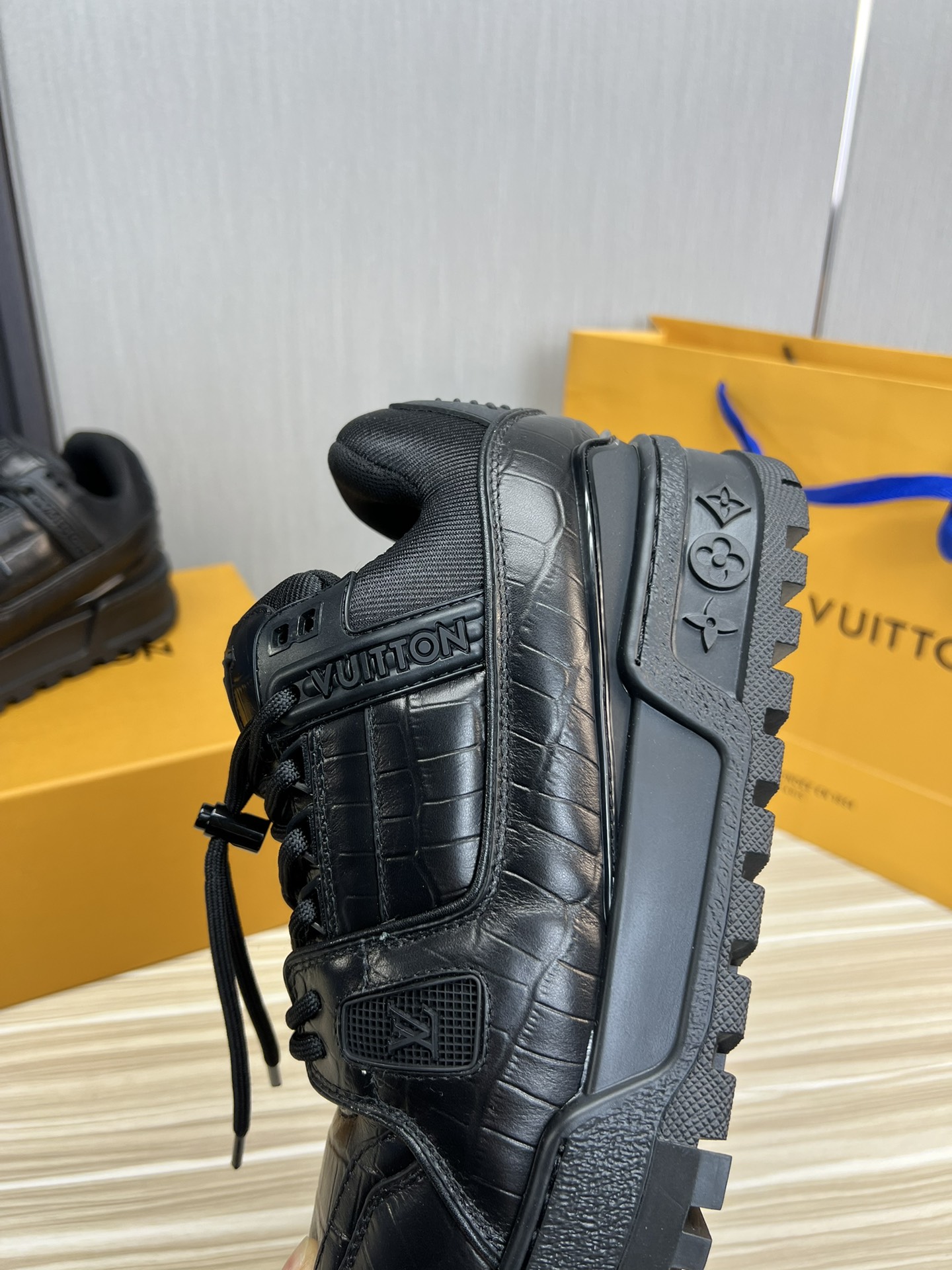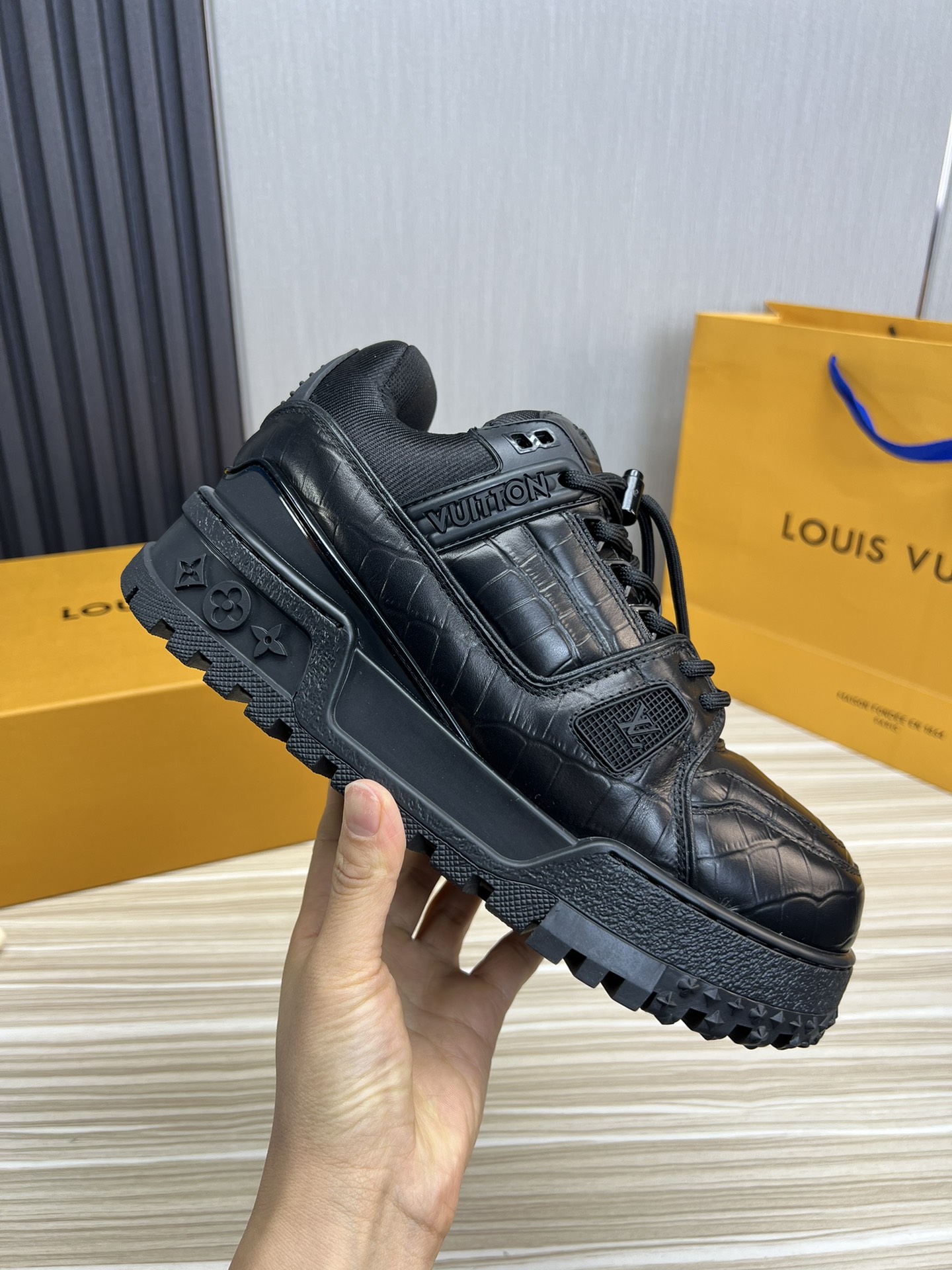 这款鞋子是AAAAA 1:1 质量 (非常棒). 使用了和原版一模一样的材料. 商标部分也保持了和路易威登/Louis Vuitton一样. 图片拍摄是实物鞋子拍摄, 您所收到的实物保证和我们图片一模一样.