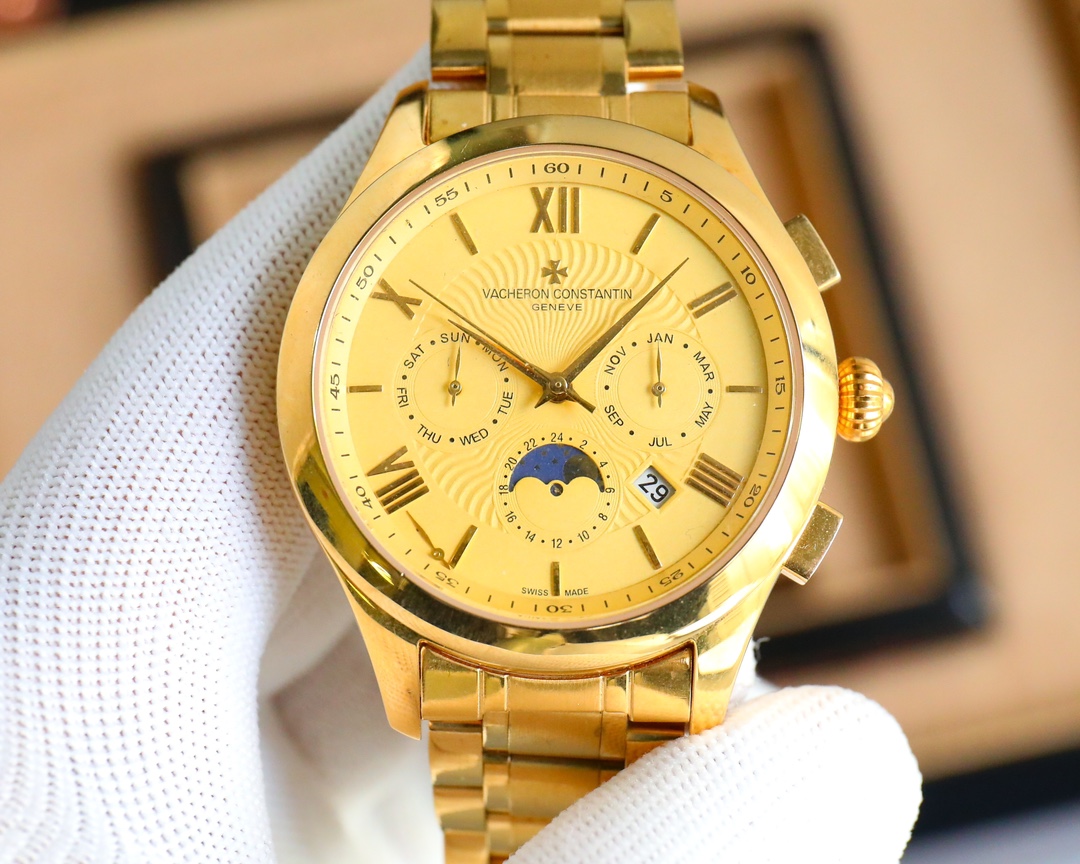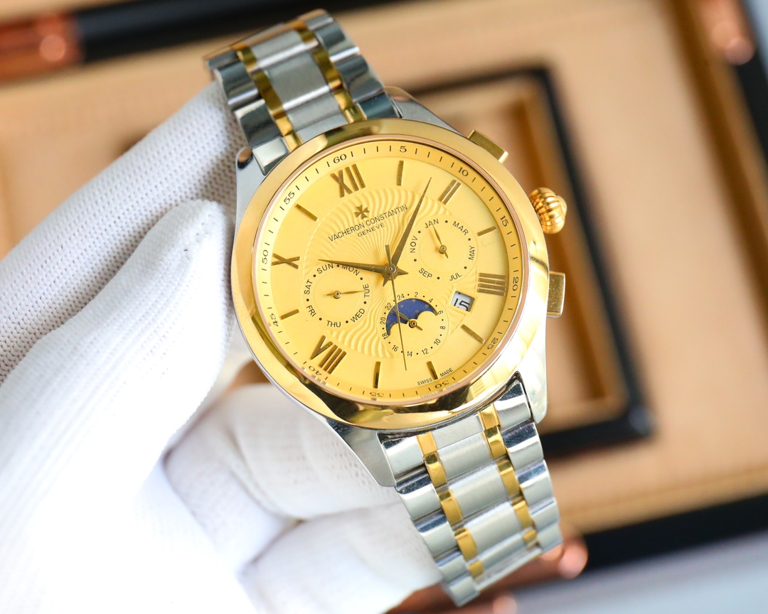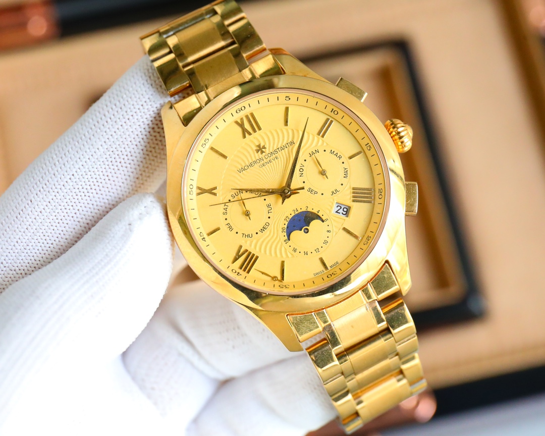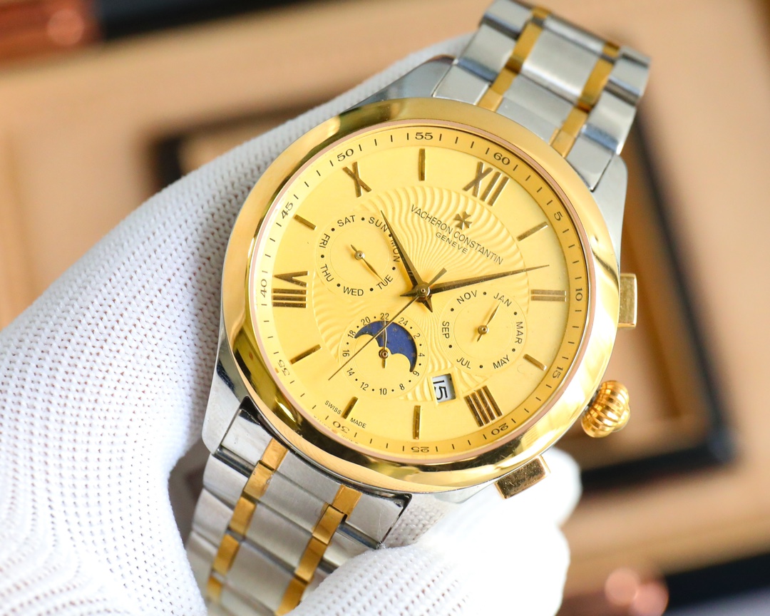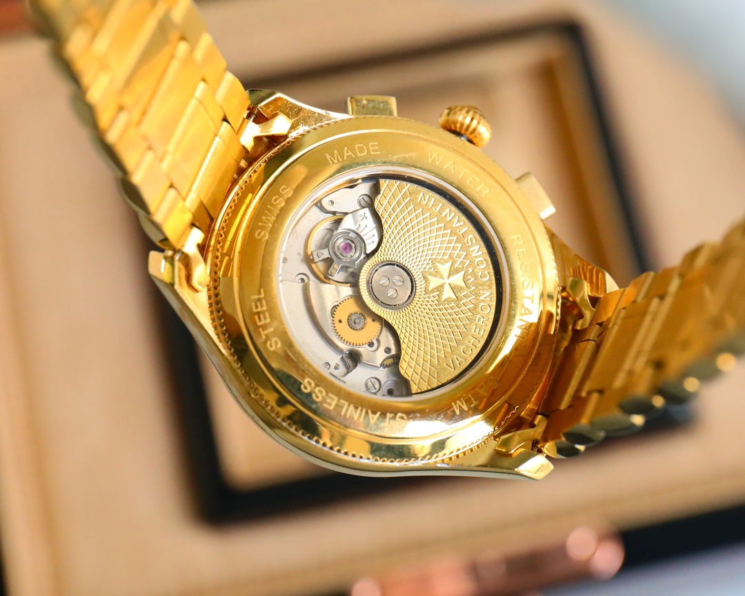 这款手表是AAAAA 1:1 质量 (非常棒). 使用了和原版一模一样的材料. 商标部分也保持了和江诗丹顿/Vacheron Constantin一样. 图片拍摄是实物手表拍摄, 您所收到的实物保证和我们图片一模一样.