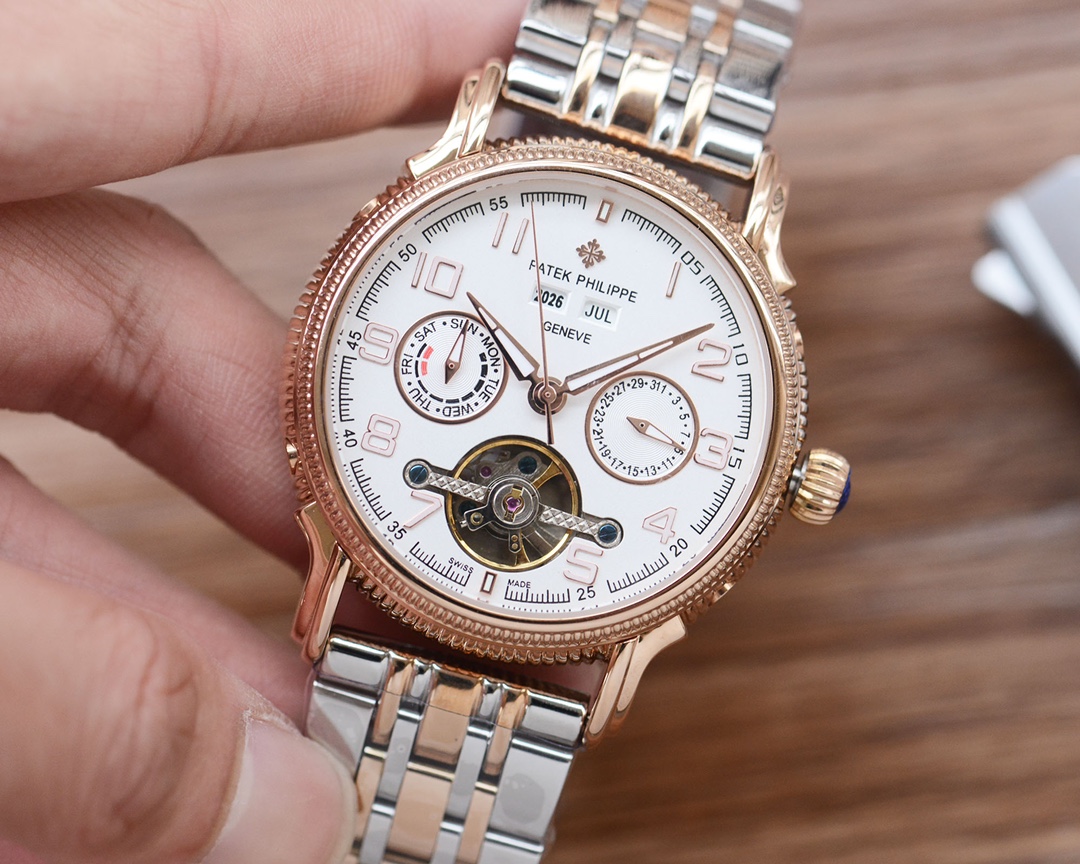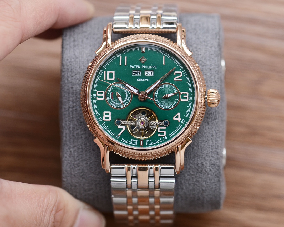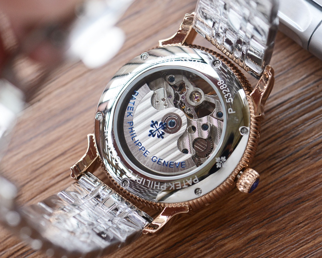 这款手表是AAAAA 1:1 质量 (非常棒). 使用了和原版一模一样的材料. 商标部分也保持了和百达翡丽/Patek Philippe一样. 图片拍摄是实物手表拍摄, 您所收到的实物保证和我们图片一模一样.