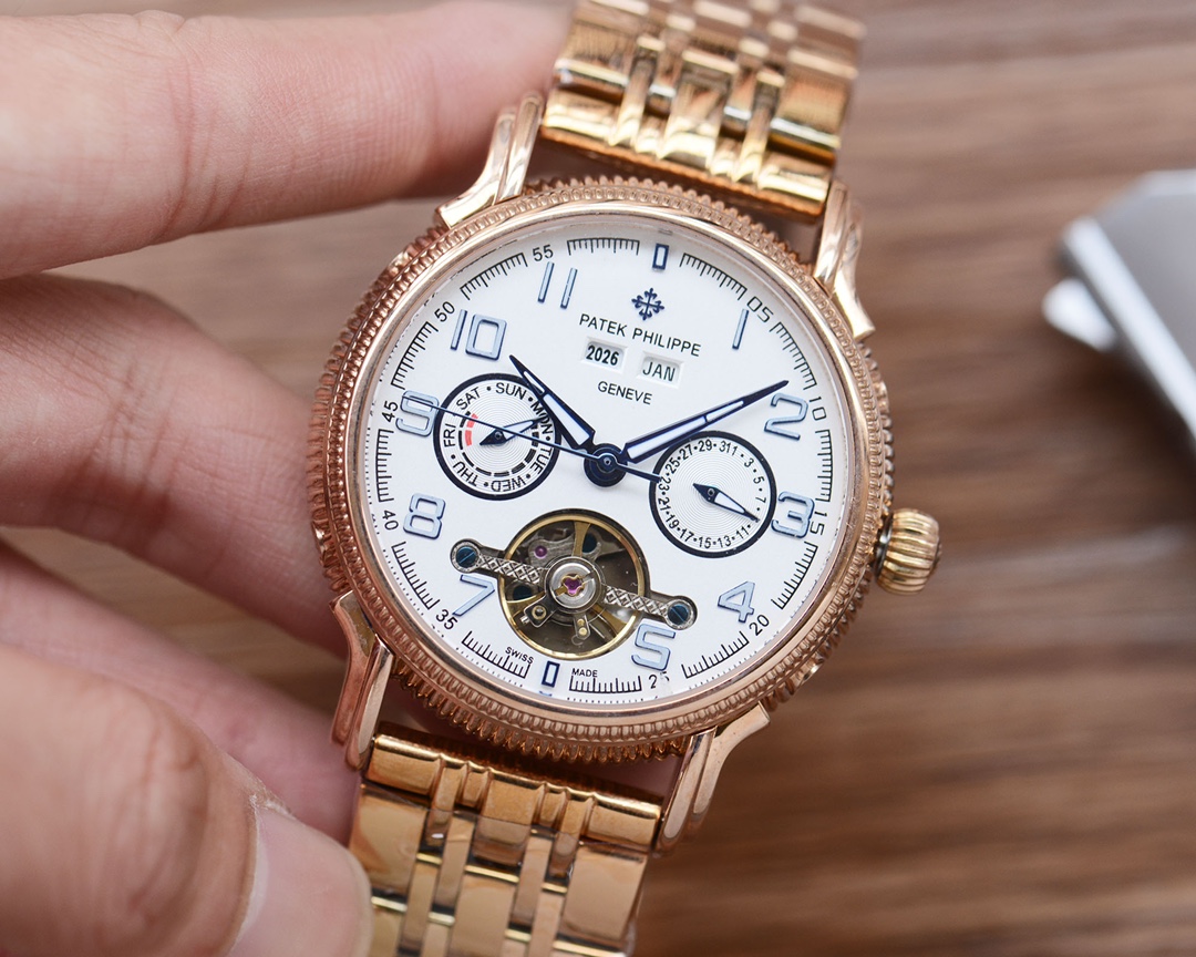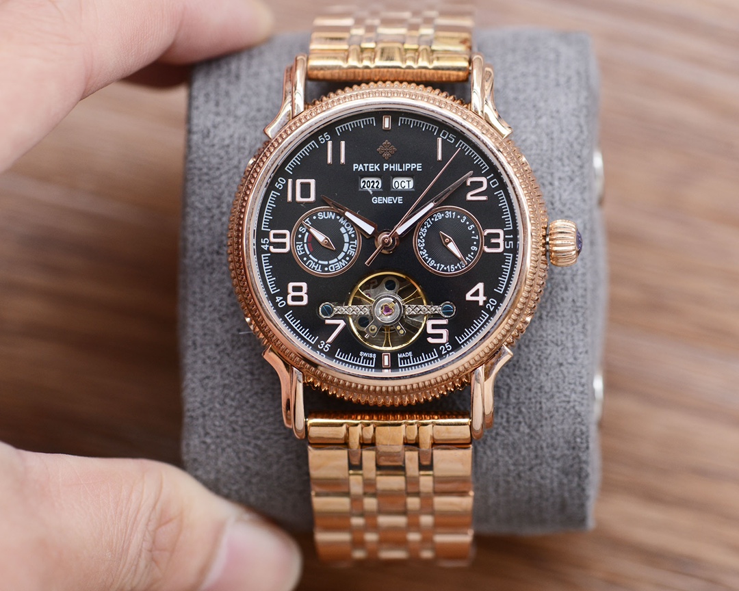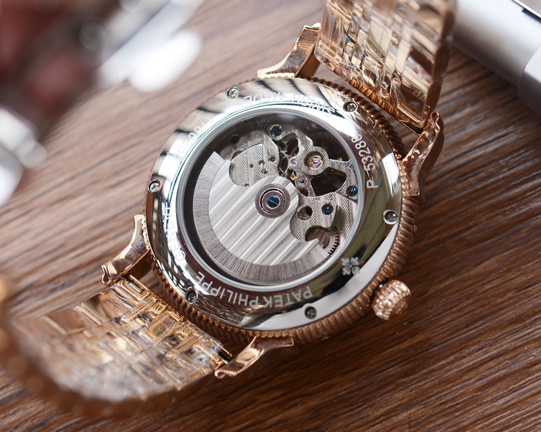 这款手表是AAAAA 1:1 质量 (非常棒). 使用了和原版一模一样的材料. 商标部分也保持了和百达翡丽/Patek Philippe一样. 图片拍摄是实物手表拍摄, 您所收到的实物保证和我们图片一模一样.
