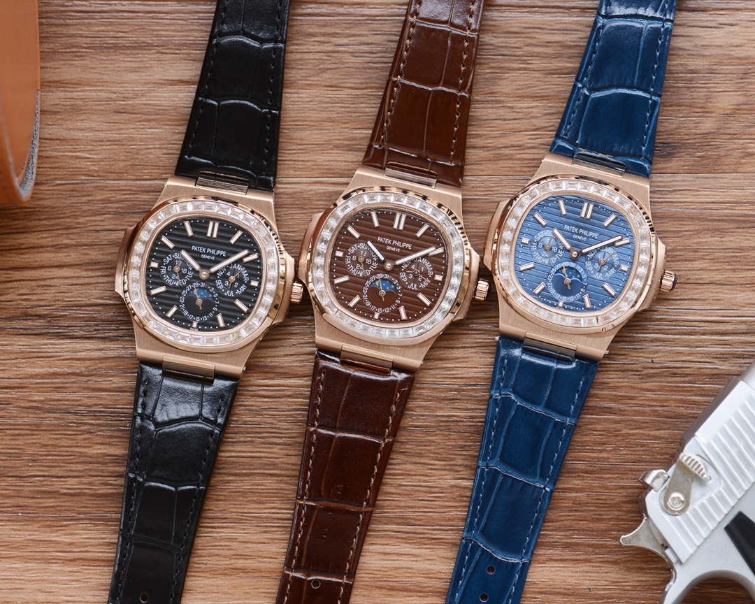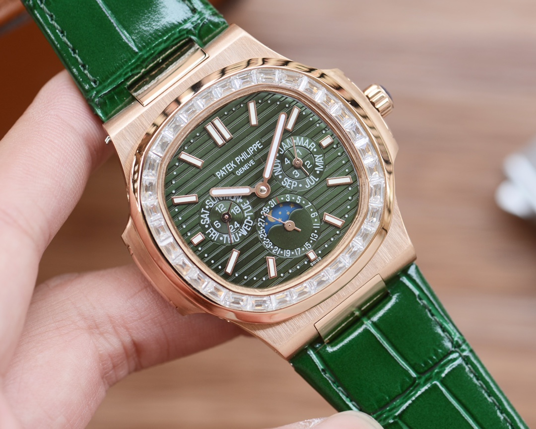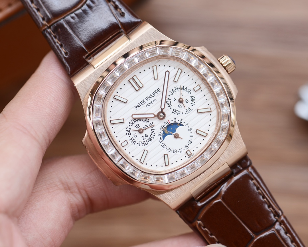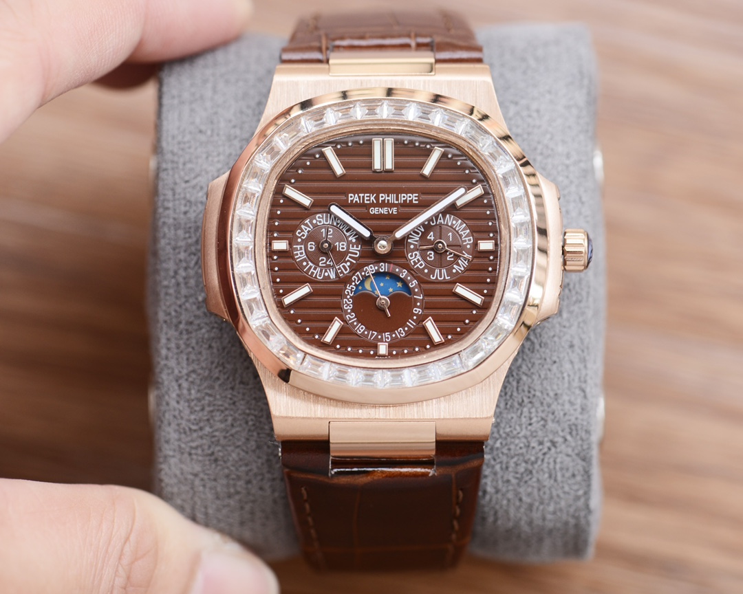 这款手表是AAAAA 1:1 质量 (非常棒). 使用了和原版一模一样的材料. 商标部分也保持了和百达翡丽/Patek Philippe一样. 图片拍摄是实物手表拍摄, 您所收到的实物保证和我们图片一模一样.